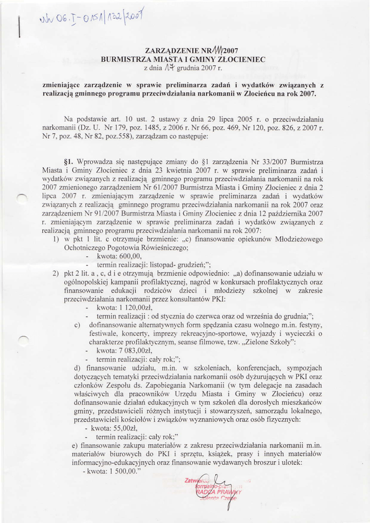 realizacją gminnego programu przeciwdzia|ania narkomanii w Zlocieńcu na rok 2007'
