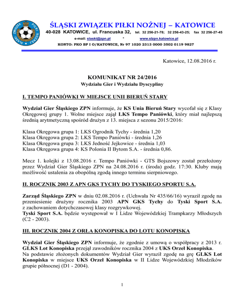 ŚLĄSKI ZWIĄZEK PIŁKI NOŻNEJ – KATOWICE 40-028 KATOWICE, ul. Francuska 32, e-mail: [email protected] * tel. 32 256-21-78; 32 256-43-25; fax 32 256-27-45 www.slzpn.katowice.pl KONTO: PKO BP I O/KATOWICE, Nr 97 1020 2313 0000 3502 0119 9827 Katowice, 12.08.2016 r. KOMUNIKAT NR 24/2016 Wydziału Gier i Wydziału Dyscypliny I. TEMPO PANIÓWKI W MIEJSCE UNII BIERUŃ STARY Wydział Gier Śląskiego ZPN informuje, że KS Unia Bieruń Stary wycofał się z Klasy Okręgowej grupy 1. Wolne miejsce zajął LKS Tempo Paniówki, który miał najlepszą średnią arytmetyczną spośród drużyn z 13. miejsca z sezonu 2015/2016: Klasa Okręgowa grupa 1: LKS Ogrodnik Tychy - średnia 1,20 Klasa Okręgowa grupa 2: LKS Tempo Paniówki - średnia 1,26 Klasa Okręgowa grupa 3: LKS Jedność Jejkowice - średnia 1,03 Klasa Okręgowa grupa 4: KS Polonia II Bytom S.A. - średnia 0,86. Mecz 1. kolejki z 13.08.2016 r. Tempo Paniówki - GTS Bojszowy został przełożony przez Wydział Gier Śląskiego ZPN na 24.08.2016 r. (środa) godz. 17:30. Kluby mają możliwość ustalenia za obopólną zgodą innego terminu sierpniowego. II. ROCZNIK 2003 Z APN GKS TYCHY DO TYSKIEGO SPORTU S.A. Zarząd Śląskiego ZPN w dniu 02.08.2016 r. (Uchwała Nr 435/66/16) wyraził zgodę na przeniesienie drużyny rocznika 2003 APN GKS Tychy do Tyski Sport S.A. z zachowaniem dotychczasowej klasy rozgrywkowej. Tyski Sport S.A. będzie występował w I Lidze Wojewódzkiej Trampkarzy Młodszych (C2 - 2003). III. ROCZNIK 2004 Z ORŁA KONOPISKA DO LOTU KONOPISKA Wydział Gier Śląskiego ZPN informuje, że zgodnie z umową o współpracy z 2013 r. GLKS Lot Konopiska przejął zawodników rocznika 2004 z UKS Orzeł Konopiska. Na podstawie złożonych dokumentów Wydział Gier wyraził zgodę na grę GLKS Lot Konopiska w miejsce UKS Orzeł Konopiska w II Lidze Wojewódzkiej Młodzików grupie północnej (D1 - 2004). 1 IV. TERMINY I MIEJSCA ZAWODÓW PUCHAR POLSKI KOBIET 1. Wydział Gier wyraża zgodę na zmianę terminu meczu Pucharu Polski Gimnazjum Istebna – ISD-AJD Częstochowa z 31.08.2016 na dzień 24.08.2016 godz. 17:00. Zmiana nastąpiła na wniosek UKS Gimnazjum Istebna i została zaakceptowana przez drużynę przeciwną. 2. GKS GieKSa Katowice S.A. informuje, że mecz Pucharu Polski GKS Katowice – LKS Goczałkowice odbędzie się w dniu 22.08.2016 o godz. 18:30 * na boisku „Kolejarz” przy ul. Alfreda 1 w Katowicach. * Na zmianę terminu z 31.08.2016 na 22.08.2016 należy uzyskać pisemną zgodę przeciwnika. II LIGA KOBIET GRUPA ŚLĄSKA 1. TS Mitech Żywiec informuje, że mecz o mistrzostwo II ligi kobiet grupy śląskiej Mitech Żywiec – Rolnik II Biedrzychowice odbędzie się w dniu 27.08.2016 o godz. 11:00 na boisku w Wieprzu koło Żywca ul. Nad Sołą. 2. MKS Miedź Legnica S.A. informuje, że mecze o mistrzostwo II ligi kobiet grupy śląskiej w rundzie jesiennej sezonu 2016/2017, w których jest gospodarzem, będzie rozgrywać w następujących terminach: Legnica ul. Świerkowa: 27.08.2016 godz. 16:00 Miedź - KS SWD Wodzisław Śląski 03.09.2016 godz. 16:00 Miedź - LKS Polonia Prószków 17.09.2016 godz. 14:00 Miedź - KS Darbor Bolesławice 01.10.2016 godz. 14:00 Miedź - GKS GieKSa Katowice S.A. 15.10.2016 godz. 15:00 Miedź - LZS Pakosławice Legnica ul. Hetmańska: 29.10.2016 godz. 12:00 Miedź - LKS Rolnik II Biedrzychowice III LIGA KOBIET GRUPA 1 ŚLĄSKA 1. KS Górnik Bobrowniki Śląskie informuje, że mecze o mistrzostwo III ligi kobiet grupy 1 śląskiej w rundzie jesiennej sezonu 2016/2017, w których jest gospodarzem, będzie rozgrywać na boisku przy ul. Piotra Skargi 15 w Tarnowskich Górach Bobrownikach Śląskich w następujących terminach: 2 04.09.2016 godz. 15:00 Górnik - UKS Jaskółki Chorzów * 25.09.2016 godz. 15:00 Górnik - JSP Warta Zawiercie ** 23.10.2016 godz. 15:00 Górnik - UKKS Katowice 06.11.2016 godz. 13:00 Górnik - ISD-AJD II Częstochowa * Na zmianę terminu z 03.09.2016 na 04.09.2016 należy uzyskać pisemną zgodę przeciwnika. ** Na zmianę terminu z 24.09.2016 na 25.09.2016 należy uzyskać pisemną zgodę przeciwnika. IV LIGA GRUPA 1 1. LKS Nadwiślan Góra informuje, że mecze o mistrzostwo IV ligi grupy 1 w rundzie jesiennej sezonu 2016/2017, w których jest gospodarzem, będzie rozgrywać na stadionie im. J. Waliczka w Górze przy ul. Rybackiej 4 w następujących terminach: 21.08.2016 godz. 17:00 Nadwiślan - KS Ruch Radzionków 31.08.2016 godz. 17:00 Nadwiślan - BKS Sarmacja Będzin * 11.09.2016 godz. 17:00 Nadwiślan - LKS Przemsza Siewierz ** 25.09.2016 godz. 16:00 Nadwiślan - KP Warta Zawiercie 09.10.2016 godz. 16:00 Nadwiślan - KS Slavia Ruda Śląska *** 23.10.2016 godz. 15:00 Nadwiślan - RKS Grodziec 06.11.2016 godz. 14:00 Nadwiślan - MKS Myszków 20.11.2016 godz. 13:00 Nadwiślan - Ruch II Chorzów S.A. * Mecz w dniu 31.08.2016 należy rozegrać zgodnie z terminarzem o godz. 17:30 lub uzyskać pisemną zgodę przeciwnika na godz. 17:00. ** Mecz w dniu 11.09.2016 należy rozpocząć najpóźniej o godz. 16:30. *** Mecz w dniu 09.10.2016 należy rozpocząć najpóźniej o godz. 15:30. 2. BKS Sarmacja Będzin informuje, że mecz o mistrzostwo IV ligi grupy 1 Sarmacja Będzin – Piast II Gliwice odbędzie się w dniu 27.08.2016 o godz. 11:00. 3. TS Gwarek Tarnowskie Góry informuje, że mecze o mistrzostwo IV ligi grupy 1 w rundzie jesiennej sezonu 2016/2017, w których jest gospodarzem, będzie rozgrywać na obiekcie TS Gwarek w Tarnowskich Górach przy ul. Wojska Polskiego 2 3 w następujących terminach: 17.08.2016 godz. 18:00 Gwarek - MKS Myszków 27.08.2016 godz. 17:00 Gwarek - LKS Nadwiślan Góra 03.09.2016 godz. 16:00 Gwarek - RKS Raków II Częstochowa S.A. 24.09.2016 godz. 16:00 Gwarek - BKS Sarmacja Będzin 08.10.2016 godz. 15:00 Gwarek - LKS Przemsza Siewierz 22.10.2016 godz. 15:00 Gwarek - KP Warta Zawiercie 05.11.2016 godz. 13:00 Gwarek - KS Slavia Ruda Śląska 19.11.2016 godz. 13:00 Gwarek - RKS Grodziec IV LIGA GRUPA 2 1. JSP Szczakowi