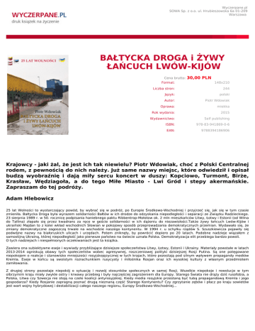 Wyczerpane.pl SOWA Sp. z o.o. ul. Hrubieszowska 6a 01-209 Warszawa BAŁTYCKA DROGA i ŻYWY ŁAŃCUCH LWÓW-KIJÓW Cena brutto: Format: 30,00 PLN 148x210 Liczba stron: 244 Język: polski Autor: Piotr Wdowiak Oprawa: miekka Rok wydania: 2015 Wydawnictwo: Self publishing ISBN: 978-83-941869-0-6 EAN: 9788394186906 Krajowcy - jaki żal, że jest ich tak niewielu? Piotr Wdowiak, choć z Polski Centralnej rodem, z pewnością do nich należy. Już same nazwy miejsc, które odwiedził i opisał budzą wyobraźnię i dają miły sercu koncert w duszy: Kopciowo, Turmont, Birże, Krasław, Wędziagoła, a do tego Miłe Miasto - Lwi Gród i stepy akermańskie. Zapraszam do tej podróży. Adam Hlebowicz 25 lat Wolności to wystarczający powód, by wybrać się w podróż, po Europie Środkowo-Wschodniej i przyjrzeć się, jak się w tym czasie zmieniła. Bałtycka Droga była wyrazem solidarności Bałtów w ich drodze do odzyskania niepodległości i separacji ze Związku Radzieckiego. 23 sierpnia 1989 r. w 50. rocznicę podpisania haniebnego paktu Ribbentrop-Mołotow ok. 2 mln mieszkańców Litwy, Łotwy i Estonii (od Wilna do Tallina) złapało się przez kwadrans za ręce w geście solidarności w ich dążeniu do niezawisłości.Także żywy łańcuch Lwów-Kijów i ukraiński Majdan to z kolei wkład wschodnich Słowian w pokojowy sposób przeprowadzania demokratycznych przemian. Wydawało się, że zmiany demokratyczne zagoszczą trwale na wschodzie naszego kontynentu. W 1994 r. u schyłku rządów S. Szuszkiewicza pojawiły się podwójne nazwy na białoruskich ulicach i urzędach. Potem zniknęły, by powrócić dopiero po 20 latach. Podobne nadzieje wiązałem z samostijną Ukrainą, której niepodległość jako pierwsze państwo na świecie uznała Polska. Demokratyzacja elit przebiega bardzo powoli. O tych nadziejach i niespełnionych oczekiwaniach jest ta książka. Zawiera ona subiektywne eseje i wywiady przybliżające dzisiejsze społeczeństwa Litwy, Łotwy, Estonii i Ukrainy. Materiały powstałe w latach 2013-2014 ogniskują obawy tych społeczeństw wobec agresywnej, roszczeniowej polityki dzisiejszej Rosji Putina. Są one potęgowane niepokojem o reakcje i stanowisko mniejszości rosyjskojęzycznej w tych krajach, które pozostają pod silnym wpływem propagandy mediów Kremla. Eseje w końcu są swoistym rozrachunkiem rusycysty i miłośnika Rosjan oraz ich wysokiej kultury z własnym przedmiotem zamiłowania. Z drugiej strony pozostaje niepokój o sytuację i rozwój stosunków społecznych w samej Rosji. Wszelkie niepokoje i rewolucje w tym olbrzymim kraju miały zwykle ostry i krwawy przebieg i były najczęściej zagrożeniem dla Europy. Starego Świata nie drąży dziś rusofobia, a Polska, Litwa czy Szwecja nie stoją na czele koalicji antyrosyjskiej. Kiedy media rosyjskie przestaną być tubą propagandową Kremla i jego gospodarza? Kiedy Rosjanie zapragną poznać drugą nieznaną część Starego Kontynentu? Czy zgrzytanie zębów i płacz po kraju sowietów jest wart wojny hybrydowej i destabilizacji całego naszego regionu, Europy Środkowo-Wschodniej...