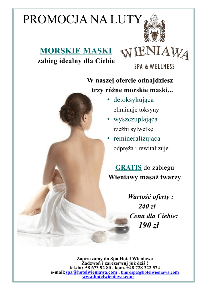 PROMOCJA NA LUTY MORSKIE MASKI zabieg idealny dla Ciebie W naszej ofercie odnajdziesz trzy różne morskie maski... • detoksykująca eliminuje toksyny • wyszczuplająca rzeźbi sylwetkę • remineralizująca odpręża i rewitalizuje GRATIS do zabiegu Wieniawy masaż twarzy Wartość oferty : 240 zł Cena dla Ciebie: 190 zł Zapraszamy do Spa Hotel Wieniawa Zadzwoń i zarezerwuj już dziś ! tel./fax 58 673 92 80 , kom. +48 728 322 524 e-mail:[email protected] , [email protected] www.hotelwieniawa.com