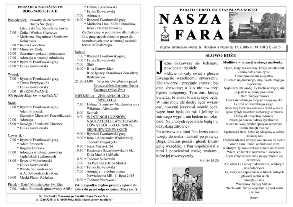PORZĄDEK NABOŻEŃSTW 18.05.-24.05.2015 A.D. Poniedziałek – czwarty dzień Nowenny do Ducha Świętego Litania do Św. Stanisława Kostki 7.00 † Zofia i Wacław Giersztyn † Marianna, Eugeniusz i Stanisław Kołakowski 7.00 † Iwona Ciesielska 7.30 † Mirosław Duda 16.00 Sakrament pokuty i pojednania 17.00 Adoracja w intencji młodzieży 18.00 † Ryszard Tworkowski-greg. 18.00 † Feliks Kowalewski Wtorek 7.00 † Ryszard Tworkowski-greg. † Teresa Przybysz (8) † Feliks Kowalewski 17.00 BIERZMOWANIE Nie będzie Mszy św. w szpitalu!!! † Halina Łobaszewska † Feliks Kowalewski 17.00 Adoracja 18.00 † Ryszard Tworkowski-greg. † Marianna i Jan, Zofia i Stanisław, Irena i Henryk Nowiccy Za Ojczyznę, o potomstwo dla małżonków pragnących dzieci, o prace dla bezrobotnych oraz w intencji czcicieli Jezusa Miłosiernego. Sobota 7.00 † Ryszard Tworkowski-greg. 7.00 † Feliks Kowalewski 17.00 Ślub 18.00 † R-na Ostrowskich R-ce Ignacy, Stanisława Zawadzcy, Rodzeństwo 21.30-23.00 Wieczór Uwielbienia przed Uroczystościa Zesłania Ducha Świętego (Msza Św.) NIEDZIELA ZESŁANIA DUCHA ŚWIĘTEGO Środa 7.30 † Halina i Stanisław Marchewka oraz 7.00 † Ryszard Tworkowski-greg. Wiktoria i Aleksander † Adam Fronczek 8.00 Szpital: † Stanisław Mirosław Pszczółkowski 9.00 W INTENCJI UCZNIÓW, 17.00 Adoracja NAUCZYCIELI I WYCHOWAW18.00 † Jadwiga i Stanisław Chodacz CÓW SZKÓŁ – ZLOT SZKÓŁ † Feliks Kowalewski SIENKIEWICZOWSKICH 9.00 † Ryszard Tworkowski-greg. Czwartek 9.00 † Irena i Aleksander Wróblewscy, 7.00 † Ryszard Tworkowski-greg. Tadeusz Długokęcki † Adam Fronczek 10.30 † Jerzy Mizerek (6) † Bogdan Burkacki 10.30 † Kazimiera Szczepkowska (z ok. 17.00 Adoracja w intencji powołań Dnia Matki) i Alfreda kapłańskich i zakonnych 10.30 † Tadeusz Sułkowski 18.00 † Ryszard Matuszewski 12.00 za Parafian (Dzień Matki) † Feliks Kowalewski 16.00 † Feliks Kowalewski † Wanda Soliwodzka od 17.00 Adoracja – o dobre owoce A.A. Soliwodzkich z R-ną Nawiedzenia MB 11 lipca 2015 19.00 Męski Pluton Różańca 18.00 † Tadeusz Piotrowski Piątek – Dzień Miłosierdzia- św. Rita (W przypadku błędów prosimy zgłosić do 7.00 † Adam Fronczek (pracownicy ABB) zakrystii przed odprawieniem Mszy św. !) Nr Rachunku Bankowego Parafii - Bank Pekao S.A. 11 1240 5295 1111 0000 5042 1608 (dziękujemy za ofiary) PARAFIA CHRZTU ŚW. STANISŁAWA KOSTKI BIULETYN INFORMACYJNY PARAFII ŚW. WOJCIECHA W PRZASNYSZU 17.V.2015 R. NR 130(17)/2015 J SŁOWO BOŻE ezus ukazawszy się Jedenastu powiedział do nich: «Idźcie na cały świat i głoście Ewangelię wszelkiemu stworzeniu. Kto uwierzy i przyjmie chrzest, będzie zbawiony; a kto nie uwierzy, będzie potępiony. Tym zaś, którzy uwierzą, te znaki towarzyszyć będą: W imię moje złe duchy będą wyrzucać, nowymi językami mówić będą; węże brać będą do rąk i jeśliby co zatrutego wypili, nie będzie im szkodzić. Na chorych ręce kłaść będą i ci odzyskają zdrowie». Po rozmowie z nimi Pan Jezus został wzięty do nieba i zasiadł po prawicy Boga. Oni zaś poszli i głosili Ewangelię wszędzie, a Pan współdziałał z nimi i potwierdzał naukę znakami, które jej towarzyszyły. Mk 16, 15-20 Modlitwa w intencji trudnego małżonka Ojcze, który nas kochasz, któryś nas ukochał Zanim dałeś nam życie. Tobie powierzam wszystko, Co mam najdroższego, mój Skarb, mojego męża/żonę Najbliższą mi osobę. Ty kochasz więcej niż ja jestem w stanie pokochać Ufam Twojej miłości Otocz ukochanego mojego swoją opieką I chroń od wszelkiego złego. Niech Twój Anioł czuwa nad nim i niech Go strzeże Spraw, by było mu dobrze, zachowaj go w zdrowiu Dodaj sił i napełnij radością. Niech go otacza ludzka życzliwość, Niech na swej drodze spotyka serdeczne Uśmiechnięte twarze Opatrzności Boża, Tobie się oddajemy w opiekę Osłaniaj nas Doprowadź nas szczęśliwie znowu do siebie Pomóż nam, Panie, odbudować dom, w którym Ty zamieszkasz z nami na zawsze. Wiem, że ludzkie marzenia o szczęściu Złym zrządzeniem losu mogą obrócić się w niwecz. Ale ufam Ci i mocy Sakramentu, w którym nas połączyłeś Ty, który nie zapominasz o liliach polnych i ptakach niebieskich pamiętaj o nas. Wierzymy Twojej Miłości Niech wola Twoja wypełnia się nad nami i w nas Amen Papież: dobre maniery jako droga do świętości w życiu rodzinnym Źródło: AC; tc/ rv Dobre wychowanie to już połowa świętości. To powiedzenie św. Franciszka Salezego przypomniał Papież na audiencji ogólnej, zachęcając do częstego korzystania ze zwrotów grzecznościowych w życiu rodzinnym. Są to proste słowa, a jednak tak trudno je niekiedy wypowiedzieć – przyznał Ojciec Święty. Mają one jednak wielką moc. Potrafią uchronić rodzinę pośród wielu trudności. Natomiast kiedy ich zabraknie, dochodzi do pęknięć, które z czasem mogą doprowadzić do rozbicia rodziny. Papież zastrzegł jednak, że niekiedy tak zwane dobre wychowanie może mieć charakter czysto formalny i stać się maską skrywającą oschłość serca i obojętność na drugiego człowieka. Ojciec Święty omówił szczegółowo trzy zwroty grzecznościowe, które mają podstawowe znaczenie dla zachowania pokoju w rodzinie. Pierwsze z nich to prośba o pozwolenie: „Czy mogę?”. „Kiedy troszczymy się, by uprzejmie poprosić również o to, czego naszym zdaniem możemy wymagać, to chronimy ducha współżycia małżeńskiego i rodzinnego. Wejście w życie drugiego, nawet gdy jest ono częścią naszego życia, wymaga delikatności postawy nieinwazyjnej, odnawiającej zaufanie i szacunek. Zażyłość nie upoważnia bowiem do brania wszystkiego za oczywiste. A miłość, im bardziej jest intymna i głęboka, tym bardziej wymaga poszanowania wolności i zdolności oczekiwania, by druga osoba otworzyła drzwi swojego serca. Przypomnijmy w związku z tym słowa Jezusa w Apokalipsie: «Oto stoj
