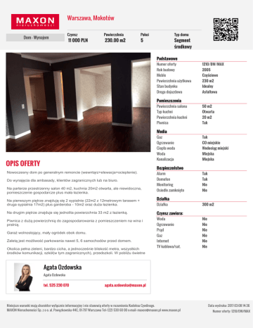 Warszawa, Mokotów Dom - Wynajem Czynsz 11 000 PLN Powierzchnia 230.00 m2 Pokoi Typ domu 5 Segment środkowy Podstawowe Numer oferty 1210/DW/MAX Rok budowy 2005 Meble Częściowe Powierzchnia użytkowa 230 m2 Stan budynku Idealny Droga dojazdowa Asfaltowa Pomieszczenia Powierzchnia salonu 50 m2 Typ kuchni Otwarta Powierzchnia kuchni 20 m2 Piwnica Tak Media OPIS OFERTY Nowoczesny dom po generalnym remoncie (wewntąrz+elewacja+ocieplenie). Gaz Tak Ogrzewanie CO miejskie Ciepła woda Wodociąg miejski Woda Miejska Kanalizacja Miejska Bezpieczeństwo Alarm Tak Do wynajęcia dla ambasady, klientów zagranicznych lub na biuro. Domofon Tak Na parterze przestrzenny salon 40 m2, kuchnia 20m2 otwarta, ale niewidoczna, pomieszczenie gospodarcze plus mała łazienka. Monitoring Nie Osiedle zamknięte Nie Na pierwszym piętrze znajdują się 2 sypialnie (22m2 z 12metrowym tarasem + druga sypialnia 17m2) plus garderoba - 10m2 oraz duża łazienka. Na drugim piętrze znajduje się jednolita powierzchnia 33 m2 z łazienką. Piwnica z dużą powierzchnią do zagospodarowania z pomieszczeniem na wina i pralnią. Garaż wolnostojący, mały ogródek obok domu. Zaletą jest możliwość parkowania nawet 5, 6 samochodów przed domem. Okolica pełna zieleni, bardzo cicha, a jednocześnie bliskość metra, wszystkich środków komunikacji, szkół(w tym zagranicznych), przedszkoli. W pobliżu świetne Działka Działka 300 m2 Czynsz zawiera: Woda Nie Ogrzewanie Nie Prąd Nie Gaz Nie Internet Nie TV kablowa/sat. Nie Agata Ozdowska Agata Ozdowska tel. 525 230 070 [email protected] Niniejsze warunki mają charakter wyłącznie informacyjny i nie stanowią oferty w rozumieniu Kodeksu Cywilnego. MAXON Nieruchomości Sp. z o o. ul. Powązkowska 44C, 01-797 Warszawa Tel: (22) 530 60 00 e-mail: [email protected] www.maxon.pl Data wydruku: 2017-03-08 14:36 Numer oferty: 1210/DW/MAX
