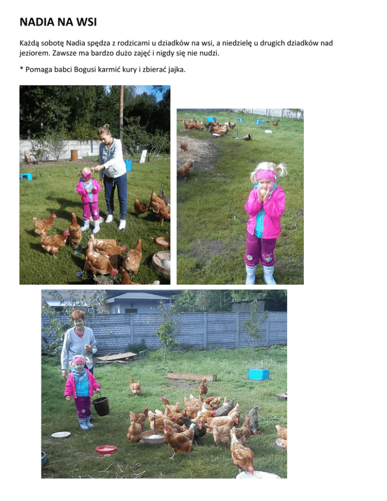 NADIA NA WSI Każdą sobotę Nadia spędza z rodzicami u dziadków na wsi, a niedzielę u drugich dziadków nad jeziorem. Zawsze ma bardzo dużo zajęć i nigdy się nie nudzi. * Pomaga babci Bogusi karmić kury i zbierać jajka. * Dziadkowi Markowi pomaga na działce - wyrywa chwasty, zrywa pomidory i owoce z drzew. * Nadia uwielbia bawić się z pieskami babci Jadzi. * A po niedzielnym obiedzie jeździ z tatą nad jezioro, albo do lasu na grzyby. Każdy wyjazd Nadii do dziadków, jest prawdziwą WYPRAWĄ W ZIELONE!