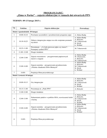 PROGRAM ZAJĘĆ: „Zima w Parku” – zajęcia edukacyjne w ramach dni otwartych PPN TERMIN: 09-13 lutego 2015 r. Lp. Zajęcia edukacyjne Godzina Prowadzący Dzień 1 (poniedziałek 09 lutego) 1 10.00-10.10 Powitanie uczestników i przedstawienie programu zajęć. A. Myka-Raduj 2 10.10-10.25 Zabawy integracyjne mające na celu wzajemne poznanie się dzieci A. Myka-Raduj A. Różycki, M. Tokarzewski K. Kiryk Ł. Wróbel 3 10.25-11.00 Prezentacja – „Co było pierwsze jajko czy żuraw? : Poznajmy symbol PPN” M. Tokarzewski 4 11.00 -12.00 Drugie śniadanie - 5 12.00-13.00 Zajęcia warsztatowe – przygotowanie papierowych żurawi z origami 6 13.00-14.00 Zajęcia teatralne – przygotowanie przedstawienia „Poleska Akademia Żółwi Błotnych” 7 14.00 - Projekcja filmu przyrodniczego A. Myka-Raduj W. Piotrowski, A. Różycki, M. Tokarzewski A. Myka-Raduj A. Różycki, M. Tokarzewski K. Kiryk Ł. Wróbel - Dzień 2 (wtorek 10 lutego) 1 10.00-10.15 Gry integracyjne A. Myka-Raduj A. Różycki, M. Tokarzewski K. Kiryk Ł. Wróbel 2 10.15-11.00 Prezentacja nt. „Ptaki PPN” A. Różycki 3 11.00-12.00 Drugie śniadanie - 4 12.00-13.00 Dokarmianie ptaków w pobliżu ODA, rozwieszanie kulek z karmą 5 13.00-14.00 Zajęcia teatralne – przygotowanie przedstawienia „Poleska Akademia Żółwi Błotnych” 6 14.00 - Projekcja filmu przyrodniczego A. Myka-Raduj A. Różycki, M. Tokarzewski K. Kiryk Ł. Wróbel A. Myka-Raduj A. Różycki, M. Tokarzewski K. Kiryk Ł. Wróbel - Dzień 3 (środa 11 lutego) 1 10.00-10.15 Gry integracyjne A. Myka-Raduj A. Różycki, M. Tokarzewski K. Kiryk Ł. Wróbel 2 10.15-11.00 Prezentacja dotycząca Warsztatów Terapii Zajęciowej Pracownicy WTZ 3 11.00-12.00 Drugie śniadanie - 4 12.00-13.00 Wspólne zajęcia z podopiecznymi Warsztatów Terapii Zajęciowej w Parczewie 5 13.00-14.00 Zajęcia teatralne – przygotowanie przedstawienia „Poleska Akademia Żółwi Błotnych” 6 14.00 - Projekcja filmu przyrodniczego A. Myka-Raduj A. Różycki, M. Tokarzewski K. Kiryk Ł. Wróbel, pracownicy WTZ A. Myka-Raduj A. Różycki, M. Tokarzewski K. Kiryk Ł. Wróbel - Dzień 4 (czwartek 12 lutego) 1 09.00-14.00 Wycieczka do Nadleśnictwa Parczew w Sosnowicy – zajęcia terenowe przeprowadzone przez pracowników ALP, ognisko A. Myka-Raduj A. Różycki, M. Tokarzewski K. Kiryk Ł. Wróbel pracownicy Nadleśnictwa Dzień 5 (piątek 13 lutego) 1 10.00-10.15 Gry integracyjne 2 10.15-11.00 Zajęcia teatralne – przygotowanie przedstawienia „Poleska Akademia Żółwi Błotnych” 3 11.0 -12.00 Drugie śniadanie 4 12.00-13.00 Podsumowanie zimowiska, wręczenie pamiątkowych nagród dla uczestników zajęć 5 13.00-14.00 Przedstawienie teatralne „Poleska Akademia Żółwi Błotnych” dla zaproszonych gości ( rodziców, opiekunów, nauczycieli) A. Myka-Raduj A. Różycki, M. Tokarzewski K. Kiryk Ł. Wróbel A. Myka-Raduj A. Różycki, M. Tokarzewski K. Kiryk Ł. Wróbel A. Myka-Raduj A. Różycki, M. Tokarzewski K. Kiryk Ł. Wróbel A. Myka-Raduj A. Różycki, M. Tokarzewski K. Kiryk Ł. Wróbel