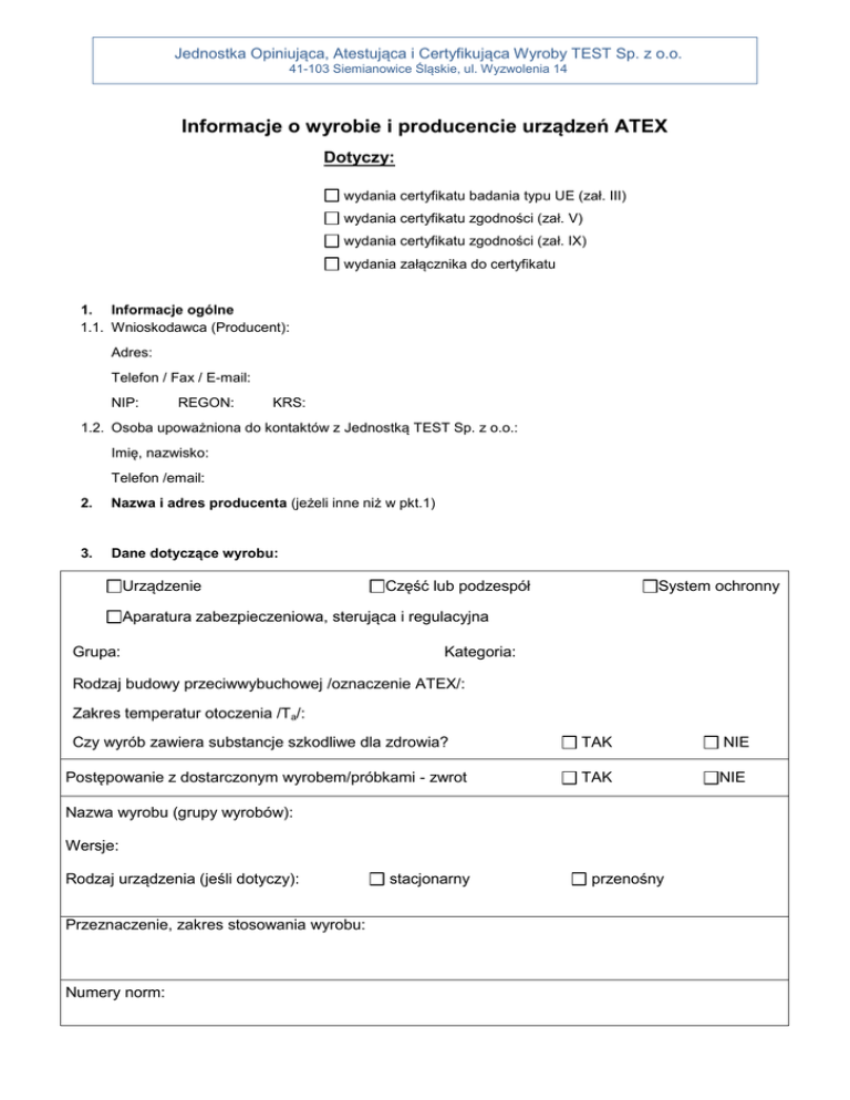 Jednostka Opiniująca, Atestująca i Certyfikująca Wyroby TEST Sp. z o.o. 41-103 Siemianowice Śląskie, ul. Wyzwolenia 14 Informacje o wyrobie i producencie urządzeń ATEX Dotyczy: wydania certyfikatu badania typu UE (zał. III) wydania certyfikatu zgodności (zał. V) wydania certyfikatu zgodności (zał. IX) wydania załącznika do certyfikatu 1. Informacje ogólne 1.1. Wnioskodawca (Producent): Adres: Telefon / Fax / E-mail: NIP: REGON: KRS: 1.2. Osoba upoważniona do kontaktów z Jednostką TEST Sp. z o.o.: Imię, nazwisko: Telefon /email: 2. Nazwa i adres producenta (jeżeli inne niż w pkt.1) 3. Dane dotyczące wyrobu: Urządzenie Część lub podzespół System ochronny Aparatura zabezpieczeniowa, sterująca i regulacyjna Grupa: Kategoria: Rodzaj budowy przeciwwybuchowej /oznaczenie ATEX/: Zakres temperatur otoczenia /Ta/: Czy wyrób zawiera substancje szkodliwe dla zdrowia? Postępowanie z dostarczonym wyrobem/próbkami - zwrot TAK NIE TAK NIE Nazwa wyrobu (grupy wyrobów): Wersje: Rodzaj urządzenia (jeśli dotyczy): Przeznaczenie, zakres stosowania wyrobu: Numery norm: stacjonarny przenośny Jednostka Opiniująca, Atestująca i Certyfikująca Wyroby TEST Sp. z o.o. 41-103 Siemianowice Śląskie, ul. Wyzwolenia 14 Załączniki (dokumentacja techniczna, certyfikaty itp.): Czy wyrób zawiera części lub podzespoły Ex? TAK NIE TAK NIE Jeśli tak, podać nazwę, producenta, typ, nr certyfikatu, oznaczenie: Dotyczy załącznika do certyfikatu Czy nastąpi zmiana oznaczenia? Numer certyfikatu: Proponowane oznakowanie: Krótki opis wprowadzonych zmian: JOAiCW Sp. z o.o. – po zweryfikowaniu informacji przesłanych przez Wnioskodawcę udzieli pisemnego potwierdzenia z określeniem warunków wykonania usługi (z podaniem m.in. kosztów i terminu realizacji). …………………………………… Miejscowość, data ………………………………………………… Przedstawiciel wnioskodawcy