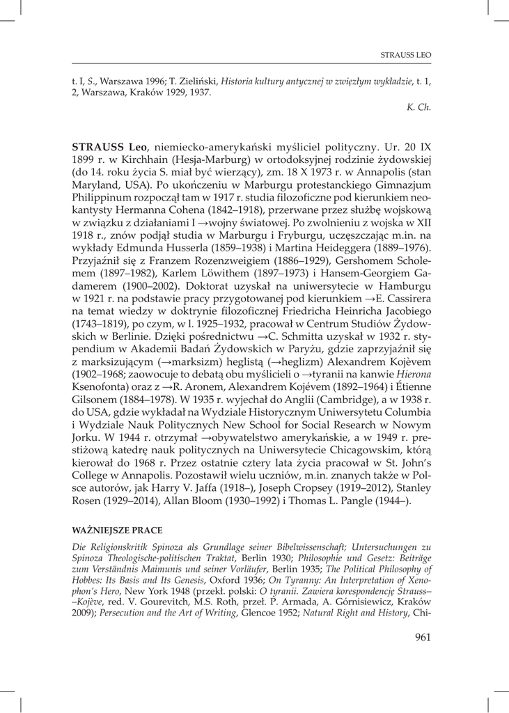 STRAUSS LEO t. I, S., Warszawa 1996; T. Zieliński, Historia kultury antycznej w zwięzłym wykładzie, t. 1, 2, Warszawa, Kraków 1929, 1937. K. Ch. STRAUSS Leo, niemiecko-amerykański myśliciel polityczny. Ur. 20 IX 1899 r. w Kirchhain (Hesja-Marburg) w ortodoksyjnej rodzinie żydowskiej (do 14. roku życia S. miał być wierzący), zm. 18 X 1973 r. w Annapolis (stan Maryland, USA). Po ukończeniu w Marburgu protestanckiego Gimnazjum Philippinum rozpoczął tam w 1917 r. studia filozoficzne pod kierunkiem neokantysty Hermanna Cohena (1842–1918), przerwane przez służbę wojskową w związku z działaniami I →wojny światowej. Po zwolnieniu z wojska w XII 1918 r., znów podjął studia w Marburgu i Fryburgu, uczęszczając m.in. na wykłady Edmunda Husserla (1859–1938) i Martina Heideggera (1889–1976). Przyjaźnił się z Franzem Rozenzweigiem (1886–1929), Gershomem Scholemem (1897–1982), Karlem Löwithem (1897–1973) i Hansem-Georgiem Gadamerem (1900–2002). Doktorat uzyskał na uniwersytecie w Hamburgu w 1921 r. na podstawie pracy przygotowanej pod kierunkiem →E. Cassirera na temat wiedzy w doktrynie filozoficznej Friedricha Heinricha Jacobiego (1743–1819), po czym, w l. 1925–1932, pracował w Centrum Studiów Żydowskich w Berlinie. Dzięki pośrednictwu →C. Schmitta uzyskał w 1932 r. stypendium w Akademii Badań Żydowskich w Paryżu, gdzie zaprzyjaźnił się z marksizującym (→marksizm) heglistą (→heglizm) Alexandrem Kojèvem (1902–1968; zaowocuje to debatą obu myślicieli o →tyranii na kanwie Hierona Ksenofonta) oraz z →R. Aronem, Alexandrem Kojévem (1892–1964) i Étienne Gilsonem (1884–1978). W 1935 r. wyjechał do Anglii (Cambridge), a w 1938 r. do USA, gdzie wykładał na Wydziale Historycznym Uniwersytetu Columbia i Wydziale Nauk Politycznych New School for Social Research w Nowym Jorku. W 1944 r. otrzymał →obywatelstwo amerykańskie, a w 1949 r. prestiżową katedrę nauk politycznych na Uniwersytecie Chicagowskim, którą kierował do 1968 r. Przez ostatnie cztery lata życia pracował w St. John’s College w Annapolis. Pozostawił wielu uczniów, m.in. znanych także w Polsce autorów, jak Harry V. Jaffa (1918–), Joseph Cropsey (1919–2012), Stanley Rosen (1929–2014), Allan Bloom (1930–1992) i Thomas L. Pangle (1944–). WAŻNIEJSZE PRACE Die Religionskritik Spinoza als Grundlage seiner Bibelwissenschaft; Untersuchungen zu Spinoza Theologische-politischen Traktat, Berlin 1930; Philosophie und Gesetz: Beiträge zum Verständnis Maimunis und seiner Vorläufer, Berlin 1935; The Political Philosophy of Hobbes: Its Basis and Its Genesis, Oxford 1936; On Tyranny: An Interpretation of Xenophon’s Hero, New York 1948 (przekł. polski: O tyranii. Zawiera korespondencję Strauss– –Kojève, red. V. Gourevitch, M.S. Roth, przeł. P. Armada, A. Górnisiewicz, Kraków 2009); Persecution and the Art of Writing, Glencoe 1952; Natural Right and History, Chi- 961 STRAUSS LEO cago 1953 (przekł. polski: Prawo naturalne w świetle historii, przeł. T. Górski, Warszawa 1969); Thoughts on Machiavelli, Glencoe 1958; What is Political Philosophy?, Glencoe 1959; History of Political Philosophy (red. wraz z J. Cropsey’em), Chicago 1963 (przekł. polski: Historia filozofii politycznej. Podręcznik, przekł. zbior., Warszawa 2010); The City and Man, Chicago 1964; Socrates and Aristophanes, Chicago 1966; Liberalism Ancient and Modern, New York 1968; Xenophon’s Socratic Discourse. An Interpretation of the „Oeconomicus”, Ithaca 1970; Xenophon’s Socrates, Ithaca 1972. Pośmiertnie ukazały się antologie tekstów i wykładów oraz korespondencje S.: The Argument and Action of Plato’s „Laws”, Chicago 1975; Political Philosophy. Six Essays by Leo S., Indianapolis 1975; Studies in Platonic Political Philosophy, Chicago 1983; The Rebirth of Classical Political Rationalism. An Introduction to the Thought of Leo S. Essays and Lectures by Leo S., Chicago 1989; Essays and Lectures in Modern Jewish Thought, Albany 1997; On Plato’s „Symposium”, Chicago 2001; The Early Writings (1921–1932), Albany–New York 2002; Faith and Political Philosophy. The Correspondence between Leo Strauss and Eric Voegelin 1934–1964, red. P. Emberley and B.B. Cooper, Pennsylvania 1993. Zwykle wyróżnia się trzy etapy twórczości S.: trwający do 1938 r., gdy zajmował się „problemem teologiczno-politycznym”, tj. stosunkiem filozofii politycznej do Objawienia; trwający do 1954 r., gdy analizował problemy tyranii i →prawa naturalnego, znajdując m.in. w pismach →Platona i →Arystotelesa argumenty przeciwko zjawiskom typowym dla nowoczesności, jak nihilizm, →relatywizm, historycyzm (→historyzm), behawioralizm i →pozytywizm, które miały osiągnąć szczyt rozwoju w →totalitaryzmach; etap ostatni, gdy znów zainteresował się pismami starożytnych filozofów i historyków greckich, m.in. →Sokratesa, →Tukidydesa i Ksenofonta (430?–355? r. przed Chr.; →Jezus Chr.), a także filozofią arabską (neoplatonika [→neoplatonizm] Muhammada ibn Muhammada ibn Tarkhana ibn Uzalagh al-Farabiego, 870?–950 po Chr.) i żydowską (arystotelika Mojżesza Majmonidesa, 1138–1204), szukając w nich elementów →„racjonalizmu politycznego” dla wieku naznaczonego doświadczeniami reżimów totalitarnych, podążając tedy drogą podjętą również m.in. przez →H. Arendt i →E. Voegelina, C. Schmitta i →M. Oakeshotta. S. bywa zaliczany do grona konserwatystów (→konserwatyzm) nastawionych krytycznie wobec tendencji występujących w czasach nowożytnych (krytyka ze strony liberałów; →liberalizm), a nawet uznawany za prekursora rozwijającego się od lat 60. XX w. w myśli amerykańskiej podejścia →neokonserwatywnego (krytyka formułowana przez „paleokonserwatystów”, którzy zarzucają S. – wiążącemu pojawienie się „nowej nauki o polityce” z wystąpieniem →N. Machiavellego – nie tylko niechęć do →tra