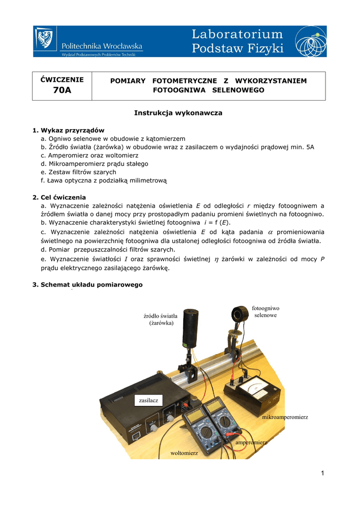 ĆWICZENIE 70A POMIARY FOTOMETRYCZNE Z WYKORZYSTANIEM FOTOOGNIWA SELENOWEGO Instrukcja wykonawcza 1. Wykaz przyrządów a. Ogniwo selenowe w obudowie z kątomierzem b. Źródło światła (żarówka) w obudowie wraz z zasilaczem o wydajności prądowej min. 5A c. Amperomierz oraz woltomierz d. Mikroamperomierz prądu stałego e. Zestaw filtrów szarych f. Ława optyczna z podziałką milimetrową 2. Cel ćwiczenia a. Wyznaczenie zależności natężenia oświetlenia E od odległości r między fotoogniwem a źródłem światła o danej mocy przy prostopadłym padaniu promieni świetlnych na fotoogniwo. b. Wyznaczenie charakterystyki świetlnej fotoogniwa i = f (E). c. Wyznaczenie zależności natężenia oświetlenia E od kąta padania promieniowania świetlnego na powierzchnię fotoogniwa dla ustalonej odległości fotoogniwa od źródła światła. d. Pomiar przepuszczalności filtrów szarych. e. Wyznaczenie światłości I oraz sprawności świetlnej żarówki w zależności od mocy P prądu elektrycznego zasilającego żarówkę. 3. Schemat układu pomiarowego źródło światła (żarówka) fotoogniwo selenowe zasilacz mikroamperomierz amperomierz woltomierz 1 4. Przebieg pomiarów Wersja podstawowa 1. Podłączyć układ pomiarowy wg. powyższego schematu. 2. Sprawdzić czy pokrętła regulacji napięcia i natężenia prądu na zasilaczu znajdują się w lewym skrajnym położeniu. 3. Włączyć zasilacz do sieci. 4. Wyznaczyć zależność natężenia oświetlenia E od odległości r między fotoogniwem a źródłem światła: a) ustawić fotoogniwo w odległości r = 30 cm od żarówki, prostopadle do promieni świetlnych padających na czynną powierzchnię fotoogniwa (kąt padania światła = 0); b) ustalić moc dostarczoną do żarówki tak, aby natężenie prądu fotoelektrycznego (mierzonego na mikroamperomierzu podłączonym do ogniwa) wynosiło i = 105 A (odpowiada to mocy ok. 15 W). Przy tych warunkach natężenie źródła światła wynosi I = 16,5 cd; c) dla 10 różnych odległości r fotoogniwa od źródła (np. co 2 cm) zmierzyć natężenie prądu fotoelektrycznego i. Wersja rozszerzona 5. Wyznaczyć zależność natężenia oświetlenia E od kąta padania światła na powierzchnię fotoogniwa (wersja rozszerzona): a) ustawić fotoogniwo w stałej odległości, np. r = 30 cm od źródła światła; b) zmierzyć natężenie prądu fotoelektrycznego i dla różnych wartości kąta padania promieni świetlnych na fotoogniwo w zakresie od 0 do 45o co 5o; pomiary natężenia prądu fotoelektrycznego wykonać przy obrocie fotoogniwa w prawą i lewą stronę, a następnie uśrednić obie wartości dla danego . 6. Pomiar przepuszczalności filtrów szarych: a) ustalić odległość fotoogniwa od źródła światła przy zadanej mocy żarówki; przy prostopadłym padaniu promieni świetlnych na powierzchnię czynną fotoogniwa zmierzyć natężenie prądu fotoelektrycznego i; b) umieścić badany filtr szary w pobliżu fotoogniwa i zmierzyć natężenie prądu fotoelektrycznego i’ dla światła przepuszczalnego przez filtr; 7. Wyznaczyć światłość I źródła światła oraz sprawność świetlną żarówki w zależności od pobieranej mocy P: a) ustalić moc prądu elektrycznego zasilającego żarówkę Px = Uż Iż; UWAGA: nie przekraczać mocy 20 W; b) dla prostopadłego padania promieni świetlnych na fotoogniwo ustawić fotoogniwo w takiej odległości rx od źródła, aby natężenie prądu fotoelektrycznego wynosiło i = 105 A; c) analogiczne pomiary wykonać dla 10 różnych mocy prądu zasilającego żarówkę Px. 5. Opracowanie wyników Wersja podstawowa 1. Zależność natężenia oświetlenia E od odległości r od źródła światła opisuje prawo Lamberta: . gdzie: E [lx] – natężenie oświetlenia fotoogniwa I [cd] – światłość źródła światła r – odległość między fotoogniwem a źródłem światła 2 (1) – kąt padania promieni świetlnych na fotoogniwo a) W oparciu o prawo Lamberta (1) wyznaczyć wartość natężenia oświetlenia E dla każdej wartości r przyjmując I = 16,5 cd oraz = 0o ; b) Obliczyć niepewność natężenia oświetlenia uc(E) przyjmując u(I) = 0,5 cd; niepewność odległości u(r) wyznaczyć doświadczalnie (dla danej odległości r sprawdzić zakres przesunięcia, przy którym wskazanie mikroamperomierza nie zmienia się). 2. Wykreślenie charakterystyki świetlnej fotoogniwa: a) w oparciu o wyniki pomiarów natężenia prądu fotoelektrycznego i w zależności od odległości r fotoogniwa od źródła światła oraz wyniki obliczeń natężenia oświetlenia E dla tych odległości sporządzić wykres i = f (E). b) dla kilku punktów pomiarowych nanieść prostokąty niepewności obliczając niepewność natężenia fotoprądu i z klasy miernika. Wersja rozszerzona 3. Wyznaczenie zależności natężenia oświetlenia E od kąta padania światła na powierzchnię fotoogniwa dla r = const. a) z prawa Lamberta (1) obliczyć natężenie oświetlenia E dla wszystkich zmierzonych wartości kąta przyjmując r = 30 cm, I = 16,5 cd; b) wyznaczyć niepewność natężenia oświetlenia uc(E) przyjmując u(I) = 0,5 cd, u() = 1o, u(r) wyznaczyć doświadczalnie (jak w podpunkcie 1b). c) wykorzystując uśrednione wartości pomiarów natężenia fotoprądu i dla różnych kątów (przy odchylaniu w prawą i lewą stronę) odczytać z charakterystyki świetlnej fotoogniwa (podpunkt 2) natężenia oświetlenia; d) porównać wartości natężenia oświetlenia E otrzymane z prawa Lamberta i odczytane z wykresu i = f (E). 4. Wyznaczenie współczynników przepuszczalności T filtrów szarych: a) współczynnik przepuszczalności T filtra obliczyć ze wzoru: (2) gdzie: E – natężenie oświetlenia powierzchni fotoogniwa bez filtra, E’– natężenie oświetlenia powierzchni fotoogniwa z filtrem, i – natężenie fotoprądu odpowiadające E, i’– natężenie fotoprądu odpowiadające E’; b) wyznaczyć niepewność wsp