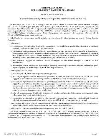 UCHWAŁA NR XL/763/14 RADY MIEJSKIEJ W KAMIENIU POMORSKIM z dnia 24 października 2014 r. w sprawie określenia wysokości stawek podatku od nieruchomości na 2015 rok Na podstawie art.18 ust.2 pkt 8 ustawy z dnia 08 marca 1990 r. o samorządzie gminnym(tekst jednolity: Dz. U. z 2013 r. poz.594, poz. 645, poz. 1318; z 2014 r. poz.379), art.5 ust.1 i 3, art. 20b, art.20c, art.20d ust.2 pkt 2 ustawy z dnia 12 stycznia 1991 r. o podatkach i opłatach lokalnych (tekst jednolity: Dz. U. z 2014 r. poz. 849) oraz rozporządzenia Komisji (UE) Nr 1407/2013 z dnia 18 grudnia 2013 r. w sprawie stosowania art. 107 i 108 Traktatu o funkcjonowaniu Unii Europejskiej do pomocy de minimis (Dz. Urz. UE L 352 z 24.12.2013) zarządza się co następuje: § 1. Określa się następujące stawki podatku od nieruchomości obowiązujące na terenie Gminy Kamień Pomorski: 1) od gruntów: a) związanych z prowadzeniem działalności gospodarczej bez względu na sposób sklasyfikowania w ewidencji gruntów i budynków – 0,65 zł. od 1 m² powierzchni; b) związanych z prowadzeniem działalności gospodarczej po raz pierwszy, jeżeli podmiot wykorzystujący grunt będący przedmiotem opodatkowania nie prowadził na nim innej działalności gospodarczej – 0,10 zł. od 1 m² powierzchni – jest to stawka podatkowa stanowiąca pomoc de minimis (stawka stanowiąca różnicę pomiędzy stawką podstawową a stawką preferencyjną zastosowaną w uchwale); c) pod jeziorami, zajętych na zbiorniki wodne, retencyjne lub elektrowni wodnych – 3,90 zł. od 1 ha powierzchni; d) pozostałych, w tym zajętych na prowadzenie odpłatnej statutowej działalności pożytku publicznego przez organizacje pożytku publicznego – 0,30 zł. od 1 m² powierzchni; 2) od budynków lub ich części: a) mieszkalnych – 0,70 zł. od 1 m² powierzchni użytkowej; b) związanych z prowadzeniem działalności gospodarczej oraz od budynków mieszkalnych lub ich części zajętych na prowadzenie działalności gospodarczej 14,00 zł. od 1 m² powierzchni użytkowej; c) związanych z prowadzeniem działalności gospodarczej oraz od budynków mieszkalnych lub ich części zajętych na prowadzenie działalności gospodarczej po raz pierwszy, jeżeli podmiot wykorzystujący budynek nie prowadził w nim innej działalności gospodarczej – 1,00 zł. od 1 m² powierzchni użytkowej – jest to stawka podatkowa stanowiąca pomoc de minimis (stawka stanowiąca różnicę pomiędzy stawką podstawową a stawką preferencyjną zastosowaną w uchwale); d) zajętych na prowadzenie działalności gospodarczej w zakresie obrotu kwalifikowanym materiałem siewnym – 7,10 zł. od 1 m² powierzchni użytkowej; e) związanych z udzielaniem świadczeń zdrowotnych w rozumieniu przepisów o działalności leczniczej, zajętych przez podmioty udzielające tych świadczeń – 4,20 zł. od 1 m² powierzchni użytkowej; f) od pozostałych, w tym zajętych na prowadzenie odpłatnej statutowej działalności pożytku publicznego przez organizacje pożytku publicznego - 5,40 zł. od 1 m² powierzchni użytkowej; 3) od budowli – 2 % ich wartości określonej na podstawie art.4 ust.1 pkt 3 i ust. 3-7. § 2. Jeżeli stawka, o której mowa w § 1 pkt 1 lit b) i § 1 pkt 2 lit c) stanowi pomoc publiczną, to jest to stosowana jako pomoc de minimis na zasadach określonych w rozporządzeniu Komisji (UE) Nr 1407/2013 z dnia 18 grudnia 2013 r. w sprawie stosowania art. 107 i 108 Traktatu o funkcjonowaniu Unii Europejskiej do pomocy de minimis (Dz. Urz. UE L 352 z 24.12.2013). Id: AD9BF281-DE53-401C-8718-E44A367435BA. Podpisany Strona 1 § 3. W przypadku, o którym mowa w § 2 niniejszej uchwały, podmiot ubiegający się o udzielenie pomocy zobowiązany jest do złożenia w terminie do dnia 31 stycznia roku podatkowego, a w przypadku powstania obowiązku podatkowego po tej dacie, w terminie 14 dni od zaistnienia okoliczności uzasadniających jego powstanie : 1) wszystkich zaświadczeń o pomocy de minimis, jakie otrzymał w roku, w którym ubiega się o Pomo, oraz w ciągu 2 poprzedzających go lat, albo oświadczenia o wielkości pomocy de minimis otrzymanej w tym okresie, albo oświadczenia o nieotrzymaniu takiej pomocy w tym okresie; 2) informacji niezbędnych do udzielenia pomocy de minimis, dotyczących w szczególności wnioskodawcy i prowadzonej przez niego działalności gospodarczej oraz wielkości pomocy publicznej otrzymanej w odniesieniu do tych samych kosztów kwalifikujących się do objęcia pomocą, na pokrycie których ma być przeznaczona pomoc de minimis na formularzu stanowiącym załącznik do rozporządzenia Rady Ministrów z dnia 29 marca 2010 r. w sprawie informacji przedstawianych przez podmiot ubiegający się o pomoc de minimis (Dz. U. Nr 53, poz. 311). § 4. Zarządza się pobór podatku na terenach wiejskich od osób fizycznych w drodze inkasa. 1) ustala się, że inkasentami są Sołtysi Gminy Kamień Pomorski; 2) wysokość wynagrodzenia inkasenta ustala się w wysokości 5 % kwoty pobranego podatku. § 5. Z dniem wejścia w życie niniejszej uchwały, traci moc Uchwała Nr XLIX/638/13 Rady Miejskiej w Kamieniu Pomorskim z dnia 29 listopada 2013 r. w sprawie stawek w podatku od nieruchomości na rok 2014. § 6. Wykonanie uchwały powierza się Burmistrzowi Kamienia Pomorskiego. § 7. Uchwała wchodzi w życie po upływie 14 dni od dnia ogłoszenia w Dzienniku Urzędowym Województwa Zachodniopomorskiego, nie wcześniej jednak niż z dniem 1 stycznia 2015 roku. Przewodnicząca Rady Miejskiej mgr Kazimiera Szymańska Id: AD9BF281-DE53-401C-8718-E44A367435BA. Podpisany Strona 2 Uzasadnienie Zgodnie z przepisami art.18 ust.2 pkt 8 ustawy z dnia 8 marca 1990r. o samorządzie gminnym (Dz. U. z 2013 r., poz.594, poz. 645, poz. 1318; z 2014 r. poz.379 ) do wyłącznej właściwości rady gminy należy podejmowanie uchwał w sprawach podatków i opłat w granicach określonych w odrębnych ustawach. W świetle przepisów art.5 ust.1 i 3, art. 20b