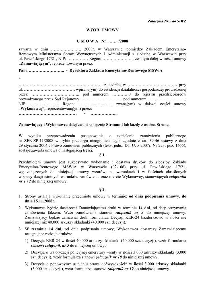 Załącznik Nr 2 do SIWZ WZÓR UMOWY U M O W A Nr ……../2008 zawarta w dniu …………………. 2008r. w Warszawie, pomiędzy Zakładem EmerytalnoRentowym Ministerstwa Spraw Wewnętrznych i Administracji z siedzibą w Warszawie przy ul. Pawińskiego 17/21, NIP: …………… Regon: …………………., zwanym dalej w treści umowy „Zamawiającym”, reprezentowanym przez: Pana …………………….. - Dyrektora Zakładu Emerytalno-Rentowego MSWiA a ……………………………………………………. z siedzibą w ……………………………… przy ul. ………………………………, wpisaną(ym) do ewidencji działalności gospodarczej prowadzonej przez …………………………….. pod numerem …………./ do rejestru przedsiębiorców prowadzonego przez Sąd Rejonowy ………………..……….. pod numerem ………………………, NIP: ………………… Regon: ……………………, zwaną(ym) w dalszej części umowy „Wykonawcą”, reprezentowaną(ym) przez: …………………………………… - ……………….. Zamawiający i Wykonawca dalej zwani są łącznie Stronami lub każdy z osobna Stroną. W wyniku przeprowadzenia postępowania o udzielenie zamówienia publicznego nr ZER-ZP-11/2008 w trybie przetargu nieograniczonego, zgodnie z art. 39-46 ustawy z dnia 29 stycznia 2004r. Prawo zamówień publicznych (tekst jedn.: Dz. U. z 2007r. Nr 223, poz. 1655), zostaje zawarta umowa o następującej treści: § 1. Przedmiotem umowy jest sukcesywne wykonanie i dostawa druków do siedziby Zakładu Emerytalno-Rentowego MSWiA w Warszawie (02-106) przy ul. Pawińskiego 17/21, wg załączonych do niniejszej umowy wzorów, na warunkach i w ilościach określonych w specyfikacji istotnych warunków zamówienia oraz ofercie Wykonawcy, stanowiących załączniki nr 1 i 2 do niniejszej umowy. § 2. 1. Strony ustalają wykonanie przedmiotu umowy w terminie: od dnia podpisania umowy, do dnia 15.11.2008r. 2. Wykonawca będzie dostarczał Zamawiającemu druki w terminie 14 dni, od daty otrzymania zamówienia faksem. Wzór zamówienia stanowi załącznik nr 3 do niniejszej umowy. Zamawiający będzie zamawiał druki formularza Decyzji KER-24 każdorazowo w ilości nie mniejszej niż 40.000 arkuszy składanki (40.000 szt. decyzji). 3. W terminie 14 dni, od dnia podpisania umowy, Wykonawca dostarczy Zamawiającemu następujące rodzaje druków: 1) Decyzja KER-24 w ilości 40.000 arkuszy składanki (40.000 szt. decyzji), wzór formularza stanowi załącznik nr 5 do niniejszej umowy; 2) Decyzja o waloryzacji policyjnej emerytury –renty w ilości 3.000 arkuszy składanki (3.000 szt. decyzji), wzór formularza stanowi załącznik nr 18 do niniejszej umowy; 3) Decyzja o ponownym* ustaleniu prawa do*wysokości* w ilości 3.000 arkuszy składanki (3.000 szt. decyzji), wzór formularza stanowi załącznik nr 19 do niniejszej umowy. § 3. 1. Zamawiający zastrzega sobie możliwość zmiany treści załączonych do umowy druków. 2. Zamawiający będzie informował Wykonawcę o konieczności wprowadzenia zmian w treści druków. 3. Wykonawca przed rozpoczęciem wykonania druków zobowiązany z upoważnionymi pracownikami Zamawiającego treść druków. jest uzgodnić 4. Przed przystąpieniem do wykonania każdego rodzaju druków, Wykonawca zobowiązany jest uzyskać pisemną akceptację upoważnionych pracowników Zamawiającego, na przedstawionych drukach próbnych. 5. Wykonawca zobowiązany jest zawiadomić Zamawiającego o z 2-dniowym wyprzedzeniem, za pośrednictwem fax-u lub telefonicznie. terminie dostawy § 4. 1. Do potwierdzenia wykonania i dostaw druków, o których mowa w § 1, niezbędne jest protokolarne przekazanie przez Wykonawcę wykonanych i dostarczonych druków Zamawiającemu – bez jego zastrzeżeń. 2. Osobami upoważnionymi do podpisania protokołu odbioru ze strony Zamawiającego są: 1) pod względem ilościowym: Pan(i) ……………………… Pan(i) ……………………… 2) pod względem jakościowym: Pan(i) ……………………… Pan(i) ……………………… 3. Druki, które nie spełnią warunków odbioru będą wymienione przez Wykonawcę na nowe, wolne od wad, w terminie 7 dni, od daty wyłączenia z odbioru. § 5. 1. Wartość wynagrodzenia za wykonanie przedmiotu umowy wynosi ……………….. zł …… gr brutto (słownie: …………………………………………………………………………………..). 2. Cena określona w ust. 1 obejmuje wszelkie koszty związane z realizacją przedmiotu umowy, w tym koszty transportu do siedziby Zamawiającego. 3. Wynagrodzenie będzie płatne w terminie 14 dni, od dnia otrzymania przez Zamawiającego faktur VAT, wystawionych po uprzednim podpisaniu przez obie Strony protokołów odbioru, bez zastrzeżeń. 4. Zamawiający upoważnia Wykonawcę do wystawienia faktur VAT, bez podpisu odbiorcy. 5. Za dzień dokonania płatności przyjmuje się datę obciążenia rachunku bankowego Zamawiającego. 6. W razie zwłoki w płatności Zamawiający zapłaci Wykonawcy odsetki ustawowe. § 6. Zamawiający w razie stwierdzenia, w terminie 30 dni, od dnia podpisania protokołu odbioru, wad w danym asortymencie, zgłosi reklamację Wykonawcy, który ma obowiązek wymienić bezpłatnie wadliwe druki na nowe, wolne od wad, w terminie 14 dni, od dnia zgłoszenia reklamacji. 1. § 7. Strony ustalają, że w razie niewykonania lub nienależytego wykonania postanowień niniejszej umowy Wykonawca zapłaci Zamawiającemu karę umowną w wysokości 20% wartości przedmiotu umowy, z zastrzeżeniem ust. 2 i 3. 2. W razie wystąpienia zwłoki w realizacji przedmiotu umowy - w terminach określonych w § 2 Wykonawca zapłaci Zamawiającemu karę umowną w wysokości 3% wartości, tej części przedmiotu umowy, której opóźnienie dotyczy, za każdy dzień roboczy1) zwłoki. 3. Z tytułu niedotrzymania terminów określonych w § 4 ust. 3 i § 6 niniejszej 