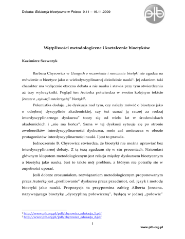 Debata: Edukacja bioetyczna w Polsce 9.11 – 16.11.2009 Wątpliwości metodologiczne i kształcenie bioetyków Kazimierz Szewczyk Barbara Chyrowicz w Uwagach o rozumieniu i nauczaniu bioetyki nie zgadza na mówienie o bioetyce jako o wielodyscyplinarnej dziedzinie nauki1. Jej zdaniem taki charakter ma wyłącznie etyczna debata a nie nauka i stawia przy tym stwierdzeniu aż trzy wykrzykniki. Pogląd ten Autorka potwierdza w swoim kolejnym tekście Jeszcze o „sytuacji macierzystej” bioetyki2. Polemistka dodaje, „że dyskusja nad tym, czy należy mówić o bioetyce jako o odrębnej dyscyplinie akademickiej, czy też uznać ją raczej za rodzaj interdyscyplinarnego dyskursu” toczy się od wielu lat w środowiskach akademickich i „nie ma końca”. Sama w tej dyskusji sytuuje się po stronie zwolenników interdyscyplinarności dyskursu, mnie zaś umieszcza w obozie protagonistów interdyscyplinarności nauki. I jest to prawda. Jednocześnie B. Chyrowicz stwierdza, że bioetyki nie można uprawiać bez interdyscyplinarnej debaty. Z tą tezą zgadzam się w stu procentach. Natomiast głównym kłopotem metodologicznym jest relacja między dyskursem bioetycznym a bioetyką jako nauką. Jest to także mój problem, z którym nie potrafię się w zupełności uporać. Jeśli dobrze zrozumiałem, rozwiązaniem metodologicznym proponowanym przez Autorkę jest „profilowanie” dyskursu przez przedmiot, cel, język i metodę bioetyki jako nauki. Propozycja ta przypomina zabieg Alberta Jonsena, nazywającego bioetykę „dyscypliną połowiczną”, będącą w jednej „połowie” 1 2 http://www.ptb.org.pl/pdf/chyrowicz_edukacja_1.pdf http://www.ptb.org.pl/pdf/chyrowicz_edukacja_2.pdf 1 www.ptb.org.pl Debata: Edukacja bioetyczna w Polsce 9.11 – 16.11.2009 dyskursem społecznym a w drugiej fakultetem akademickim 3. Jest to koncept bliski mojemu sercu. Jednak kłopot w tym – przynajmniej dla mnie – że nie jest dostatecznie skuteczny w ochronie części dyskursywnej przed zdominowaniem jej przez połowę akademicką. Jeśli zostanie ona potraktowana jak etyka aplikacyjna i dojdzie do takiej dominacji, wówczas w najlepszym przypadku będzie dalej konserwowany podział na bioetykę jako część medycyny i bioetykę jako uszczegółowienie (preferowanych) teorii filozoficznych czy teologicznych. W najgorszym zaś może dojść do paraliżu dyskursu i będziemy mieli tyle pożytku, co z komisji „invitralnej” posła Gowina (do czego chyba i prof. Chyrowicz czyni aluzję w ostatnim tekście). Kolejny kłopot: rozwiązanie Jonsena może okazać się niezbyt efektywne jako metodologiczna podstawa nauczania bioetyki bioetyków. Być może bardziej przydatna byłaby tu propozycja Loretty Kopelman 4. Jej zdaniem (s. 624) bioetyka ma „fundamentalnie interdyscyplinarną naturę” jest interdysciplinary „istotowo field). interdyscyplinarnym Natura ta skłania polem”(essentialy autorkę do an przyjęcia metodologicznego założenia, zgodnie z którym bioetyka jest „dyscypliną drugiego porządku”. Termin ten oznacza, że jest ona budowana z już istniejących profesji bądź dziedzin nauki i nie redukuje się do konstruujących ją specjalizacji i obszarów nauki. Inaczej mówiąc, zmierza w odwrotnym kierunku niż dotychczasowy proces wyłaniania się nauk szczegółowych z filozofii (s. 620). W rezultacie interdyscyplinarności bioetyki – konkluduje Kopelman – bioetycy mogą być „ekspertami” wyłącznie w partykularnych, składowych jej obszarach. „Nikt bowiem nie może nim być w odniesieniu do tak szerokiego zakresu zagadnień, jaki cechuje problemy bioetyczne”. A.R. Jonsen, The Birth of Bioethics: The Origins of A Demi-Discipline, “Medical Humanities Review”, 1997, nr 1, s. 9-21. 3 L.M. Kopelman, Bioethics As a Second-Order Discipline: Who Is Not a Bioethicist?, “Journal of Medicine and Philosophy” 2006, nr 6, s. 601-628. 4 2 Debata: Edukacja bioetyczna w Polsce 9.11 – 16.11.2009 Taka konkluzja prowadzi, jak sądzę, do rozbicia metodologicznie scalonej bioetyki na szereg eksperckich dyskursów. Jeśli mój sąd jest trafny, również omawiana propozycja nie chroni dostatecznie przed niebezpieczeństwem zdominowania dyskursu społecznego przez już nie akademicką, ale ekspercką część bioetyki. Mało jest także przydatna jako wskazówka przy opracowywaniu kursu dla bioetyków jako bioetyków, którzy po jego ukończeniu mogą się oczywiście specjalizować w poszczególnych jej poddyscyplinach. Ogólny „profil” bioetyka jako bioetyka podaje Ana Iltis, także wychodząc od metodologicznego założenia o interdyscyplinarności bioetyki5. Według autorki „bioetyk jest osobą kształconą w umiejętności gromadzenia, syntezowania i integrowania danych z wielu dyscyplin oraz używania tych danych w rozwiązywaniu problemów związanych z etyką praktykowania opieki zdrowotnej i badań naukowych w tej dziedzinie, wytycznych, postępów w biotechnologii i innych zagadnień typowo łączonych z nazwą ‘bioetyka’” (s. 633). Za dyscypliny mające znaczący udział w bioetyce Iltis uznaje: „prawo; medycynę, pielęgniarstwo i inne nauki o zdrowiu; filozofię; nauki „twarde” (ścisłe?); religię i teologię; literaturę; nauki społeczne takie jak ekonomia, socjologia i antropologia; psychologię; zarządzanie opieką zdrowotną; zdrowie publiczne i epidemiologię” (s. 638). Płyną z nich najważniejsze dane, które musi umieć zbierać i wykorzystywać zawodowy bioetyk. Autorka dodaje, że w różnych, specyficznych dla bioetyki miejscach pracy jej przedstawicieli, konieczne są też dodatkowe umiejętności dla właściwego spełniania ich roli, np. nauczyciela, badacza, konsultanta etycznego czy członka etycznych ciał zbiorowych. Ostatnio coraz częściej mówi się o arbitrażu jako alternatywnym wobec procesów sądowych rozwiązywaniu sporów i konfliktów w opiece zdrowotnej. W nim bioetycy, przeważnie na szczeblu szpitala, ma