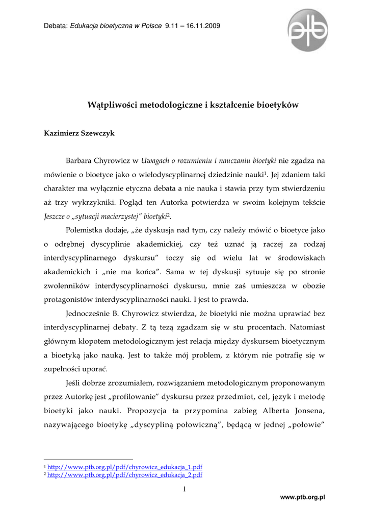 Wątpliwości metodologiczne i kształcenie bioetyków