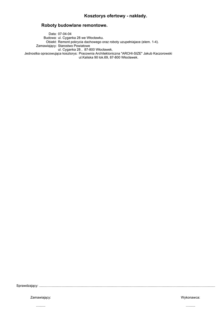Kosztorys ofertowy - nakłady. Roboty budowlane remontowe. Data: Budowa: Obiekt: Zamawiający: 07-04-04 ul. Cyganka 28 we Włocławku. Remont pokrycia dachowego oraz roboty uzupełniajace (elem. 1-4). Starostwo Powiatowe ul. Cyganka 28 , 87-800 Włocławek. Jednostka opracowująca kosztorys: Pracownia Architektoniczna "ARCHI-SIZE" Jakub Kaczorowski ul.Kaliska 90 lok.69, 87-800 Włocławek. Sprawdzający: ................................................................................................................................................................................................... Zamawiający: Wykonawca: .......... .......... as-elsta-E5swpzbP Zuzia (C) DataComp 1994-2006(lic. 11427) Tabela elementów scalonych Nazwa elementu 1 2 3 4 5 6 Wartość z narzutami WRÓWNANIE POWIERZCHNI OŚCIEśY z UZUPEŁNIENIEM TYNKÓW (alternatywa do E-1) i MONTAś PARAPETÓW. REMONT POKRYCIA DACHOWEGO. ROBOTY BLACHARSKIE - front. ROBOTY BLACHARSKIE - tył. ZABEZPIECZENIE OBRÓBEK BLACHARSKICH (E-2 i E-3) WYWÓZ POZOSTAŁOŚCI PO REMONCIE ELEWACJI (przyjęto ogólnie jako gruz). strona nr: 2 as-elsta-E5swpzbP Zuzia (C) DataComp 1994-2006(lic. 11427) Kosztorys ofertowy - nakłady. Opis pozycji podstawy nakładów wyliczenie ilości robót Jedn. Norma Ilość Cena Wartość R, M, S 1 WRÓWNANIE POWIERZCHNI OŚCIEśY z UZUPEŁNIENIEM TYNKÓW (alternatywa do E-1) i MONTAś PARAPETÓW. 1 KNRW 401/1216/1 Zabezpieczenie podłóg folią 300,0 m2 Razem robocizna: r-g 0,057 17,1 Folia polietylenowa budowlana osłonowa 0,12-0,20·mm m2 0,357 107,1 Materiały inne (Materiały) % 2 2 KNR 401/354/11 Wykucie z muru, parapetów stalowych, drewnianych R= 1,500 M= 1,000 S= 1,000 ~178,5 m Razem robocizna: r-g 0,68 182,07 3 KNR 202/123/4 Okładanie (szpałdowanie) elementów konstrukcji Ŝelbetowych lub stalowych, ścian i słupów - płytkami z betonu komórkowego, grubość 12·cm (przyjęto średnio 35cm - boki i dół otworu) R=1,3 likwidacja skosów R= 1,300 M= 1,000 S= 1,000 ~229,08 m2 Razem robocizna: r-g 1,05 312,6942 Płytka z betonu komórkowego M500-700, 59x24x12cm szt 9 2 061,72 Zaprawa cementowo-wapienna M-7 (M= 1,300) m3 0,029 8,63632 Materiały inne (Materiały) % 1,5 Wyciąg jednomasztowy z napędem elektrycznym 0.5·t m-g 0,11 25,1988 4 KNR 202/609/6 Izolacje cieplne i przeciwdźwiękowe z płyt styropianowych, izolacje poziome od spodu konstrukcji, na zaczynie gipsowym (góra otworu - spód nadproŜa) ~83,3 m2 Razem robocizna: r-g 0,765 63,7245 Gips budowlany szpachlowy kg 13 1 082,9 Płyta styropianowa samogasnąca odmiana 15/140mm m2 1,05 87,465 Materiały inne (Materiały) % 1,5 Środek transportowy (1) m-g 0,0047 0,39151 Wyciąg jednomasztowy z napędem elektrycznym 0.5·t m-g 0,0237 1,97421 5 KNR 23/2612/7 Przyklejenie warstwy siatki, ościeŜa ~112,5 m2 Razem robocizna: r-g 1,382 155,475 Zaprawa klejowa sucha do styropianu Atlas Stopter K-20 kg 4 450 Siatka powierzchniowa SSA 1363-SM (gramatura 155g/m2) m2 1,643 184,8375 Materiały inne (Materiały) % 1,5 śuraw okienny przenośny 0.15·t m-g 0,007 0,7875 Środek transportowy (1) m-g 0,0052 0,585 6 KNR 202/815/6 Gładź gipsowa na sufitach z elementów prefabrykowanych i betonów wylewanych, 2-warstwowa + kątownik ochronny 112,5 m2 Razem robocizna: r-g 0,5417 60,94125 Gips budowlany szpachlowy kg 2,5 281,25 Gips budowlany zwykły kg 1,5 168,75 NaroŜniki ochronne perforowane AL 2500x25x25x0,75mm m 3,25 365,625 Woda m3 0,0027 0,30375 Materiały inne (Materiały) % 1,5 Środek transportowy (1) m-g 0,0039 0,43875 Wyciąg jednomasztowy z napędem elektrycznym 0.5·t m-g 0,0029 0,32625 7 KNR 401/705/1 (2) Wykonanie pasów tynków zwykłych kategorii III na zamurowanych bruzdach na murach z cegieł lub ścianach z betonu, bruzdy uprzednio zamurowane cegłą lub dachówką, pas do 15·cm - zewnętrzne ~654,51 m Razem robocizna: r-g 0,36 235,6236 Cement portlandzki zwykły "35" bez dodatków workowany t 0,0008 0,52361 Piasek do zapraw m3 0,004 2,61804 Wapno suchogaszone (hydratyzowane) kg 1 654,51 Woda m3 0,001 0,65451 Materiały inne (Materiały) % 1,5 Betoniarka wolnospadowa elektryczna 150·dm3 m-g 0,01 6,5451 Wyciąg jednomasztowy z napędem elektrycznym 0.5·t m-g 0,01 6,5451 strona nr: 3 as-elsta-E5swpzbP Zuzia (C) DataComp 1994-2006(lic. 11427) Opis pozycji podstawy nakładów wyliczenie ilości robót Jedn. Norma Ilość Cena Wartość R, M, S 8 KNR 401/705/3 (2) Wykonanie pasów tynków zwykłych kategorii III na zamurowanych bruzdach na murach z cegieł lub ścianach z betonu, bruzdy uprzednio zamurowane cegłą lub dachówką, pas do 50·cm - wewnętrzne R= 1,100 M= 1,000 S= 1,000 ~654,51 m Razem robocizna: r-g 0,54 388,77894 Cement portlandzki zwykły "35" bez dodatków workowany t 0,0026 1,70173 Piasek do zapraw m3 0,0133 8,70498 Wapno suchogaszone (hydratyzowane) kg 3,3 2 159,883 Woda m3 0,0034 2,22533 Materiały inne (Materiały) % 1,5 Betoniarka wolnospadowa elektryczna 150·dm3 m-g 0,03 19,6353 Wyciąg jednomasztowy z napędem elektrycznym 0.5·t m-g 0,03 19,6353 9 WYIND 1/901/1 (2) MontaŜ parapetów z PVC - szer. do 25cm ~29,5 m Razem robocizna: r-g 1,15 33,925 Zaślepki do parapetów PVC szer.25cm. kpl 1 29,5 Parapet z PVC komorowy, szer. 25cm m 1,05 30,975 Masa uszczelniająca silikonowa "Silikon" kg 0,035 1,0325 Pianka poliuretanowa kg 0,11 3,245 Materiały inne (Materiały) % 5 10 WYIND 1/901/1 (4) MontaŜ parapetów z PVC - szer. do 35cm ~68,7 m Razem robocizna: r-g 1,35 92,745 Zaślepki do parapetów PVC szer.25cm. kpl 1 68,7 Parapet z PVC komorowy, szer. 35cm m 1,05 72,135 Masa uszczelniająca silikonowa "Silikon" kg 0,04 2,748 Pianka poliuretanowa kg 0,14 9,618 Materiały inne (Materiały) % 5 11 WYIND 1/901/1 (5) MontaŜ parapetów z PVC - szer. ponad 35cm ~98,2 m Razem robocizna: r-g 1,45 142,39 Zaślepki do parapetów PVC szer.25cm. kpl 1 98,2 Parapet z PVC komorowy, szer. 40cm m 1,05 103,11 Masa uszczelniająca silikonowa "Silikon" kg 0,05 4,91 Pianka poliuretanowa kg 0,19 18,658 Materiały inne (Materiały) % 5