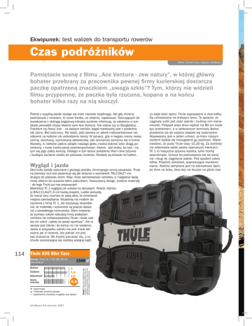 Ekwipunek: test walizek do transportu rowerów Czas podróżników Tekst: Ziemek Cyra, zdjęcia: bikeBoard Pamiętacie scenę z filmu „Ace Ventura - zew natury”, w której główny bohater przebrany za pracownika pewnej firmy kurierskiej dostarcza paczkę opatrzoną znaczkiem „uwaga szkło”? Tym, którzy nie widzieli filmu przypomnę, że paczka była rzucana, kopana a na końcu bohater kilka razy na nią skoczył. Podróż z wysyłką paczki wydaje się mieć niewiele wspólnego. Ale gdy chcemy podróżować z rowerem, to rower trzeba, no właśnie, zapakować. Niemających doświadczenia z obsługą bagażową lotniska życzliwie informuję, że szkolenia w tym dziale prowadził chyba właśnie sam Ace Ventura. Nie ważne czy to Bangladesz, Frankfurt czy Nowy Jork - na każdym lotnisku bagaż traktowany jest z dokładnie tak samo. Bez szacunku. Pal sześć, jeśli zawiera on jakieś małowartościowe lub odporne na rozbicie lub uszkodzenie rzeczy. W sytuacji, gdy w bagażu mamy naszą cenną, ukochaną, wymuskaną zabaweczkę, taki scenariusz zamienia się w horror. Niestety, w niektóre piękne zakątki naszego globu można dotrzeć tylko drogą powietrzną. I rower trzeba jakoś przetransportować. Karton. Jest dobry, bo tani i na tym się jego zalety kończą. Dlatego w tym teście pokażemy Wam dwie sztywne i budzące zaufanie walizki do przewozu rowerów. Niestety są droższe niż karton. Wygląd i jazda Oba kufry zostały wykonane z grubego plastiku chroniącego cenną zawartość. Thule na pierwszy rzut oka prezentuje się jak skrzynia o wymiarach 76x119x27 cm służąca do przewozu broni. Więc może zainteresować celników, a i bagażowi będą mniej skłonni do rzucania takim pakunkiem. Nowoczesny design, świetne materiały - do tego Thule już nas przyzwyczaił. Bikershop TC 1 wygląda jak walizka na sterydach. Potwór. Wymiary 84x111,6x27,3 cm budzą respekt. Ludzie pomyślą, że macie tony ciuchów ze sobą albo, że zmieniacie miejsce zamieszkania. Wcześniej nie miałem do czynienia z firmą TC 1, ale zaryzykuję stwierdzenie, że materiały i wykonanie są jeszcze lepsze niż u szwedzkiego konkurenta. Mam wrażenie, że wymiary walizki wzbudzą mniej podejrzeń celników niż militarnopodobny Thule i może uda się nie uiścić „opłaty za sprzęt sportowy”. Ale to zawsze jest loteria i do końca nic nie wiadomo. Jazda w przypadku walizki nie jest może tak ważna jak w rowerze, ale jednak nie jest bez znaczenia. Bo trudno poruszać się, z co chwila wywracającą się walizką ważącą bądź Thule 836 Bike Case Kontakt: Thule, tel. 0-32 281-95-03, www.thule.pl Budowa 1599 zł Opłacalność 5 5,5 2,5 Ocena końcowa 4,8 Działanie pojemność materiały świetnej jakości spasowanie obudowy mogłoby być lepsze bi k eBoar d #5 czerwiec 2007 Uwaga! Tekst jest integralną częścią testu. Wnioskowanie tylko na podstawie punktacji może prowadzić do błędów w interpretacji 114 co bądź dość sporo. Thule wyposażono w dwa kółka. Są umieszczone na krótszym boku. To sprawia, że ciągnięty kufer jest dość szeroki i trudniej nim manewrować. Przejazd przez drzwi węższe niż 80 cm może być problemem, a w zatłoczonym terminalu Balice przedarcie się do wejścia okazało się koszmarem. Wyposażony jest w jeden uchwyt, za który niższym osobom będzie się niewygodnie go podnosić. Warto wiedzieć, że pusty Thule waży 15,35 kg. Za zamknięcie odpowiada sześć pasów zapinanych klamrami. TC 1 to klasyczna sztywna walizka, tylko trochę przerośnięta. Uchwyt do podnoszenia ma na szczycie i drugi do ciągnięcia walizki. Pod spodem cztery kółka. Przednie obrotowe, poprawiające manewrowanie. Walizka zamykana jest na zatrzaskowe łapki, po dwie na boku, dwa razy na kluczyk na górze oraz