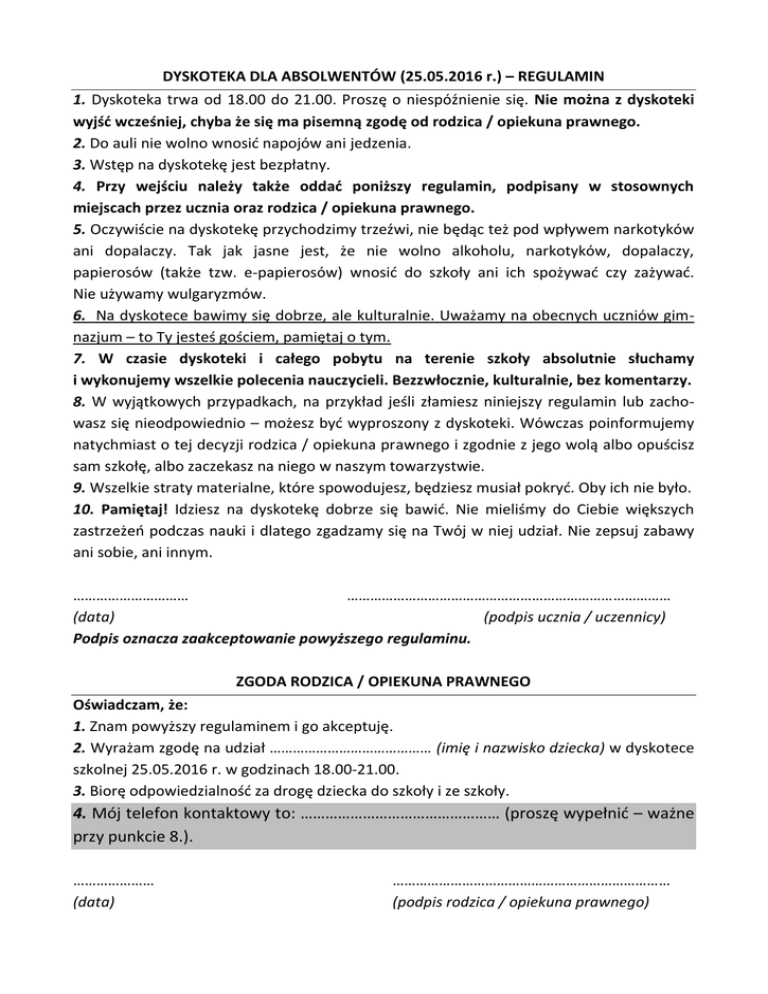 DYSKOTEKA DLA ABSOLWENTÓW (25.05.2016 r.) – REGULAMIN 1. Dyskoteka trwa od 18.00 do 21.00. Proszę o niespóźnienie się. Nie można z dyskoteki wyjść wcześniej, chyba że się ma pisemną zgodę od rodzica / opiekuna prawnego. 2. Do auli nie wolno wnosić napojów ani jedzenia. 3. Wstęp na dyskotekę jest bezpłatny. 4. Przy wejściu należy także oddać poniższy regulamin, podpisany w stosownych miejscach przez ucznia oraz rodzica / opiekuna prawnego. 5. Oczywiście na dyskotekę przychodzimy trzeźwi, nie będąc też pod wpływem narkotyków ani dopalaczy. Tak jak jasne jest, że nie wolno alkoholu, narkotyków, dopalaczy, papierosów (także tzw. e-papierosów) wnosić do szkoły ani ich spożywać czy zażywać. Nie używamy wulgaryzmów. 6. Na dyskotece bawimy się dobrze, ale kulturalnie. Uważamy na obecnych uczniów gimnazjum – to Ty jesteś gościem, pamiętaj o tym. 7. W czasie dyskoteki i całego pobytu na terenie szkoły absolutnie słuchamy i wykonujemy wszelkie polecenia nauczycieli. Bezzwłocznie, kulturalnie, bez komentarzy. 8. W wyjątkowych przypadkach, na przykład jeśli złamiesz niniejszy regulamin lub zachowasz się nieodpowiednio – możesz być wyproszony z dyskoteki. Wówczas poinformujemy natychmiast o tej decyzji rodzica / opiekuna prawnego i zgodnie z jego wolą albo opuścisz sam szkołę, albo zaczekasz na niego w naszym towarzystwie. 9. Wszelkie straty materialne, które spowodujesz, będziesz musiał pokryć. Oby ich nie było. 10. Pamiętaj! Idziesz na dyskotekę dobrze się bawić. Nie mieliśmy do Ciebie większych zastrzeżeń podczas nauki i dlatego zgadzamy się na Twój w niej udział. Nie zepsuj zabawy ani sobie, ani innym. ………………………… ………………………………………………………………………… (data) (podpis ucznia / uczennicy) Podpis oznacza zaakceptowanie powyższego regulaminu. ZGODA RODZICA / OPIEKUNA PRAWNEGO Oświadczam, że: 1. Znam powyższy regulaminem i go akceptuję. 2. Wyrażam zgodę na udział …………………………………… (imię i nazwisko dziecka) w dyskotece szkolnej 25.05.2016 r. w godzinach 18.00-21.00. 3. Biorę odpowiedzialność za drogę dziecka do szkoły i ze szkoły. 4. Mój telefon kontaktowy to: ………………………………………… (proszę wypełnić – ważne przy punkcie 8.). ………………… (data) ……………………………………………………………… (podpis rodzica / opiekuna prawnego)