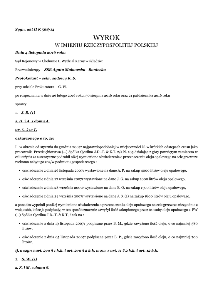 Sygn. akt II K 568/14 WYROK W IMIENIU RZECZYPOSPOLITEJ POLSKIEJ Dnia 4 listopada 2016 roku Sąd Rejonowy w Chełmnie II Wydział Karny w składzie: Przewodniczący – SSR Agata Makowska - Boniecka Protokolant – sekr. sądowy K. S. przy udziale Prokuratora – G. W. po rozpoznaniu w dniu 26 lutego 2016 roku, 30 sierpnia 2016 roku oraz 21 października 2016 roku sprawy: 1. J. B. (1) s. H. i A. z domu A. ur. (...) w T. oskarżonego o to, że: I. w okresie od stycznia do grudnia 2007r najprawdopodobniej w miejscowości N. w krótkich odstępach czasu jako pracownik Przedsiębiorstwa (...) Spółka Cywilna J.D.-T. & K.T. z/s N. 105 działając z góry powziętym zamiarem w celu użycia za autentyczne podrobił niżej wymienione oświadczenia o przeznaczeniu oleju opałowego na cele grzewcze rzekomo nabytego z w/w podmiotu gospodarczego : • oświadczenie z dnia 26 listopada 2007r wystawione na dane A. P. na zakup 4000 litrów oleju opałowego, • oświadczenie z dnia 27 września 2007r wystawione na dane J. G. na zakup 1000 litrów oleju opałowego, • oświadczenie z dnia 28 września 2007r wystawione na dane E. O. na zakup 1500 litrów oleju opałowego, • oświadczenie z dnia 24 września 2007r wystawione na dane J. S. (1) na zakup 1800 litrów oleju opałowego, a ponadto wypełnił poniżej wymienione oświadczenia o przeznaczeniu oleju opałowego na cele grzewcze niezgodnie z wolą osób, które je podpisały, w ten sposób znacznie zawyżył ilość zakupionego przez te osoby oleju opałowego z PW (...) Spółka Cywilna J.D.-T. & K.T., i tak na : • oświadczenie z dnia 19 listopada 2007r podpisane przez B. M., gdzie zawyżono ilość oleju, o co najmniej 380 litrów, • oświadczenie z dnia 05 listopada 2007r podpisane przez B. P., gdzie zawyżono ilość oleju, o co najmniej 700 litrów, tj. o czyn z art. 270 § 1 k.k. i art. 270 § 2 k.k. w zw. z art. 11 § 2 k.k. i art. 12 k.k. 2. S. W. (1) s. Z. i M. z domu S. ur. (...) w Ś. oskarżonego o to, że: 1. w okresie od stycznia do grudnia 2007r najprawdopodobniej w miejscowości N. w krótkich odstępach czasu jako pracownik Przedsiębiorstwa (...) Spółka Cywilna J.D.-T. & K.T. z/s N. 105 działając z góry powziętym zamiarem w celu użycia za autentyczne podrobił niżej wymienione oświadczenia o przeznaczeniu oleju opałowego na cele grzewcze rzekomo nabytego z w/w podmiotu gospodarczego: • oświadczenie z dnia 29 stycznia 2007r wystawione na dane A. Ł. na zakup 100 litrów oleju opałowego, • oświadczenie z dnia 12 września 2007r wystawione na dane S. J. na zakup 2800 litrów oleju opałowego, • oświadczenie z dnia 08 sierpnia 2007r wystawione na dane W. P. na zakup 1600 litrów oleju opałowego, • oświadczenie z dnia 05 czerwca 2007r wystawione na dane K. G. na zakup 1400 litrów oleju opałowego, • oświadczenie z dnia 30 lipca 2007r wystawione na dane Parafia Rzymskokatolicka z/s Z. na zakup 4500 litrów oleju opałowego, • oświadczenie ponadto dnia 13 kwietnia 2007r wystawione na dane A. O. (1) na zakup 1200 litrów oleju opałowego, a ponadto wypełnił poniżej wymienione oświadczenia o przeznaczeniu oleju opałowego na cele grzewcze niezgodnie z wolą osób, które je podpisały, w ten sposób znacznie zawyżył ilość zakupionego przez te osoby oleju opałowego z PW (...) Spółka Cywilna J. D.-T. & K.T., i tak na: • oświadczenie z dnia 31 sierpnia 2007r podpisane przez S. J., gdzie zawyżono ilość oleju, o co najmniej 1400 litrów, • oświadczenie z dnia 27 lipca 2007r podpisane przez S. J., gdzie zawyżono ilość oleju, o co najmniej 1000 litrów, • oświadczenie z dnia 21 listopada 2007r podpisane przez T. B., gdzie zawyżono ilość oleju, o co najmniej 1450 litrów, • oświadczenie z dnia 26 października 2007r podpisane przez R. G., gdzie zawyżono ilość oleju, o co najmniej 2200 litrów, tj. o czyn z art. 270 § 1 k.k. i art. 270 § 2 k.k. w zw. z art. 11 § 2 k.k. i art. 12 k.k. 3. J. S. (2) s. H. i M. z domu G. ur. (...) w C. oskarżonego o to, że: 2. w okresie od stycznia do grudnia 2007r najprawdopodobniej w miejscowości N. w krótkich odstępach czasu jako pracownik Przedsiębiorstwa (...) Spółka Cywilna J.D.-T. & K.T. z/ s N. 105 działając z góry powziętym zamiarem w celu użycia za autentyczne podrobił niżej wymienione oświadczenia o przeznaczeniu oleju opałowego na cele grzewcze rzekomo nabytego z w/w podmiotu gospodarczego: • oświadczenie z dnia 25 października 2007r wystawione na dane S. J. na zakup 3000 litrów oleju opałowego, • oświadczenie z dnia 19 września 2007r wystawione na dane S. J. na zakup 3000 litrów oleju opałowego, • oświadczenie z dnia 06 sierpnia 2007r wystawione na dane S. J. na zakup 3500 litrów oleju opałowego, • oświadczenie z dnia 12 lipca 2007r wystawione na dane S. J. na zakup 4000 litrów oleju opałowego, • oświadczenie z dnia 23 kwietnia 2007r wystawione na dane S. J. na zakup 2500 litrów oleju opałowego, • oświadczenie z dnia 31 stycznia 2007r wystawione na dane S. J. na zakup 4500 litrów oleju opałowego, • oświadczenie z dnia 30 października 2007r wystawione na dane A. O. (1) na zakup 2500 litrów oleju opałowego, • oświadczenie z dnia 30 sierpnia 2007r wystawione na dane J. Z. na zakup 3000 litrów oleju opałowego, • oświadczenie z dnia 30 sierpnia 2007r wystawione na dane K. K. (1) na zakup 2100 litrów oleju opałowego, a ponadto wypełnił poniżej wymienione oświadczenia o przeznaczeniu oleju opałowego na cele grzewcze niezgodnie z wolą osób, które je podpisały, w ten sposób znacznie zawyżył ilość zakupionego przez te osoby oleju opałowego z PW (...) Spółka Cywilna J.D.-T. & K.T., i tak na : • oświadczenie z dnia 13 października 2007r podpisane przez S. J., gdzie zawyżono ilość oleju, o co najmniej 1500 litrów, • oświadczenie z dnia 11 czerwca 2007r podpisane przez S. J., gdzie zawyżono ilość oleju, o co najmniej 200 litrów, • oświadczenie z dn