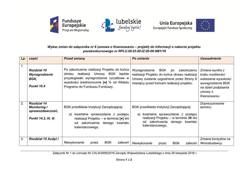 Wykaz zmian do załącznika nr 6 (umowa o finansowaniu – projekt) do Informacji o naborze projektu pozakonkursowego nr RPLU.09.03.00-IZ.00-06-NB1/16 Lp. część 1. Rozdział 10 Wynagrodzenie BGK, Punkt 10.4 2. Rozdział 14 Monitoring i sprawozdawczość, Punkt 14.2, lit. 4) 3. Rozdział 15 Audyt i Przed zmianą Po zmianie Uzasadnienie Po zakończeniu realizacji Projektu do końca okresu realizacji Umowy BGK będzie przysługiwało wynagrodzenie ryczałtowe w wysokości średniorocznie [●] % od Wkładu Programu do Funduszu Funduszy. Wynagrodzenie BGK po zakończeniu realizacji Projektu do końca okresu realizacji Umowy zostanie uzgodnione przez Strony 6 miesięcy przed końcem realizacji projektu. Zmiana wynika z braku możliwości wskazania wysokości wynagrodzenia BGK na dzień podpisania umowy o finansowaniu. BGK przedkłada Instytucji Zarządzającej: BGK przedkłada Instytucji Zarządzającej: a) kwartalne sprawozdanie z postępu realizacji Projektu – w terminie [●] dni od zakończenia danego kwartału kalendarzowego, Niewykonanie przez BGK a) kwartalne sprawozdanie z postępu realizacji Projektu – w terminie 30 dni od zakończenia danego kwartału kalendarzowego, zaleceń Niewykonanie przez BGK Zmiana korzystna na zaleceń Wnioskodawcy. Załącznik Nr 1 do uchwały Nr CXLIII/2959/2016 Zarządu Województwa Lubelskiego z dnia 29 listopada 2016 r. Strona 1 z 2 Doprecyzowanie terminu. kontrola, Punkt 15.4 pokontrolnych w terminie wskazanym w zaleceniach pokontrolnych lub nieprzedstawienie uzasadnienia ich niewykonania w tym terminie wraz z propozycją nowego terminu wprowadzenia zmian wynikających z zaleceń pokontrolnych będzie podstawą do rozwiązania Umowy w trybie natychmiastowym pokontrolnych w terminie wskazanym w zaleceniach pokontrolnych lub nieprzedstawienie uzasadnienia ich wykonania w tym terminie wraz z propozycją nowego terminu wprowadzenia zmian wynikających z zaleceń pokontrolnych może być podstawą do rozwiązania Umowy. Załącznik Nr 1 do uchwały Nr CXLIII/2959/2016 Zarządu Województwa Lubelskiego z dnia 29 listopada 2016 r. Strona 2 z 2 Brzmienie zapisu podyktowane tym, iż w opisanym przypadku rozwiązanie umowy jest możliwością, a nie koniecznością.