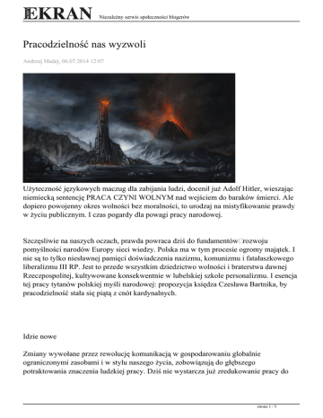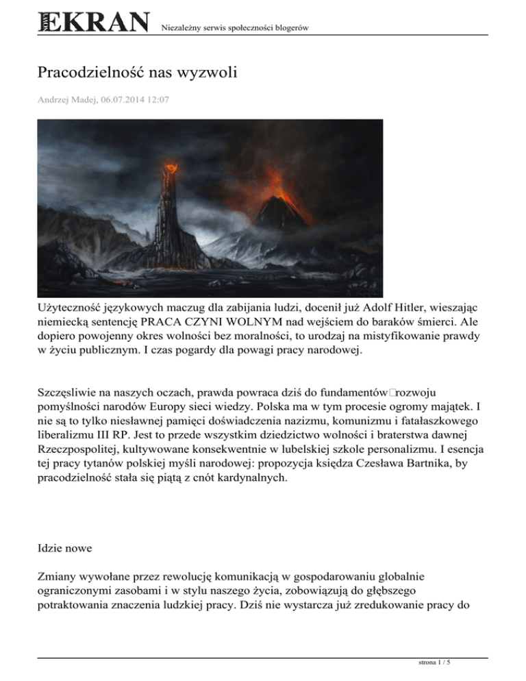 Niezależny serwis społeczności blogerów Pracodzielność nas wyzwoli Andrzej Madej, 06.07.2014 12:07 Użyteczność językowych maczug dla zabijania ludzi, docenił już Adolf Hitler, wieszając niemiecką sentencję PRACA CZYNI WOLNYM nad wejściem do baraków śmierci. Ale dopiero powojenny okres wolności bez moralności, to urodzaj na mistyfikowanie prawdy w życiu publicznym. I czas pogardy dla powagi pracy narodowej. Szczęsliwie na naszych oczach, prawda powraca dziś do fundamentów rozwoju pomyślności narodów Europy sieci wiedzy. Polska ma w tym procesie ogromy majątek. I nie są to tylko niesławnej pamięci doświadczenia nazizmu, komunizmu i fatałaszkowego liberalizmu III RP. Jest to przede wszystkim dziedzictwo wolności i braterstwa dawnej Rzeczpospolitej, kultywowane konsekwentnie w lubelskiej szkole personalizmu. I esencja tej pracy tytanów polskiej myśli narodowej: propozycja księdza Czesława Bartnika, by pracodzielność stała się piątą z cnót kardynalnych. Idzie nowe Zmiany wywołane przez rewolucję komunikacją w gospodarowaniu globalnie ograniczonymi zasobami i w stylu naszego życia, zobowiązują do głębszego potraktowania znaczenia ludzkiej pracy. Dziś nie wystarcza już zredukowanie pracy do strona 1 / 5 Niezależny serwis społeczności blogerów perspektywy produktywności. Perspektywy właściwej dla gospodarki wymiennej, dla zredukowania człowieka do ról producenta i konsumenta. Pomyślność narodów w Europie sieci wiedzy, zależeć będzie od pracy świadczonej dla bezpośredniego zaspokojenia potrzeby własnych lub swoich bliskich. Dobroczynność tego wysiłku pracy, wyprowadzona musi być wprost z poczucia godności człowieka. Tak jak to ujmuje lubelska szkoła personalizmu wprowadzając pracodzielność do kanonu cnót podstawowych formacji młodego człowieka. Pozwalają już na to zmiany zachodzące w sposobach uczeniach, uspołeczniające odpowiedzialność w systemie powszechnej edukacji. Wypracowane przez filozofów potrzeby zmian w celach wychowania do pracy, znajdują już zatem praktyczne potwierdzenie. Coraz lepiej widać, że korzystanie ze spersonalizowanych usług społecznych w naszych domach wymagać będzie nowych umiejętności i chęci podejmowania wysiłku wykorzystania ich dla siebie i dla swoich bliskich. Wymagać zatem będzie nowych form samokształcenia w rodzinie kompetencji do pracy solidarnej. Samokształcenia, bowiem różnorodność potrzeb usług społecznych (a jeszcze lepiej „usług rodzinnych”) w konkretnych rodzinach, nie pozwoli na zaprogramowanie ich organizacji jako sformalizowanego, opiekuńczego systemu. Administracja państwa, działając poprzez prywatne lub rządowe instytucje kultury, będzie mogła pomocniczo wesprzeć tylko te domy, w których potrzeba takich kompetencji zostanie dostrzeżona i podjęta wysiłkiem pracy solidarnej. A jak to robicie Zaczynamy systematyzować swoje pomysły. Krakowska propozycja wprowadzenia nowego systemu aktywizacji domowej edukacji pracy solidarnej obejmuje nie tylko specjalistyczne kompetencje dla leczenia, uczenia, gospodarowania, ale przede wszystkim dotyczy formacji dla pracy jako cnoty. Za lubelską szkołą personalizmu nazywamy tę cnotę pracodzielnością i uznajemy za kluczową postawę dla przyszłości Polski w Europie narodów bez granic. Metodę formacji tej postawy poprzez doświadczanie konkretnej pracy wobec osób potrzebujących proponujemy nazwać Pedagogiką pracy. Wspieranie rozwoju specjalistycznych kompetencji proponujemy skupiać w przedmiotach medycznym, historycznym i ekonomicznym. Przedmiotach na tyle zbliżonych do systematyki nauk humanistycznych powszechnego szkolnictwa, że dzięki wykorzystującej strona 2 / 5 Niezależny serwis społeczności blogerów cyfrowe biblioteki pamięci Pedagogice pytań, zarządzanie edukacją domową zbliży się do nadzoru nad edukacją szkolną. Powiązanie obu nowych metod uczenia w całościowy system samokształcenie w rodzinie wymaga prowadzenia rejestru zamierzeń i efektów edukacyjnych. Koniecznym jest zatem dopełnienie obu pedagogik Dziennikiem rozwoju edukacyjnego dziecka w metodzie nazwanej przez nas Pedagogiką solidarności. Wszystkie propozycje odwoływać się mogą nie tylko do rozpoznań aksjologicznych i ustaleń pojęciowych lubelskiej szkoły personalizmu, ale również do tradycji Rzeczpospolitej. Opisanej w dobroczynności XV wiecznej Unii horodelskiej, w samorządności XIX wiecznych rolniczych towarzystw Wielkopolski i Małopolski, czy w solidarności XX wiecznej Polskiej drogi do Trzeciej Niepodległości. Współczesnym uwarunkowaniem przedstawianych propozycji są zmiany zachodzące w paradygmacie uczenia i w systemie edukacji. Otwarte zasoby wiedzy, interaktywna diagnostyka, wreszcie potrzeby edukacji przez całe życie w gospodarce wiedzy, zmienią doktrynę polityki rozwoju wiedzy. Doktryna Personalnej edukacji powinna usprawnić warunki korzystania z nowych narzędzi i technologii uczącym się w każdym wieku. Powinna pomóc osobom bliskim, w solidarnym mobilizowaniu tego wysiłku. Pedagogika solidarności Inicjatorzy Krakowskiego Systemu Aktywizacji Domowej Edukacji Pracy Solidarnej liczą zatem na wprowadzenie do praktyki polskich rodzin i instytucji kultury dwóch nowych metod pedagogicznych Pedagogiki pracy i Pedagogiki pytań. Proponujemy dla nich łączną nazwę Pedagogika solidarności. Dla inicjacji ich wykorzystania i zebrania doświadczeń proponuje się współdziałanie w trzech dziedzinach świadczenia pracy solidarnej: medycznym, muzealnym i ekonomicznym. W dziedzinie medycznej proponujemy skupienie się na potrzebach wsparcia osób chorych przewlekle. Cyfrowe narzędzia m-zdrowia czy platformy doradztwa pomagają w zidentyfikowaniu problemu. To pozwala na wskazanie potrzeb, ale dla zaspokojenia konieczna jest jeszcze praca konkretnego człowieka. W dziedzinie muzealnej proponujemy skupienie się na kultywowaniu identyfikacyjnych funkcji