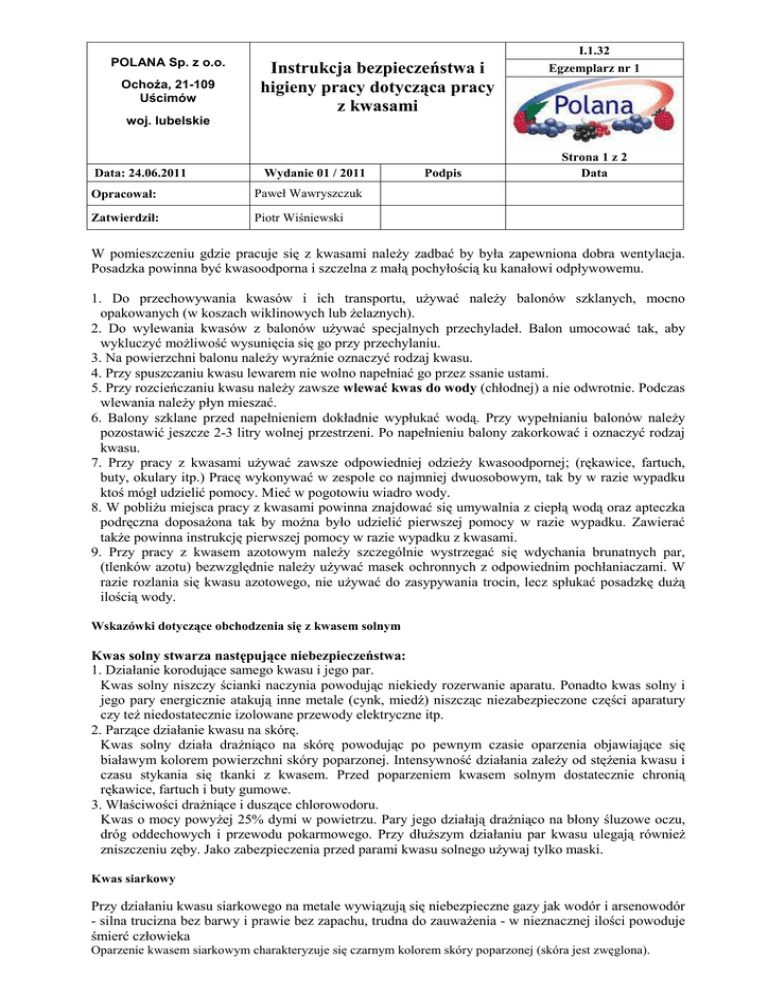 POLANA Sp. z o.o. OchoŜa, 21-109 Uścimów Instrukcja bezpieczeństwa i higieny pracy dotycząca pracy z kwasami I.1.32 Egzemplarz nr 1 woj. lubelskie Data: 24.06.2011 Wydanie 01 / 2011 Opracował: Paweł Wawryszczuk Zatwierdził: Piotr Wiśniewski Podpis Strona 1 z 2 Data W pomieszczeniu gdzie pracuje się z kwasami naleŜy zadbać by była zapewniona dobra wentylacja. Posadzka powinna być kwasoodporna i szczelna z małą pochyłością ku kanałowi odpływowemu. 1. Do przechowywania kwasów i ich transportu, uŜywać naleŜy balonów szklanych, mocno opakowanych (w koszach wiklinowych lub Ŝelaznych). 2. Do wylewania kwasów z balonów uŜywać specjalnych przechyladeł. Balon umocować tak, aby wykluczyć moŜliwość wysunięcia się go przy przechylaniu. 3. Na powierzchni balonu naleŜy wyraźnie oznaczyć rodzaj kwasu. 4. Przy spuszczaniu kwasu lewarem nie wolno napełniać go przez ssanie ustami. 5. Przy rozcieńczaniu kwasu naleŜy zawsze wlewać kwas do wody (chłodnej) a nie odwrotnie. Podczas wlewania naleŜy płyn mieszać. 6. Balony szklane przed napełnieniem dokładnie wypłukać wodą. Przy wypełnianiu balonów naleŜy pozostawić jeszcze 2-3 litry wolnej przestrzeni. Po napełnieniu balony zakorkować i oznaczyć rodzaj kwasu. 7. Przy pracy z kwasami uŜywać zawsze odpowiedniej odzieŜy kwasoodpornej; (rękawice, fartuch, buty, okulary itp.) Pracę wykonywać w zespole co najmniej dwuosobowym, tak by w razie wypadku ktoś mógł udzielić pomocy. Mieć w pogotowiu wiadro wody. 8. W pobliŜu miejsca pracy z kwasami powinna znajdować się umywalnia z ciepłą wodą oraz apteczka podręczna doposaŜona tak by moŜna było udzielić pierwszej pomocy w razie wypadku. Zawierać takŜe powinna instrukcję pierwszej pomocy w razie wypadku z kwasami. 9. Przy pracy z kwasem azotowym naleŜy szczególnie wystrzegać się wdychania brunatnych par, (tlenków azotu) bezwzględnie naleŜy uŜywać masek ochronnych z odpowiednim pochłaniaczami. W razie rozlania się kwasu azotowego, nie uŜywać do zasypywania trocin, lecz spłukać posadzkę duŜą ilością wody. Wskazówki dotyczące obchodzenia się z kwasem solnym Kwas solny stwarza następujące niebezpieczeństwa: 1. Działanie korodujące samego kwasu i jego par. Kwas solny niszczy ścianki naczynia powodując niekiedy rozerwanie aparatu. Ponadto kwas solny i jego pary energicznie atakują inne metale (cynk, miedź) niszcząc niezabezpieczone części aparatury czy teŜ niedostatecznie izolowane przewody elektryczne itp. 2. Parzące działanie kwasu na skórę. Kwas solny działa draŜniąco na skórę powodując po pewnym czasie oparzenia objawiające się białawym kolorem powierzchni skóry poparzonej. Intensywność działania zaleŜy od stęŜenia kwasu i czasu stykania się tkanki z kwasem. Przed poparzeniem kwasem solnym dostatecznie chronią rękawice, fartuch i buty gumowe. 3. Właściwości draŜniące i duszące chlorowodoru. Kwas o mocy powyŜej 25% dymi w powietrzu. Pary jego działają draŜniąco na błony śluzowe oczu, dróg oddechowych i przewodu pokarmowego. Przy dłuŜszym działaniu par kwasu ulegają równieŜ zniszczeniu zęby. Jako zabezpieczenia przed parami kwasu solnego uŜywaj tylko maski. Kwas siarkowy Przy działaniu kwasu siarkowego na metale wywiązują się niebezpieczne gazy jak wodór i arsenowodór - silna trucizna bez barwy i prawie bez zapachu, trudna do zauwaŜenia - w nieznacznej ilości powoduje śmierć człowieka Oparzenie kwasem siarkowym charakteryzuje się czarnym kolorem skóry poparzonej (skóra jest zwęglona). POLANA Sp. z o.o. OchoŜa, 21-109 Uścimów Instrukcja bezpieczeństwa i higieny pracy dotycząca pracy z kwasami I.1.32 Egzemplarz nr 1 woj. lubelskie Data: 24.06.2011 Wydanie 01 / 2011 Opracował: Paweł Wawryszczuk Zatwierdził: Piotr Wiśniewski Podpis Strona 2 z 2 Data Kwas azotowy Przy pracy z kwasem azotowym naleŜy szczególnie wystrzegać się wdychania brunatnych par (tlenków azotu). Pracownik powinien uŜyć maskę ochronną z odpowiednim pochłaniaczem. W razie rozlania kwasu azotowego spłukać miejsce rozlania duŜą ilością wody. Nie wolno przesypywać miejsca zalania trocinami. Oparzenie kwasem azotowym charakteryzuje się Ŝółtym kolorem skóry oparzonej. Czyszczenie zbiorników po kwasach Mycie i czyszczenie zbiorników po kwasach (szczególnie po kwasie azotowym) przedstawia powaŜne niebezpieczeństwo zatrucia i poparzenia. NaleŜy przestrzegać następujących środków ostroŜności: - przed przystąpieniem do pracy zbiornik całkowicie opróŜnić, - zbiornik dokładnie przewietrzyć przez przedmuchiwanie powietrzem wprowadzanym od dołu zbiornika (poniewaŜ gazy pozostające w zbiorniku są cięŜsze od powietrza), po czym od dołu zobojętnić resztę kwasu za pomocą sody. Roztwór ten pozostawić w zbiorniku przez kilka godzin. Po wykonaniu powyŜszych czynności wykonać czyszczenie i przemywanie przeprowadzić, o ile to moŜliwe z zewnątrz za pomocą strumienia wody i odpowiednio długich szczotek lub skrobaczek. Pracownik zatrudniony przy czyszczeniu zbiornika powinien być ubrany w odzieŜ kwasoodporną i mieć maskę z pochłaniaczem przeciw parom kwasu lub maskę z doprowadzeniem świeŜego powietrza. Nie wolno czyścić zbiornika pojedynczemu robotnikowi. Gdy pracownik zmuszony jest wejść do środka musi być zabezpieczony linką, a drugi koniec linki powinien trzymać stojący na zewnątrz pracownik. To on w razie potrzeby udzieli natychmiastowej pomocy w razie omdlenia lub zasłabnięcia pracującego. Postępowanie w razie poparzenia lub wypicia kwasu: Wypicie kwasu, objawy: - silny ból w jamie ustnej, przełyku, Ŝołądku, - wymioty, - moŜe dojść do przedziurawienia przełyku i Ŝołądka. Występuje wtedy krwotok i cięŜkie uszkodzenie narządów wewnętrznych, - silny ból moŜe być przyczyną wystąpienia wstrząsu. NIE WOLNO PROWOKOWAC WYMIOTOW Pierwsza pomoc Oparzenia. Przemyć oparzoną skórę duŜą ilością