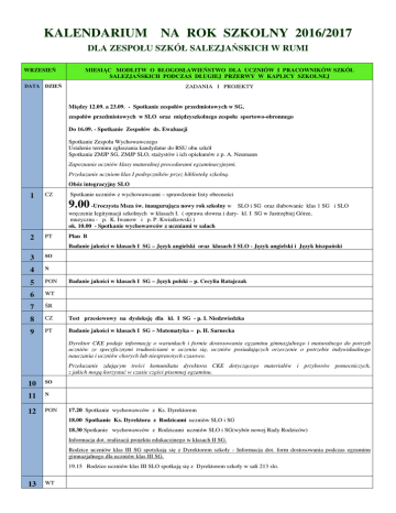 KALENDARIUM NA ROK SZKOLNY 2016/2017 DLA ZESPOŁU SZKÓŁ SALEZJAŃSKICH W RUMI WRZESIEŃ MIESIĄC MODLITW O BŁOGOSŁAWIEŃSTWO DLA UCZNIÓW I PRACOWNIKÓW SZKÓŁ SALEZJAŃSKICH PODCZAS DŁUGIEJ PRZERWY W KAPLICY SZKOLNEJ DATA DZIEŃ ZADANIA I PROJEKTY Między 12.09. a 23.09. - Spotkanie zespołów przedmiotowych w SG, zespołów przedmiotowych w SLO oraz międzyszkolnego zespołu sportowo-obronnego Do 16.09. - Spotkanie Zespołów ds. Ewaluacji Spotkanie Zespołu Wychowawczego Ustalenie terminu zgłaszania kandydatur do RSU obu szkół Spotkanie ZMJP SG, ZMJP SLO, stażystów i ich opiekunów z p. A. Neumann Zapoznanie uczniów klasy maturalnej procedurami egzaminacyjnymi. Przekazanie uczniom klas I podręczników przez bibliotekę szkolną. Obóz integracyjny SLO 1 CZ Spotkanie uczniów z wychowawcami – sprawdzenie listy obecności 9.00 -Uroczysta Msza św. inaugurująca nowy rok szkolny w SLO i SG oraz ślubowanie klas 1 SG i SLO wręczenie legitymacji szkolnych w klasach I. ( oprawa słowna i dary- kl. I SG w Jastrzębiej Górze, muzyczna - p. K. Iwanow i p. P. Kwiatkowski ) ok. 10.00 - Spotkanie wychowawców z uczniami w salach 2 PT Plan B Badanie jakości w klasach I SG – Język angielski oraz klasach I SLO - Język angielski i Język hiszpański 3 SO 4 N 5 PON 6 WT 7 ŚR 8 CZ Test przesiewowy na dysleksję dla kl. I SG - p. I. Niedzwiedzka 9 PT Badanie jakości w klasach I SG – Matematyka – p. H. Sarnecka Badanie jakości w klasach I SG – Język polski – p. Cecylia Ratajczak Dyrektor CKE podaje informację o warunkach i formie dostosowania egzaminu gimnazjalnego i maturalnego do potrzeb uczniów ze specyficznymi trudnościami w uczeniu się, uczniów posiadających orzeczenie o potrzebie indywidualnego nauczania i uczniów chorych lub niesprawnych czasowo. Przekazanie zdającym treści komunikatu dyrektora CKE dotyczącego materiałów i przyborów pomocniczych, z jakich mogą korzystać w czasie części pisemnej egzaminu. 10 SO 11 N 12 PON 17.20 Spotkanie wychowawców z Ks. Dyrektorem 18.00 Spotkanie Ks. Dyrektora z Rodzicami uczniów SLO i SG 18.30 Spotkanie wychowawców z Rodzicami uczniów SLO i SG(wybór nowej Rady Rodziców) Informacja dot. realizacji projektu edukacyjnego w klasach II SG. Rodzice uczniów klas III SG spotykają się z Dyrektorem szkoły - Informacja dot. form dostosowania podczas egzaminu gimnazjalnego dla uczniów klas III SG. 19.15 Rodzice uczniów klas III SLO spotkają się z Dyrektorem szkoły w sali 213 slo. 13 WT 14 ŚR 15 CZ Ogłoszenie Planu Nadzoru Pedagogicznego w SG i SLO 16 PT Przedstawienie listy kółek pozalekcyjnych ( z podaniem orientacyjnej liczby zainteresowanych SLO i SG celem zatwierdzenia przez Księdza Dyrektora 17 SO 18 N 19 PON 20 WT 21 ŚR 22 CZ 23 PT 24 SO 25 N 26 PON 27 WT 28 ŚR 29 CZ 30 PT kółkiem uczniów) Rada Pedagogiczna godz. 15.30 Podanie terminów zajęć pozalekcyjnych do wiadomości uczniów Instruktaż dla klas III przed próbnymi testami gimnazjalnymi / p. B. Wysocka – Turek / Obchody Europejskiego Dnia Języków Obcych SG - p. M.Drus, p. I. Rydzewska, p. M. Jułkowski SLO – p. J. Wołoszyn - Oszywa, p. J. Szantyr, p. A. Jastrzębska, Ostateczny termin złożenia deklaracji przez uczniów przystępującymi do egzaminu gimnazjalnego z zakresu jakiego języka nowożytnego zdaje ( o ile uczy się w szkole więcej niż jednego jako przedmiotu obowiązkowego). Ostateczny termin złożenia wstępnych deklaracji przez maturzystów