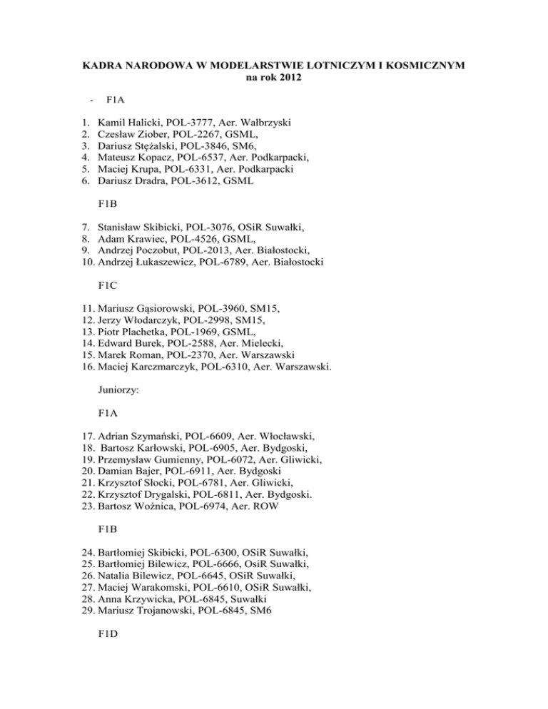 KADRA NARODOWA W MODELARSTWIE LOTNICZYM I KOSMICZNYM na rok 2012 - 1. 2. 3. 4. 5. 6. F1A Kamil Halicki, POL-3777, Aer. Wałbrzyski Czesław Ziober, POL-2267, GSML, Dariusz Stężalski, POL-3846, SM6, Mateusz Kopacz, POL-6537, Aer. Podkarpacki, Maciej Krupa, POL-6331, Aer. Podkarpacki Dariusz Dradra, POL-3612, GSML F1B 7. Stanisław Skibicki, POL-3076, OSiR Suwałki, 8. Adam Krawiec, POL-4526, GSML, 9. Andrzej Poczobut, POL-2013, Aer. Białostocki, 10. Andrzej Łukaszewicz, POL-6789, Aer. Białostocki F1C 11. Mariusz Gąsiorowski, POL-3960, SM15, 12. Jerzy Włodarczyk, POL-2998, SM15, 13. Piotr Plachetka, POL-1969, GSML, 14. Edward Burek, POL-2588, Aer. Mielecki, 15. Marek Roman, POL-2370, Aer. Warszawski 16. Maciej Karczmarczyk, POL-6310, Aer. Warszawski. Juniorzy: F1A 17. Adrian Szymański, POL-6609, Aer. Włocławski, 18. Bartosz Karłowski, POL-6905, Aer. Bydgoski, 19. Przemysław Gumienny, POL-6072, Aer. Gliwicki, 20. Damian Bajer, POL-6911, Aer. Bydgoski 21. Krzysztof Słocki, POL-6781, Aer. Gliwicki, 22. Krzysztof Drygalski, POL-6811, Aer. Bydgoski. 23. Bartosz Woźnica, POL-6974, Aer. ROW F1B 24. Bartłomiej Skibicki, POL-6300, OSiR Suwałki, 25. Bartłomiej Bilewicz, POL-6666, OsiR Suwałki, 26. Natalia Bilewicz, POL-6645, OSiR Suwałki, 27. Maciej Warakomski, POL-6610, OSiR Suwałki, 28. Anna Krzywicka, POL-6845, Suwałki 29. Mariusz Trojanowski, POL-6845, SM6 F1D 30. Jerzy Markiewicz 31. Tomasz Momot 32. Edward Ciapała 33. Jan Dihm 34. Szymon Góralczyk 35. Tomasz Demidowicz F1E seniorzy 36. Stanisław Kubit 37. Franciszek Kańczok 38. Wiesław Dziuba 39. Eugeniusz Słomka Juniorzy 40. Konrad Żurowski 41. Mikołaj Stryja 42. Szymon Morcinek 43. Bartosz Załęcki F2A -seniorzy 44. Paweł Praus, POL-3704, Aer. Śląski 45. Robert Holeczek, POL-6559, Aer. Śląski 46. Artur Miś, POL-6639, SM 2 Wierzawice 47. Piotr Zipzer, POL-6930, Aer. Śląski F2A – Juniorzy 48. Tomasz Sobala, POL-6652, SM 2 Wierzawice 49. Szymon Baran, POL-6736, Aer. Śląski, F2B- seniorzy 50. Krystian Borzęcki, POL-4163, SM 2 Wierzawice 51. Sylwester Kubik, POL-2503, Aer. Warszawski 52. Karol Janik, POL-5894, Aer. Radomski 53. Janusz Węcławiak, POL-1855, Aer. Poznański F2B – junor 54. Jarosław Mięsiak, POL-6373, Aer. Orląt Dęlin, F2C-seniorzy 55. Mariusz Fedan, POL-6655, SM 2 Wierzawice 56. Piotr Sobala, POL-4615, SM 2 Wierzawice 57. Mariusz Brożek, POL-6662, Aer. Częstochowski 58. Ryszard Włodarczyk, POL-547, Aer. Częstochowski 59. Jacek Gołębiowski, POL-6660, Aer. Warszawski 60. Michał Majewski, POL-6659, Aer. Warszawski 61. Krzysztof Piotrowski, POL-6025, Aer. Warszawski 62. Michał Dzikowski, POL-5026, Aer. Warszawski 63. Rafał Brzeziński, POL-4766, Aer. Warszawski 64. Krzysztof Smaga, POL-4767, Aer. Warszawski F2D - seniorzy 65. Marcin Leszczak, POL-4895, SM2 Wierzawice 66. Dariusz Kaczmarek, POL-6280, SM2 Wierzawice F3A 67. Jacek Szczepaniak 68. Adam Dębowski F3B 69. Arkadiusz Morawski 70. Bartłomiej Panikowski 71. Michał Paździor 72. Michał Skarwecki F3J 73. Wojciech Byrski 74. Tomasz Frąk F3J- juniorzy 75. Konrad Partyka F3F 76. Jakub Bury 77. Andrzej Kłusek 78. Bogusław Gryszko 79. Bartłomiej Siudek 80. Jakub Świst 81. Jacek Sierpowicz 82. Ryszard Miśkiewicz F3F- juniorzy 83. Adam Bury 84. Damian Wyrzykowski F3K 85. Adam Siama 86. Jarosław Grzesica 87. Krzysztof Hilbrycht 88. Leszek Małmyga F4C 89. Makowski Robert 90. Wetoszka Adam F5B 91. Grzegorz Porębsk 92. Michał Salamon 93. Jan Ochman Modele kosmiczne S. Klasy S1,3,4,6,9 Małmyga Leszek 94. Łasocha Sławomir 95. Przybytek Krzysztof 96. Szulc Sebastian 97. Arasimowicz Marek 98. Jaros Jakub 99. Fiałkowski Jakub - MŚ J Klasy S5,7 100. 101. 102. 103. 104. Bielecki Marcin Krzywiński Wojciech Bobrowski Wojciech Bujak Marek Goryczka Grzegorz Klasa S8E/P 105. Janisiewicz Paweł 106. Wowry Edward 107. Jaszkim Eryk Przybytek Krzysztof 108. Szwed Artur Bobrowski Wojciech Juniorzy Klasy S1,3,4,6,9 109. Byrtek Szymon 110. 111. 112. 113. Dyba Mateusz Wierzbicki Konrad Sadowski Patryk Biernacki Antoni Klasy S5,7 114. 115. 116. 117. Sułkowski Piotr Kormański Mateusz Przedwolski Hubert Bobrowski Michał Klasa S8D Byrtek Szymon 118. Podołowski Maciej Wierzbicki Konrad Dyba Mateusz 119. Grzywna Tomasz