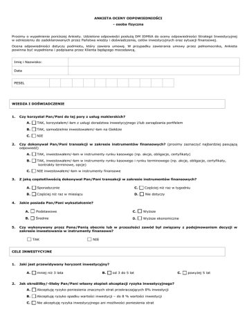 ANKIETA OCENY ODPOWIEDNIOŚCI - osoba fizyczna Prosimy o wypełnienie poniŜszej Ankiety. Udzielone odpowiedzi posłuŜą DM IDMSA do oceny odpowiedniości Strategii Inwestycyjnej w odniesieniu do zadeklarowanych przez Państwa wiedzy i doświadczenia, celów inwestycyjnych oraz sytuacji finansowej. Ocena odpowiedniości dotyczy podmiotu, który zawiera umowę. W przypadku zawierania umowy przez pełnomocnika, Ankieta powinna być wypełniona i podpisana przez Klienta będącego mocodawcą. Imię i Nazwisko: Data PESEL WIEDZA I DOŚWIADCZENIE 1. 2. 3. 4. 5. Czy korzystał Pan/Pani do tej pory z usług maklerskich? A. TAK, korzystałem/-łam z usługi doradztwa inwestycyjnego i/lub zarządzania portfelem B. TAK, samodzielnie inwestowałem/-łam na Giełdzie C. NIE Czy dokonywał Pan/Pani transakcji w zakresie instrumentów finansowych? (prosimy zaznaczyć najbardziej pasującą odpowiedź) A. TAK, inwestowałem/-łam w instrumenty rynku kasowego (np. akcje, obligacje, certyfikaty) B. TAK, inwestowałem/-łam w instrumenty rynku kasowego i rynku terminowego (np. akcje, obligacje, certyfikaty, kontrakty terminowe, opcje) C. NIE inwestowałem/-łam w instrumenty finansowe Z jaką częstotliwością dokonywał Pan/Pani transakcji w zakresie instrumentów finansowych? A. Sporadycznie C. Częściej niŜ raz w tygodniu B. Częściej niŜ raz w miesiącu D. Nie dotyczy Jakie posiada Pan/Pani wykształcenie? A. Podstawowe C. WyŜsze B. Średnie D. WyŜsze ekonomiczne Czy wykonywany przez Pana/Panią obecnie lub w przeszłości zawód był związany z podejmowaniem decyzji w zakresie inwestowania w instrumenty finansowe? TAK NIE CELE INWESTYCYJNE 1. Jaki jest przewidywany horyzont inwestycyjny? A. 2. mniej niŜ 3 lata B. od 3 do 5 lat Jak określiłby/-liłaby Pan/Pani własny stopień akceptacji ryzyka inwestycyjnego? A. Akceptuję ryzyko poniesienia znacznych strat przekraczających 8% inwestycji B. Akceptuję ryzyko spadku wartości inwestycji – do 8 % wartości inwestycji C. Nie akceptuję ryzyka inwestycyjnego ani moŜliwości poniesienia strat C. powyŜej 5 lat 3. Czy przewiduje Pan/Pani regularne wypłaty powierzonych środków z portfela? A. 4. TAK B. NIE C. Trudno powiedzieć Przeznaczenie inwestowanych środków: A. Finansowanie bieŜących wydatków B. Gromadzenie środków z przeznaczeniem na określone cele w przyszłości C. Nieokreślone przeznaczenie SYTUACJA FINANSOWA 1. 2. Jaki udział w Pana/Pani nadwyŜkach finansowych stanowić będą inwestycje w oferowane przez DM instrumenty finansowe? A. do 1/3 B. od 1/3 do 2/3 C. powyŜej 2/3 Prosimy o wskazanie, czy posiada Pan/Pani stałe źródło dochodów, aktywa płynne, inwestycje, nieruchomości oraz stałe zobowiązania finansowe (np. kredyty) oraz jaka jest ich wysokość: Wartość 3. Uzyskuję stałe dochody z tytułu zatrudnienia lub prowadzonej działalności, których miesięczna wysokość netto wynosi: TAK NIE Posiadam aktywa płynne (np. akcje notowane na GPW, lokaty) TAK NIE < 100 tys. zł 100 – 500 tys. zł >500 tys. zł Posiadam inne aktywa i inwestycje TAK NIE < 100 tys. zł 100 – 500 tys. zł >500 tys. zł Posiadam nieruchomości TAK NIE < 100 tys. zł 100 – 500 tys. zł >500 tys. zł Posiadam stałe zobowiązania finansowe, których miesięczna wysokość wynosi: TAK NIE < 100 tys. zł 100 – 500 tys. zł >500 tys. zł < 5 tys. zł 5 – 15 tys. zł > 15 tys. zł Jakie jest źródło pochodzenia środków przekazanych przez Pana/Panią w zarządzanie? A. Dochody z tytułu zatrudnienia C. Spadek/Darowizna B. D. SprzedaŜ firmy/nieruchomości Oszczędności E. Inne __________ OŚWIADCZENIE KLIENTA Potwierdzam rzetelność powyŜszych informacji. Oświadczam, Ŝe otrzymałem/-łam informacje dotyczące usług, które mają być świadczone na podstawie zawieranej umowy. Zapoznano mnie z ryzykiem inwestycyjnym związanym z ww. usługami. Zostałem/-łam poinformowany/-a, Ŝe na skutek nieudzielenia przeze mnie odpowiedzi na powyŜsze pytania DM IDMSA nie jest w stanie dokonać stosownej oceny. ____________________________________________ (Data) _______________________________________________ (Data i podpis pracownika przyjmującego formularz) ___________________________________________ (podpis Klienta)