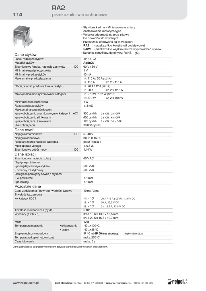 RA2 114 przekaŸniki samochodowe • Styki bez kadmu • Miniaturowe wymiary • Zastosowanie motoryzacyjne • Wysoka odpornoœæ na pr¹d pikowy • Do obwodów drukowanych • PrzekaŸniki oferowane s¹ w wersjach: RA2 - przekaŸnik o konstrukcji podstawowej RAW2 - przekaŸnik o w¹skim rastrze wyprowadzeñ styków • Uznania, certyfikaty, dyrektywy: RoHS, Dane styków Iloœæ i rodzaj zestyków Materia³ styków Znamionowe / maks. napiêcie zestyków Minimalne napiêcie zestyków Minimalny pr¹d zestyków Maksymalny pr¹d za³¹czania DC Obci¹¿alnoœæ pr¹dowa trwa³a zestyku Maksymalna moc ³¹czeniowa w kategorii Minimalna moc ³¹czeniowa Rezystancja zestyków Maksymalna czêstoœæ ³¹czeñ • przy obci¹¿eniu znamionowym w kategorii • przy obci¹¿eniu silnikowym • przy obci¹¿eniu ¿arówkami • bez obci¹¿enia AC1 1P, 1Z, 2Z AgSnO2 60 V / 60 V 1V 10 mA 1P: 110 A / 50 A (1Z/1R) 1Z: 110 A 2Z: 2 x 110 A 1P: 20 A / 12 A (1Z/1R) 1Z: 20 A 2Z: 2 x 12,5 A 1P: 270 W / 162 W (1Z/1R) 1Z: 270 W 2Z: 2 x 168 W 1W ≤ 3 mΩ 2 s ON / 2 s OFF 900 cykli/h 450 cykli/h 2 s ON / 6 s OFF 120 cykli/h 2 s ON / 30 s OFF 36 000 cykli/h Dane cewki Napiêcie znamionowe Napiêcie odpadowe Roboczy zakres napiêcia zasilania Must operate voltage Znamionowy pobór mocy DC DC 5...48 V DC: ≥ 0,15 Un patrz Tabela 1 ≤ 0,6 Un 1,44 W Dane izolacji Znamionowe napiêcie izolacji Napiêcie probiercze • pomiêdzy cewk¹ a stykami • przerwy zestykowej Odleg³oœæ pomiêdzy cewk¹ a stykami • w powietrzu • po izolacji 60 V AC 500 V AC 500 V AC ≥ 1 mm ≥ 1 mm Pozosta³e dane Czas zadzia³ania / powrotu (wartoœci typowe) Trwa³oœæ ³¹czeniowa • w kategorii DC1 Trwa³oœæ mechaniczna (cykle) Wymiary (a x b x h) 10 ms / 3 ms 1P: > 105 20 A / 12 A (1Z/1R), 13,5 V DC 1Z: > 105 20 A, 13,5 V DC 2Z: > 105 2 x 12,5 A, 13,5 V DC > 107 IP 00: 18,6 x 13,0 x 18,5 mm IP 40: 20,5 x 15,3 x 19,7 mm Masa Temperatura otoczenia Stopieñ ochrony obudowy Temperatura k¹pieli lutowniczej Czas lutowania • sk³adowania • pracy 12 g -40...+100 oC -40...+85 oC IP 40 lub IP 00 (bez obudowy) maks. 270 oC maks. 5 s wg PN-EN 60529 Dane zaznaczone pogrubionym drukiem dotycz¹ standardowych wykonañ przekaŸników. www.relpol.com.pl Dzia³ Marketingu Tel./Fax +48 68 47 90 830 • Wsparcie Techniczne Tel. +48 68 47 90 820 RA2 przekaŸniki samochodowe 115 Dane cewki - wykonanie napiêciowe, zasilanie pr¹dem sta³ym Napiêcie znamionowe V DC Kod cewki 1005 1006 1009 1012 1015 1018 1024 1048 Rezystancja cewki ± 10% przy 20°C W 5 6 9 12 15 18 24 48 Tabela 1 Roboczy zakres napiêcia zasilania przy 85°C V DC maks. min. 18 24 55 100 152 230 390 1 590 4,0 4,8 7,2 9,6 12,0 14,4 19,2 38,4 6,6 8,0 12,0 16,0 20,0 23,9 31,9 63,8 Dane zaznaczone pogrubionym drukiem dotycz¹ standardowych wykonañ przekaŸników. Schematy po³¹czeñ (widok od strony wyprowadzeñ) Wyprowadzenia przekaŸnika: c, d, e, f - 0,6 x 1,4 mm a - 0,6 x 1,0 mm 82 2 zwierne 83 1 prze³¹czny lewy 85 1 prze³¹czny prawy + 1 zwierny 89 1 prze³¹czny lewy + 1 zwierny Maksymalna zdolnoœæ ³¹czeniowa Wykres 1 dla pr¹du sta³ego. Obci¹¿enie rezystancyjne DC1 Napiêcie ³¹czeniowe [V] Wymiary 81 1 prze³¹czny prawy b - 1,0 x 1,5 mm % pr¹du ³¹czeniowego I c max Dzia³ Marketingu Tel./Fax +48 68 47 90 830 • Wsparcie Techniczne Tel. +48 68 47 90 820 www.relpol.com.pl RA2 przekaŸniki samochodowe 116 Monta¿ PrzekaŸniki RA2 przeznaczone s¹ do bezpoœredniego lutowania w obwodach drukowanych. Oznaczenia kodowe do zamówieñ Stopieñ ochrony obudowy Typ Materia³ styków Iloœæ i rodzaj zestyków Sposób pod³¹czenia Kod cewki patrz Tabela 1 str. 115 Materia³ styków 30 - AgSnO2 Iloœæ i rodzaj zestyków 82 - 2 zwierne 81 - 1 prze³¹czny prawy 83 - 1 prze³¹czny lewy 85 - 1 prze³¹czny prawy + 1 zwierny 89 - 1 prze³¹czny lewy + 1 zwierny Stopieñ ochrony obudowy 1 - bez obudowy, wykonanie IP 00 2 - w obudowie, wykonanie IP 40 Sposób pod³¹czenia 5 - do obwodów drukowanych Przyk³ady kodowania: RA2-3081-15-1012 RAW2-3082-25-1024 www.relpol.com.pl przekaŸnik RA2, materia³ styków AgSnO2, z jednym zestykiem prze³¹cznym prawym, bez obudowy IP 00, do obwodów drukowanych, wykonanie napiêciowe 12 V pr¹du sta³ego przekaŸnik RAW2 o w¹skim rozstawie wyprowadzeñ styków, materia³ styków AgSnO2, z dwoma zestykami zwiernymi, w obudowie IP 40, do obwodów drukowanych, wykonanie napiêciowe 24 V pr¹du sta³ego Dzia³ Marketingu Tel./Fax +48 68 47 90 830 • Wsparcie Techniczne Tel. +48 68 47 90 820