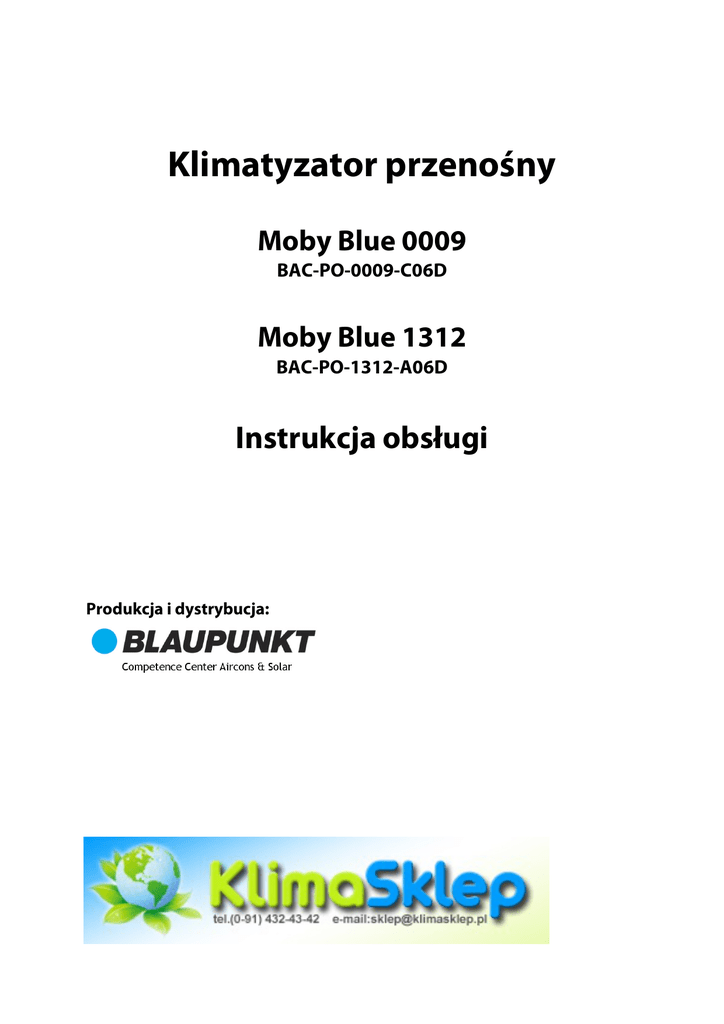 Klimatyzator przenośny Moby Blue 0009 BAC-PO-0009-C06D Moby Blue 1312 BAC-PO-1312-A06D Instrukcja obsługi Produkcja i dystrybucja: Instrukcja obsługi MB 0009 / MB 1312 Przepisy i zasady bezpieczeństwa 1. 2. 3. 4. 5. 6. 7. 8. 9. 10. 11. 12. 13. 14. 15. Przed instalacją klimatyzatora należy dokładnie zapoznać się z instrukcją obsługi i ostrzeżeniami na urządzeniu. Instrukcja zawiera prawidłowe zasady montażu i obsługi klimatyzatora. Nieprzestrzeganie przepisów bezpieczeństwa zawartych w instrukcji, grozi utratą gwarancji. Na urządzeniu znajduje się tabliczka znamionowa, która zawiera niepowtarzalny numer seryjny klimatyzatora, który służy do jego identyfikacji, przykładowo na potrzeby serwisu gwarancyjnego i pogwarancyjnego. Wszystkie produkty marki Blaupunkt są starannie testowane przed sprzedażą. Po rozpakowaniu urządzenia należy sprawdzić, czy w dostarczonym zestawie znajdują się wszystkie jego części i akcesoria. W przypadku stwierdzenia uszkodzeń w transporcie, innych usterek lub braku jakichkolwiek części, należy klimatyzator niezwłocznie zwrócić do sprzedawcy. Urządzenie może zgodnie ze wskazówkami i diagramami w tej instrukcji obsługi zainstalować użytkownik we własnym zakresie. Nie wymaga to specjalistycznej wiedzy. Nieprawidłowa instalacja może być przyczyną wycieku wody, porażenia prądem i nieodwracalnie uszkodzić urządzenie. Producent i dystrybutor urządzenia nie ponoszą odpowiedzialności za sposób instalacji urządzenia, oraz wynikające z tego konsekwencje. Przed podłączeniem urządzenia do sieci należy sprawdzić, czy parametry prądu sieciowego (napięcie) odpowiadają wymogom urządzenia (220240V/50Hz). Jeżeli tak nie jest, w żadnym wypadku nie należy podłączać urządzenia do zasilania sieciowego. Wtyczkę sieciową urządzenia należy całkowicie włożyć do gniazdka sieciowego. Nie należy używać przedłużaczy lub rozgałęziaczy do podłączania przewodu sieciowego klimatyzatora. Jeżeli urządzenie nie jest używane przez dłuższy czas, należy wyjąć wtyczkę sieciową z gniazdka. Jeżeli urządzenie nie było używane przez dłuższy czas, przed ponownym jego uruchomieniem należy sprawdzić, czy wloty i wyloty powietrza nie są zablokowane. Przewód sieciowy i wtyczka sieciowa urządzenia służą do ostatecznego odłączenia urządzenia od zasilania sieciowego prądem elektrycznym, dlatego w każdej chwili muszą być łatwo dostępne. Podczas burzy klimatyzator należy wyłączyć i odłączyć od zasilania sieciowego. Jeżeli praca klimatyzatora została zakłócona wyładowaniami atmosferycznymi lub promieniowaniem elektromagnetycznym, urządzenie należy wyłączyć i odłączyć od zasilania sieciowego. Następnie, po kliku minutach ponownie włączyć. Urządzenia nie należy używać do celów innych niż wymienione w tej instrukcji obsługi. Używanie klimatyzatora niezgodne z jego przeznaczeniem grozi utratą gwarancji. Urządzenia nie powinny obsługiwać osoby, które nie posiadają odpowiedniej wiedzy na jego temat i nie zapoznały się z instrukcją obsługi. Dotyczy to w szczególności dzieci. Aby podczas chłodzenia jak najszybciej osiągnąć docelową temperaturę, należy w klimatyzowanym pomieszczeniu zamknąć drzwi i okna oraz do minimum ograniczyć używanie urządzeń emiturjących ciepło. Nie należy długo wystawiać się na działanie zimnego powietrza, bo jest to szkodliwe dla zdrowia. W trybie chłodzenia, najbardziej komfortową jest różnica 5oC między temperaturą wewnątrz i na zewnątrz klimatyzowanego pomieszczenia. Podczas pracy urządzenia do wylotów powietrza nie należy wkładać rąk lub jakichkolwiek przedmiotów. Do klimatyzatora nie może dostać się woda. Urządzenia nie należy spryskiwać żadnymi płynami. Jeżeli podczas eksploatacji urządzenia, użytkownik zauważy jakiekolwiek nieprawidłowości, jak np. dziwny zapach lub dźwięk, dym, parę, ogień, nagrzanie obudowy lub wtyczki sieciowej, awarię bezpiecznika, zakłócenia funkcjonowania innych urządzeń, należy natychmiast wyłączyć urządzenie, odłączyć od zasilania sieciowego i niezwłocznie skontaktować się z autoryzowanym serwisem. Tylko autoryzowany serwis może dokonywać napraw i przeglądów gwarancyjnych urządzenia. Gwarancja nie obejmuje uszkodzeń spowodowanych nieprawidłową instalacją lub eksploatacją urządzenia, nieprzestrzeganiem instrukcji, niedozwolonymi zmianami lub naprawą przez osobę nieuprawnioną. Przed podjęciem jakichkolwiek działań związanych z czyszczeniem, naprawą, konserwacją lub przeglądem klimatyzatora, urządzenie należy wyłączyć i odłączyć od zasilania sieciowego. Pod groźbą utraty gwarancji, użytkownik nie może we własnym zakresie dokonywać żadnych napraw, modyfikacji lub demontażu obudowy urządzenia. W środku urządzenia nie znajdują się żadne części, które wymagałyby konserwacji ze strony użytkownika. Koniecznie należy zwrócić się do autoryzowanego serwisu, jeżeli przewód (wtyczka) sieciowy lub obudowa jest mechanicznie uszkodzony/uszkodzona, do klimatyzatora dostała się woda lub ciało obce, urządzenie nie funkcjonuje prawidłowo lub jego wydajność jest niezadowalająca, chociaż użytkownik przestrzega wszystkich zaleceń instrukcji, Urządzenie należy czyścić suchą i miękką ścierką. Jeżeli obudowa urządzenia jest mocno zabrudzona, można użyć ścierki nasączonej domowym środkiem czystości. Urządzenia nie należy bezpośrednio spryskiwać wodą lub środkami czyszczącymi. Jeżeli na urządzeniu lub w jego instrukcji znajduje się symbol przekreślonego pojemnika na śmieci, produkt spełnia wymogi dyrektywy Unii Europejskiej 2002/96/EC w sprawie zużytego sprzętu elektrycznego i elektronicznego. Zgodnie z powyższą dyrektywą wszystkie zużyte urządzenia elektryczne i elektroniczne powinny być utylizowane oddzielnie od odpadów gospodarstw domowych lub innych odpad