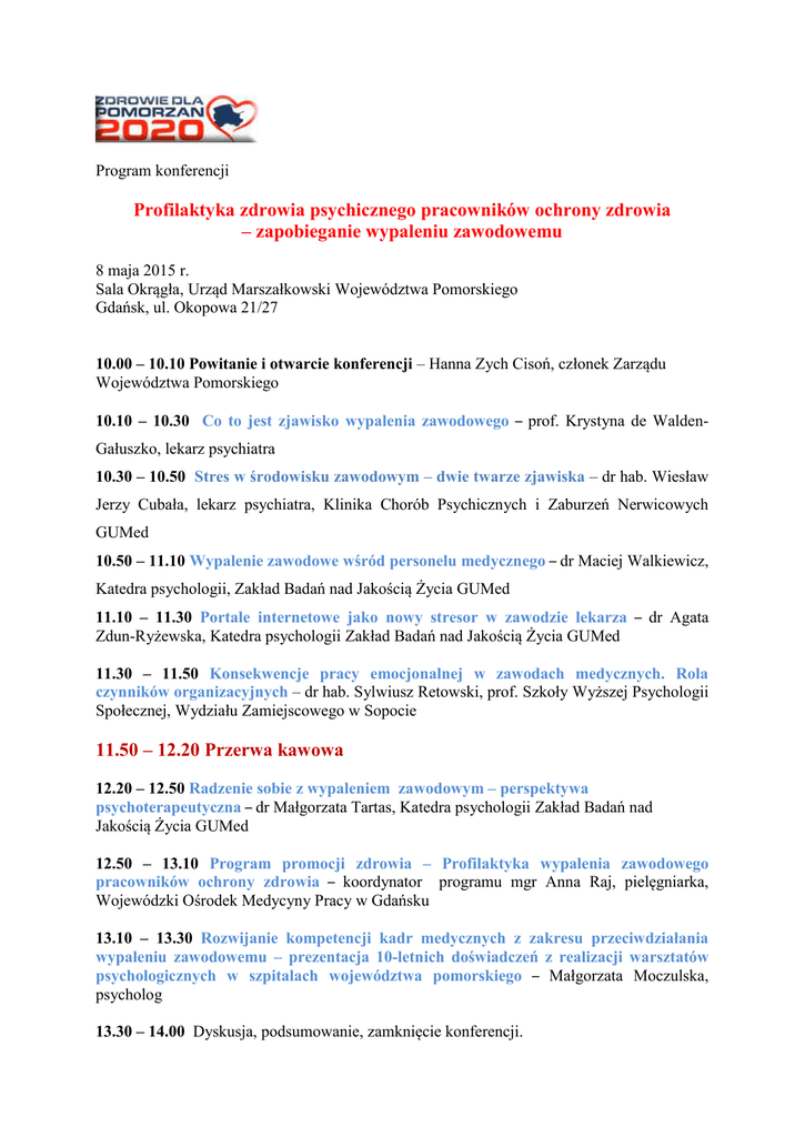 Program konferencji Profilaktyka zdrowia psychicznego pracowników ochrony zdrowia – zapobieganie wypaleniu zawodowemu 8 maja 2015 r. Sala Okrągła, Urząd Marszałkowski Województwa Pomorskiego Gdańsk, ul. Okopowa 21/27 10.00 – 10.10 Powitanie i otwarcie konferencji – Hanna Zych Cisoń, członek Zarządu Województwa Pomorskiego 10.10 – 10.30 Co to jest zjawisko wypalenia zawodowego – prof. Krystyna de WaldenGałuszko, lekarz psychiatra 10.30 – 10.50 Stres w środowisku zawodowym – dwie twarze zjawiska – dr hab. Wiesław Jerzy Cubała, lekarz psychiatra, Klinika Chorób Psychicznych i Zaburzeń Nerwicowych GUMed 10.50 – 11.10 Wypalenie zawodowe wśród personelu medycznego – dr Maciej Walkiewicz, Katedra psychologii, Zakład Badań nad Jakością Życia GUMed 11.10 – 11.30 Portale internetowe jako nowy stresor w zawodzie lekarza – dr Agata Zdun-Ryżewska, Katedra psychologii Zakład Badań nad Jakością Życia GUMed 11.30 – 11.50 Konsekwencje pracy emocjonalnej w zawodach medycznych. Rola czynników organizacyjnych – dr hab. Sylwiusz Retowski, prof. Szkoły Wyższej Psychologii Społecznej, Wydziału Zamiejscowego w Sopocie 11.50 – 12.20 Przerwa kawowa 12.20 – 12.50 Radzenie sobie z wypaleniem zawodowym – perspektywa psychoterapeutyczna – dr Małgorzata Tartas, Katedra psychologii Zakład Badań nad Jakością Życia GUMed 12.50 – 13.10 Program promocji zdrowia – Profilaktyka wypalenia zawodowego pracowników ochrony zdrowia – koordynator programu mgr Anna Raj, pielęgniarka, Wojewódzki Ośrodek Medycyny Pracy w Gdańsku 13.10 – 13.30 Rozwijanie kompetencji kadr medycznych z zakresu przeciwdziałania wypaleniu zawodowemu – prezentacja 10-letnich doświadczeń z realizacji warsztatów psychologicznych w szpitalach województwa pomorskiego – Małgorzata Moczulska, psycholog 13.30 – 14.00 Dyskusja, podsumowanie, zamknięcie konferencji.