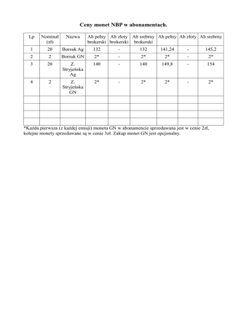 Ceny monet NBP w abonamentach. Lp Nominał (zł) Nazwa Ab pełny Ab złoty Ab srebrny Ab pełny Ab złoty Ab srebrny brokerski brokerski brokerski 1 20 Borsuk Ag 132 - 132 141,24 - 145,2 2 2 Borsuk GN 2* - 2* 2* - 2* 3 20 Z. Stryjeńska Ag 140 - 140 149,8 - 154 4 2 Z. Stryjeńska GN 2* - 2* 2* - 2* *Każda pierwsza (z każdej emisji) moneta GN w abonamencie sprzedawana jest w cenie 2zł, kolejne monety sprzedawane są w cenie 3zł. Zakup monet GN jest opcjonalny.