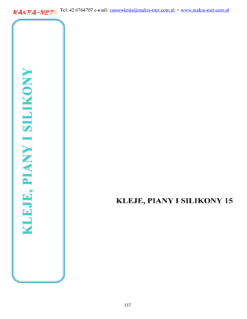 KLEJE, PIANY I SILIKONY Tel: 42 6764707 e-mail: [email protected] ▪ www.makra-met.com.pl KLEJE, PIANY I SILIKONY 15 117 Tel: 42 6764707 e-mail: [email protected] ▪ www.makra-met.com.pl Kleje Klej BUTAPREN BAU SOLID tubka 50ml roztwór kauczuku polichloroprenowego, żywicy alkifenolowej i wypełniacza w mieszaninie rozpuszczalników organicznych stosowany do klejenia na zimno skóry naturalnej i sztucznej, gumy, tkanin, filcu, korka. ►Klej BUTAPREN 50ml 096-11-007 Klej Cyjanopan E 2g klej do połączeń elestacznych błyskawicznie łączy między innymi gumę z metalemi, gumę z gumą oraz niektórych tworzyw sztucznych; skleja w kilka sekund 096-11-013 Klej DISTAL CLASSIC 31g dwuskładnikowy klej epoksydowy, łączy trwałą spoiną metal, drewno, ceramikę, beton, styropian, minerały skalne (granity, marmur), wyroby azbestowe (eternit), tworzywa epoksydowe, mocznikowe, ebonit itp.; nadaje się do uzupełnienia ubytków pokryć antykorozyjnych, uszczelniania - w przypadku awarii - urządzeń sanitarnych i grzewczych, do klejenia Klej butapren puszka 0,2l jednoskładnikowy klej kontaktowy, przeznaczony do stosowania w obuwnictwie do klejenia skóry naturalnej i sztucznej, filcu, gumy i tkanin; może być stosowany również w przemyśle meblowym, samochodowym i w budownictwie tworzy trwałą, elastyczną spoinę, duża siła połączeń ► 0,2l złamanych nart, rakiet tenisowych, do przyklejania uchwytów do szyb; czas klejenia co najmniej 24h, pełną wytrzymałość mechaniczną spoina uzyskuje po upływie 7 dni 096-11-014 236-11-049 118 silikony Klej Cyjanopan ME 2g do połączeń sztywnych; służy do szybkiego łączenia gumy z gumą, gumy z metalami, tworzyw sztucznych i niektórych gatunków drewna, łączy w zależności od rodzaju materiału, w 15 do 30 sekund 096-11-012 i Klej polimerowy uniwersalny 50ml służy do przyklejania kasetonów styropianowych, drewnianych i drewnopodobnych, glazury, parkietu, mozaiki parkietowej, ceramiki, szkła, drewna, korka, sztucznej skóry, płytek poliestrowych, wykładzin podłogowych; daje wodoodporną spoinę; czas schnięcia: 20-60 minut (pełną wytrzymałość spoina uzyskuje po upływie kilku godzin), tubka ► Klej BUNAC polimerowy 50ml 096-11-011 Kleje, piany Klej natychmiastowy BONDINI PLUS 6 g nadaje się do łączenia materiałów porowatych typu: drewno, papier, skóra oraz inne włókna wchłaniające wilgoć, znakomicie łączy również materiały takie jak: metale, plastik, elastomery, ceramikę, gumę, szkło itp.; dzięki zastosowaniu specjalnej głowicy z igłą, dysza kleju nigdy nie ulega zaschnięciu; potrzebuje max. 10 sekund do trwałego złączenia materiałów, blister ► 6g 341-11-002 Tel: 42 6764707 e-mail: [email protected] ▪ www.makra-met.com.pl Klej DISTAL RAPID 30g dwuskładnikowy klej epoksydowy,szybkowiążący łączy trwałą spoiną metal, drewno, ceramikę, beton, styropian, minerały skalne (granity, marmur), wyroby azbestowe (eternit), tworzywa epoksydowe,mocznikowe, ebonit itp.; nadaje się do uzupełnienia ubytków pokryć antykorozyjnych, uszczelniania – w przypadku awarii - urządzeń sanitarnych i grzewczych, do klejenia złamanych nart, rakiet tenisowych, do przyklejania uchwytów do szyb; czas klejenia co najmniej 1h, pełną wytrzymałość mechaniczną spoina uzyskuje po upływie 2 godz. 096-11-015 Klej sekundowy 5g TECHNICOL 517-11-001 Klej 3G TIP TOP 523-99-022 Klej do drewna VICOL przeznaczony do sklejania na zimno drewna z drewnem, drewna z tkaninami lub drewna z tworzywami sztucznymi oraz tektury ► tubka 50ml 096-11-002 119 silikony Klej KROPELKA ŻEL 3g klej na bazie cyjanoakrylu, błyskawicznie skleja: metal, skórę, porcelanę, gumę, drewno, ceramikę i plastik; wzmacnia i zabezpiecza śruby i nakrętki; działa z kilkusekundowym opóźnieniem w stosunku do tradycyjnego kleju Kropelka, dzięki czemu można nanieść korektę po zetknięciu powierzchni, opak=6szt. 096-11-027 i Klej KROPELKA 2ml zawiera cyjanoakrylan; błyskawicznie klei metal, gumę, szkło, porcelanę, ceramikę, plastik, drewno, materiały porowate itp.; może posłużyć także jako wzmocnienie i zabezpieczenie śrub oraz nakrętek, wiązań w żyłkach wędkarskich itp., opak=6szt. 096-11-001 Kleje, piany Klej PATTEX SOS super klej 3g uniwersalny, cyjanoakrylowy klej błyskawiczny łączy w sobie szybkość działania i wytrzymałość, można nim łączyć metal, plastik, drewno, szkło itp.; posiada specjalną końcówkę, umożliwiającą precyzyjniejsze nakładanie substancji na materiał, związanie następuje w ciągu 15-60 sekund 096-11-016 Klej POXILINA 70g dwuskładnikowa masa, służąca do uzupełniania ubytków, uszczelniania powierzchni o różnych kształtach oraz naprawy i łączenia: metali, drewna, betonu, szkła, marmuru, itp.; jest idealna do reperacji przeciekających rur i dziurawych zbiorników, schnie w zaledwie 10 minut, a po godzinie uzyskuje twardość metalu, można wówczas w niej wiercić, wbijać w nią gwoździe, przecinać ją i malować, jest dobrym izolatorem elektrycznym, nie kurczy się, nie rozciąga, odporny na wysoką temperaturę oraz warunki atmosferyczne, opak=6szt. 096-11-026 Tel: 42 6764707 e-mail: [email protected] ▪ www.makra-met.com.pl ►Klej Ośmiorniczka 50g Klej POXIPOL 14ml jest dwuskładnikowym, bardzo mocnym spoiwem plastycznym; klei metal, szkło ceramikę, drewno, twardy plastik, a nawet kamień, idealny do uszczelnień 098-11-001 ►Klej do dętek 20ml 523-99-023 przeciekających rur i dziurawych zbiorników; twardnieje w ciągu 10 minut; może być poddawany ►Klej montażowy DEN BRAVEN MAMUT biały 290ml 398-11-028 obróbce: wierceniu, polerowaniu Klej poliutretanowy do butów BAU SOLID roztwór żywic poliuretanowych z dodatkiem środków modyfikujących ►Klej SZEWSKI tubka 50ml 096-11-008 ►Klej SZEWSKI słoik 0,2l 096-11-004 Klej do drewna VICOL uniwersalny do drewna przeznaczony przede wszystkim do klejenia na zimno drewna i laminat