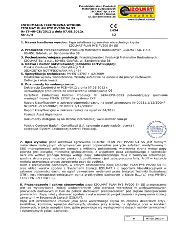 Przedsiębiorstwo Produkcji Materiałów Budowlanych IZOLMAT Sp. z o.o. 80-051 Gdańsk ul. Sandomierska 38 www.izolmat.com.pl INFORMACJA TECHNICZNA WYROBU IZOLMAT PLAN PYE PV200 S4 SS Nr IT-40-CE/2012 z dnia 07.05.2012r. Str.1/4 1434 12 _______________________________________________________________________________________ 1. Nazwa handlowa wyrobu: Papa asfaltowa zgrzewalna wierzchniego krycia IZOLMAT PLAN PYE PV200 S4 SS 2. Producent: Przedsiębiorstwo Produkcji Materiałów Budowlanych IZOLMAT Sp. z o.o. 80-051 Gdańsk, ul. Sandomierska 38 3. Pochodzenie/miejsce produkcji: Przedsiębiorstwo Produkcji Materiałów Budowlanych IZOLMAT Sp. z o.o., 80-051 Gdańsk, ul. Sandomierska 38 4. Nazwa i numer notyfikowanej jednostki certyfikującej: Polskie Centrum Badań i Certyfikacji S.A. JEDNOSTKA NOTYFIKOWANA NR 1434 5. Specyfikacja techniczna: PN-EN 13707 + A2:2009 Elastyczne wyroby wodochronne. Wyroby asfaltowe na osnowie do pokryć dachowych. Definicje i właściwości. 6. Dokumenty formalno-prawne: Deklaracja Zgodności nr PCE-40/12 z dnia 07.05.2012 r. uprawniająca producenta do umieszczania oznakowania Certyfikat Zakładowej Kontroli Produkcji Nr wymagań normy PN-EN 13707 dla systemu ZKP 1434-CPD-0053 potwierdzający spełnienie Raport klasyfikacyjny w zakresie odporności dachu na ogień zewnętrzny Nr 00931.1/12/Z00NP; Nr 00931.2/12/Z00NP; Nr 00931.3/12/Z00NP Raport klasyfikacyjny w zakresie reakcji na ogień nr 64/2011 Posiada Atest Higieniczny Dokumenty dostępne są na stronie internetowej www.izolmat.com.pl Polskie Centrum Badań i Certyfikacji S.A. sprawuje ciągły nadzór, ocenia i akceptuje System Zakładowej Kontroli Produkcji. 7. Opis wyrobu: papa asfaltowa zgrzewalna IZOLMAT PLAN PYE PV200 S4 SS jest rolowym materiałem izolacyjnym otrzymywanym przez odpowiednie pokrycie asfaltem modyfikowanym SBS impregnowanej asfaltem osnowy z włókniny poliestrowej; wierzchnia strona wstęgi papy pokryta jest posypką mineralną gruboziarnistą, z wyjątkiem pasa zakładkowego o szerokości ok.9 cm wzdłuŜ jednego brzegu wstęgi papy zabezpieczonego folią z tworzywa sztucznego; spodnia strona papy moŜe być płaska lub profilowana i jest zabezpieczona folią. Profil w kształcie rowków przyspiesza proces zgrzewania papy do podłoŜa. Dach z przekryciem dachowym, w którym zastosowano papę IZOLMAT PLAN PYE PV200 S4 SS oraz układ warstw zgodny z Systemami Izolacji IZOLMAT i z raportami klasyfikacyjnymi w zakresie odporności dachu na ogień zewnętrzny wydanymi przez Instytut Techniki Budowlanej (ITB), jest nierozprzestrzeniającym ognia przekryciem dachowym o klasie BRoof(t1) (wg PN-ENV 1187 i PN-EN 13501-5). 8. Przeznaczenie i zakres stosowania: papa IZOLMAT PLAN PYE PV200 S4 SS przeznaczona jest do wykonywania izolacji wodochronnych jako warstwa wierzchnia w wielowarstwowych pokryciach dachowych w tym do pokryć dachowych przeznaczonych pod cięŜkie zabezpieczenie powierzchni. Papę naleŜy stosować zgodnie z wytycznymi do projektowania i wykonywania izolacji zawartymi w Systemach Izolacji IZOLMAT. Papa jest przeznaczona równieŜ jako papa wierzchniego krycia do obróbek dekarskich attyk, świetlików, kominów, wpustów dachowych, obróbek przy ścianie, na dylatacje oraz w korytach zlewowych, a takŜe wszędzie tam, gdzie przewiduje się występowanie duŜych ruchów termicznych i dynamicznych połaci dachowej. EDYCJA : DATA WYDANIA : B 07.05.2012 r. Przedsiębiorstwo Produkcji Materiałów Budowlanych IZOLMAT Sp. z o.o. 80-051 Gdańsk ul. Sandomierska 38 www.izolmat.com.pl INFORMACJA TECHNICZNA WYROBU IZOLMAT PLAN PYE PV200 S4 SS Nr IT-40-CE/2012 z dnia 07.05.2012 r. Str.2/4 1434 12 _______________________________________________________________________________________ Zalecane pochylenie połaci dachowej od 3% do 20%. Papa IZOLMAT PLAN PYE PV200 S4 SS dzięki swojej elastyczności oraz specjalnym cechom mechanicznym pozwalającym na jej wielokrotne odkształcanie i powrót do pierwotnych wymiarów, a takŜe ze względu na swoją trwałość i wytrzymałość znajduje szerokie zastosowanie przy kryciu wszelkiego typu dachów; zalecana jest szczególnie dla dachów o wymaganej kilkudziesięcioletniej Ŝywotności pokrycia dachowego. 9. Sposób układania: papę naleŜy mocować metodą zgrzewania. 10. Informacja o badaniach i właściwości wyrobu c.d.: Papa asfaltowa zgrzewalna wierzchniego krycia IZOLMAT PLAN PYE PV200 S4 SS Właściwości Metoda badania Klasyfikacja 1 2 Jednostka miary Przedstawianie Wymagania wyników 3 4 Spełnienie 5 Wady widoczne PN-EN 1850-1 Brak wad widocznych ---- Długość * PN-EN 1848-1 m MLV Nie mniej niŜ 5,0 Szerokość * PN-EN 1848-1 m MLV Nie mniej niŜ 0,99 Prostoliniowość PN-EN 1848-1 ---- MLV Grubość PN-EN 1849-1 mm MDV ---- Spełnienie wymagań (1,00 ± 0,01) Odchyłka: niewiększa niŜ 10mm na 5m długości papy Wodoszczelność przy ciśnieniu 10kPa PN-EN 1928 PN-EN 1110 o MLV +100 – PN-EN 1109 o C MLV -20 N/50mm MDV Odporność na spływanie w podwyŜszonej – temperatura, dla Papa wodoszczelna wymagań Metoda A temperaturze 4,2± 0,2 C której średnia wartość przemieszczenia górnej i dolnej powierzchni próbki umieszczonej pionowo jest mniejsza niŜ 2mm Giętkość w niskiej temperaturze temperatura, przy której nie obserwuje się rys lub pęknięć przy przeginaniu na półobwodzie wałka o średnicy 30mm Maksymalna siła rozciągająca PN-EN 12311-1 - kierunek wzdłuŜ 900 ± 100 - kierunek w poprzek 600 ± 100 WydłuŜenie przy maksymalnej sile PN-EN 12311-1 % MDV rozciągającej - kierunek wzdłuŜ - kierunek w poprzek 50 ± 10 50 ± 10 Stabilność wymiarów PN-EN 1107-1 - Metoda A zmiana wymiarów Przyczepność posypki - PN-EN 12039 % MLV % MDV ≤0,5 10 ± 10 ubytek masy posypki EDYCJA : DATA WYDANIA : B 07.05.2012 r. Przedsiębiorstwo Produkcji Materiałów Budowlanych IZOLMAT Sp. z o.o. 80-051 Gdańsk ul. Sandomierska 38 www.izolmat.com.pl INFORMACJA TECHNICZNA WYROBU IZOLMAT PLAN PYE PV200 S4 SS Nr IT-40-CE/2
