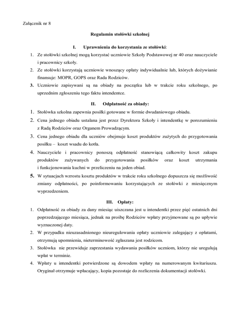 Załącznik nr 8 Regulamin stołówki szkolnej I. Uprawnienia do korzystania ze stołówki: 1. Ze stołówki szkolnej mogą korzystać uczniowie Szkoły Podstawowej nr 40 oraz nauczyciele i pracownicy szkoły. 2. Ze stołówki korzystają uczniowie wnoszący opłaty indywidualnie lub, których dożywianie finansuje: MOPR, GOPS oraz Rada Rodziców. 3. Uczniowie zapisywani są na obiady na początku lub w trakcie roku szkolnego, po uprzednim zgłoszeniu tego faktu intendentce. II. Odpłatność za obiady: 1. Stołówka szkolna zapewnia posiłki gotowane w formie dwudaniowego obiadu. 2. Cena jednego obiadu ustalana jest przez Dyrektora Szkoły i intendentkę w porozumieniu z Radą Rodziców oraz Organem Prowadzącym. 3. Cena jednego obiadu dla uczniów obejmuje koszt produktów zużytych do przygotowania posiłku – koszt wsadu do kotła. 4. Nauczyciele i pracownicy ponoszą odpłatność stanowiącą całkowity koszt zakupu produktów zużywanych do przygotowania posiłków oraz koszt utrzymania i funkcjonowania kuchni w przeliczeniu na jeden obiad. 5. W sytuacjach wzrostu kosztu produktów w trakcie roku szkolnego dopuszcza się możliwość zmiany odpłatności, po poinformowaniu korzystających ze stołówki z miesięcznym wyprzedzeniem. III. Opłaty: 1. Odpłatność za obiady za dany miesiąc uiszczana jest u intendentki przez pięć ostatnich dni poprzedzającego miesiąca, jednak na prośbę Rodziców wpłaty przyjmowane są po upływie wyznaczonej daty. 2. W przypadku nieuzasadnionego nieuregulowania opłaty uczniowie zalegający z opłatami, otrzymują upomnienia, nieterminowość zgłaszana jest rodzicom. 3. Stołówka nie przewiduje zaprzestania wydawania posiłków uczniom, którzy nie uregulują wpłat w terminie. 4. Wpłaty u intendentki potwierdzone są dowodem wpłaty na numerowanym kwitariuszu. Oryginał otrzymuje wpłacający, kopia pozostaje do rozliczenia dokumentacji stołówki. 5. Intendentka posiada listy imienne uczniów korzystających z obiadów. Obiady dla uczniów szkoły podstawowej wydawane są na podstawie potwierdzenia tożsamości przez intendentkę lub osobę uprawnioną do wydawania posiłków. IV. Zwroty za obiady: 1. Zwrot poniesionych kosztów może nastąpić z powodu choroby, wycieczki, lub innych przyczyn losowych, jeżeli nieobecność ucznia wynosi trzy dni lub dłużej. 2. Nieobecność musi być zgłoszona w sekretariacie lub u intendentki osobiście, telefonicznie lub pisemnie najpóźniej do godz. 8.30 danego dnia. 3. Odliczenie kwoty następuje z odpłatności w następnym miesiącu. 4. W szczególnych przypadkach, gdy uczeń lub rodzic dokonujący wpłaty zgłasza nieobecności w ściśle określonych dniach tygodnia, pobierana jest opłata pomniejszona o kwotę za zgłoszone dni. Nieuzasadniona lub nie zgłoszona nieobecność na posiłku nie podlega zwrotowi kosztów V. Wydawanie posiłków: 1. Posiłki wydawane są od godz. 11.30 do godz. 12.45 a) od godz. 11.30 – 11.45 dla klas: I, II; b) od godz. 12.00 – 12.15 dla oddziału przedszkolnego; c) od godz. 12.30 – 12.45 dla klas: III – VI. 2. W stołówce wywieszony jest jadłospis na dany tydzień zatwierdzony przez dyrektora szkoły, szefową kuchni oraz intendentkę. 3. Posiłki przygotowywane są zgodnie z zasadami racjonalnego żywienia i kalkulacją kosztów. VI. Zasady zachowania w stołówce: 1. Podczas spożywania posiłków obowiązują zasady kulturalnego zachowania. 2. Po spożyciu obiadu brudne naczynia należy odnieść w wyznaczone miejsce. 3. Nad bezpieczeństwem uczniów przebywających w czasie obiadu w jadalni czuwają dyżurujący nauczyciele oraz pracownicy stołówki. 4. Uczniowie mogą zgłaszać propozycje dań do jadłospisu. VII. O wszystkich sprawach związanych z organizacją pracy stołówki decyduje Dyrektor Szkoły.
