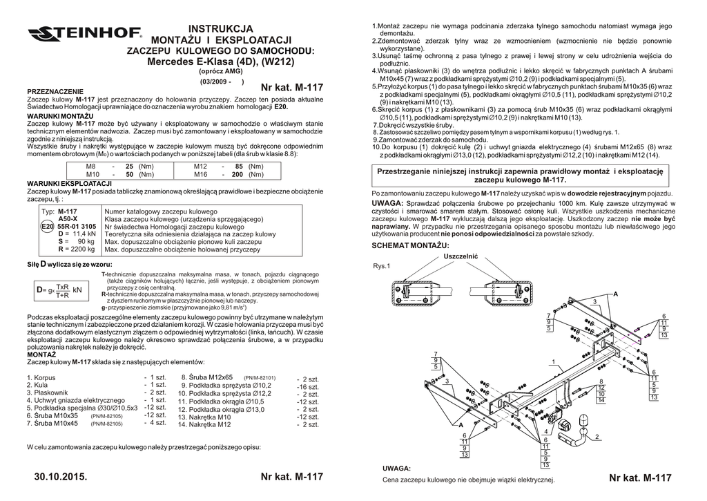 INSTRUKCJA MONTA¯U I EKSPLOATACJI ZACZEPU KULOWEGO DO SAMOCHODU: Mercedes E-Klasa (4D), (W212) (oprócz AMG) (03/2009 - ®) Nr kat. M-117 PRZEZNACZENIE Zaczep kulowy M-117 jest przeznaczony do holowania przyczepy. Zaczep ten posiada aktualne Œwiadectwo Homologacji uprawniaj¹ce do oznaczenia wyrobu znakiem homologacji E20. WARUNKI MONTA¯U Zaczep kulowy M-117 mo¿e byæ u¿ywany i eksploatowany w samochodzie o w³aœciwym stanie technicznym elementów nadwozia. Zaczep musi byæ zamontowany i eksploatowany w samochodzie zgodnie z niniejsz¹ instrukcj¹. Wszystkie œruby i nakrêtki wystêpuj¹ce w zaczepie kulowym musz¹ byæ dokrêcone odpowiednim momentem obrotowym (Mo) o wartoœciach podanych w poni¿szej tabeli (dla œrub w klasie 8.8): M8 25 (Nm) M12 85 (Nm) M10 50 (Nm) M16 - 200 (Nm) WARUNKI EKSPLOATACJI Zaczep kulowy M-117 posiada tabliczkê znamionow¹ okreœlaj¹c¹ prawid³owe i bezpieczne obci¹¿enie zaczepu, tj. : Typ: M-117 A50-X E20 55R-01 3105 D = 11,4 kN S = 90 kg R = 2200 kg 1.Monta¿ zaczepu nie wymaga podcinania zderzaka tylnego samochodu natomiast wymaga jego demonta¿u. 2.Zdemontowaæ zderzak tylny wraz ze wzmocnieniem (wzmocnienie nie bêdzie ponownie wykorzystane). 3.Usun¹æ taœmê ochronn¹ z pasa tylnego z prawej i lewej strony w celu udro¿nienia wejœcia do pod³u¿nic. 4.Wsun¹æ p³askowniki (3) do wnêtrza pod³u¿nic i lekko skrêciæ w fabrycznych punktach A œrubami M10x45 (7) wraz z podk³adkami sprê¿ystymi Ø10,2 (9) i podk³adkami specjalnymi (5). 5.Przy³o¿yæ korpus (1) do pasa tylnego i lekko skrêciæ w fabrycznych punktach œrubami M10x35 (6) wraz z podk³adkami specjalnymi (5), podk³adkami okr¹g³ymi Ø10,5 (11), podk³adkami sprê¿ystymi Ø10,2 (9) i nakrêtkami M10 (13). 6.Skrêciæ korpus (1) z p³askownikami (3) za pomoc¹ œrub M10x35 (6) wraz podk³adkami okr¹g³ymi Ø10,5 (11), podk³adkami sprê¿ystymi Ø10,2 (9) i nakrêtkami M10 (13). 7.Dokrêciæ wszystkie œruby. 8. Zastosowaæ szczeliwo pomiêdzy pasem tylnym a wspornikami korpusu (1) wed³ug rys. 1. 9.Zamontowaæ zderzak do samochodu. 10.Do korpusu (1) dokrêciæ kulê (2) i uchwyt gniazda elektrycznego (4) œrubami M12x65 (8) wraz z podk³adkami okr¹g³ymi Ø13,0 (12), podk³adkami sprê¿ystymi Ø12,2 (10) i nakrêtkami M12 (14). Przestrzeganie niniejszej instrukcji zapewnia prawid³owy monta¿ i eksploatacjê zaczepu kulowego M-117. Po zamontowaniu zaczepu kulowego M-117 nale¿y uzyskaæ wpis w dowodzie rejestracyjnym pojazdu. UWAGA: Sprawdzaæ po³¹czenia œrubowe po przejechaniu 1000 km. Kulê zawsze utrzymywaæ w czystoœci i smarowaæ smarem sta³ym. Stosowaæ os³onê kuli. Wszystkie uszkodzenia mechaniczne zaczepu kulowego M-117 wykluczaj¹ dalsz¹ jego eksploatacjê. Uszkodzony zaczep nie mo¿e byæ naprawiany. W przypadku nie przestrzegania opisanego sposobu monta¿u lub niew³aœciwego jego u¿ytkowania producent nie ponosi odpowiedzialnoœci za powsta³e szkody. Numer katalogowy zaczepu kulowego Klasa zaczepu kulowego (urz¹dzenia sprzêgaj¹cego) Nr œwiadectwa Homologacji zaczepu kulowego Teoretyczna si³a odniesienia dzia³aj¹ca na zaczep kulowy Max. dopuszczalne obci¹¿enie pionowe kuli zaczepu Max. dopuszczalne obci¹¿enie holowanej przyczepy SCHEMAT MONTA¯U: Uszczelniæ Si³ê D wylicza siê ze wzoru: D= gx TxR kN T+R Rys.1 T-technicznie dopuszczalna maksymalna masa, w tonach, pojazdu ci¹gn¹cego (tak¿e ci¹gników holuj¹cych) ³¹cznie, jeœli wystêpuje, z obci¹¿eniem pionowym przyczepy z osiê centraln¹. R-technicznie dopuszczalna maksymalna masa, w tonach, przyczepy samochodowej z dyszlem ruchomym w p³aszczyŸnie pionowej lub naczepy. g- przyspieszenie ziemskie (przyjmowane jako 9,81 m/s2) A 3 7 9 5 Podczas eksploatacji poszczególne elementy zaczepu kulowego powinny byæ utrzymane w nale¿ytym stanie technicznym i zabezpieczone przed dzia³aniem korozji. W czasie holowania przyczepa musi byæ z³¹czona dodatkowym elastycznym z³¹czem o odpowiedniej wytrzyma³oœci (linka, ³añcuch). W czasie eksploatacji zaczepu kulowego nale¿y okresowo sprawdzaæ po³¹czenia œrubowe, a w przypadku poluzowania nakrêtek nale¿y je dokrêciæ. MONTA¯ Zaczep kulowy M-117 sk³ada siê z nastêpuj¹cych elementów: 1. Korpus 2. Kula 3. P³askownik 4. Uchwyt gniazda elektrycznego 5. Podk³adka specjalna Ø30/Ø10,5x3 6. Œruba M10x35 (PN/M-82105) 7. Œruba M10x45 (PN/M-82105) - 1 szt. - 1 szt. - 2 szt. - 1 szt. -12 szt. -12 szt. - 4 szt. 8. Œruba M12x65 (PN/M-82101) 9. Podk³adka sprê¿ysta Ø10,2 10. Podk³adka sprê¿ysta Ø12,2 11. Podk³adka okr¹g³a Ø10,5 12. Podk³adka okr¹g³a Ø13,0 13. Nakrêtka M10 14. Nakrêtka M12 7 9 5 - 2 szt. -16 szt. - 2 szt. -12 szt. - 2 szt. -12 szt. - 2 szt. 8 12 10 14 6 11 5 9 13 A 6 11 9 13 UWAGA: Nr kat. M-117 1 3 W celu zamontowania zaczepu kulowego nale¿y przestrzegaæ poni¿szego opisu: 30.10.2015. 6 11 9 13 4 6 11 5 9 13 Cena zaczepu kulowego nie obejmuje wi¹zki elektrycznej. 2 Nr kat. M-117 TOW BAR FOR Mercedes E-Class (4D), (W212) (except AMG) (03/2009 - ®) FITTING AND OPERATION MANUAL Cat. No.M-117 DESTINATION Tow bar M-117 is designed for towing a trailer. This ball hook has a current certification of approval authorizing the product with E20 certification sign. FITTING CONDITIONS Tow bar M-117 can be used and operated in a car with proper technical conditions of body elements. Those parts cannot be mechanically damaged . The ball hook has to be installed and operated in a car according to this instruction . All bolts and nuts in ball hook have to be screwed down with proper torque (Mo) . Torque values are given below : M8 M10 - 25 (Nm) 50 (Nm) M12 M16 - Obeying this instruction assures correct montage and the M-117 tow bar operating. After assembling of the tow bar M-117 you have to get entry in cars registration book. 85 (Nm) 200 (Nm) CAUTION : OPERATION CONDITIONS Check if all bolts and nuts are correctly tightened after 1000km. Keep tow ball clean, grease and cased. All mechanical damages of