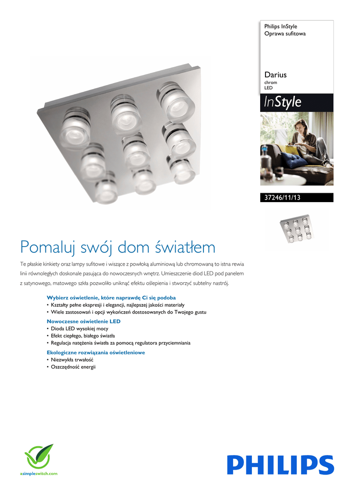 Philips InStyle Oprawa sufitowa Darius chrom LED InStyle 37246/11/13 Pomaluj swój dom światłem Te płaskie kinkiety oraz lampy sufitowe i wiszące z powłoką aluminiową lub chromowaną to istna rewia linii równoległych doskonale pasująca do nowoczesnych wnętrz. Umieszczenie diod LED pod panelem z satynowego, matowego szkła pozwoliło uniknąć efektu oślepienia i stworzyć subtelny nastrój. Wybierz oświetlenie, które naprawdę Ci się podoba • Kształty pełne ekspresji i elegancji, najlepszej jakości materiały • Wiele zastosowań i opcji wykończeń dostosowanych do Twojego gustu Nowoczesne oświetlenie LED • Dioda LED wysokiej mocy • Efekt ciepłego, białego światła • Regulacja natężenia światła za pomocą regulatora przyciemniania Ekologiczne rozwiązania oświetleniowe • Niezwykła trwałość • Oszczędność energii 372461113 Oprawa sufitowa Darius chrom, LED Zalety Kształty i materiały Lampy z kolekcji Philips InStyle zostały zaprojektowane tak, aby doskonale pasowały do współczesnych wnętrz. Dzięki wielu kombinacjom dostępnych wykończeń, kolekcja ta znakomicie komponuje się z takimi elementami, jak zasłony, meble, kolory ścian i akcesoria, tworząc idealny efekt, o którym marzysz. Dbałość o szczegóły i koncepcję projektu pomoże Ci wyrazić swój styl dokładnie tak, jak chcesz, i pozwoli stworzyć nastrój i doskonałą atmosferę dla Ciebie, Twoich przyjaciół i rodziny. Philips, łączące 3 diody LED w obudowie z materiałów syntetycznych i aluminium. Ta technika pozwala na uzyskanie optymalnej wydajności oświetlenia i całkowicie jednolitego koloru światła. przetestowała wiele regulatorów przyciemniania, które okazały się zgodne z oświetleniem LED. Lista zgodnych regulatorów przyciemniania jest dostępna w sekcji plików do pobrania i pomocy technicznej. Efekt ciepłego, białego światła Oszczędność energii Wypełnij swój dom efektami świetlnymi o barwie ciepłej bieli dzięki najnowszym innowacjom w technologii LED. Firma Philips wprowadza najnowszą generację diod LED wysokiej mocy oferujących ciepłe białe światło i osiągających temperaturę barwową 2700 kelwinów. To innowacyjne rozwiązanie przenosi produkty oświetleniowe firmy Philips na wyższy poziom, łącząc elegancję i nastrój ze światłem i wydajnością. Ta lampa firmy Philips zużywa mniej energii niż tradycyjne źródła światła, co pozwala zmniejszyć rachunki za prąd i przyczynia się do ochrony środowiska. Wiele zastosowań Jeśli interesujesz się projektowaniem wnętrz i lubisz eksperymentować, bawiąc się w domu najnowszymi stylami i konwencjami, wypróbuj Philips InStyle, czyli kolekcję dekoracyjnych opraw wiszących, kinkietów, opraw sufitowych oraz lamp podłogowych i stołowych wykonanych z najszlachetniejszych materiałów i dostępnych w bogatej palecie kolorów. Możliwość przyciemniania Dioda LED wysokiej mocy Zastosowany w tej lampie moduł LED to unikalne rozwiązanie opracowane przez firmę Niezwykła trwałość Produkty oświetleniowe LED firmy Philips są wyposażone w funkcję regulacji natężenia światła za pomocą regulatora przyciemniania (niedołączony do zestawu). Dzięki temu można stworzyć idealną atmosferę na każdą okazję — niezależnie od tego, czy chodzi o romantyczną kolację we dwoje czy o relaks z rodziną i przyjaciółmi w salonie. Firma Philips Źródło światła godne zaufania. Produkty oświetleniowe LED firmy Philips gwarantują wyjątkową trwałość min. 20 000 godzin (co oznacza 20 lat w przypadku średniego użycia przez 3 godziny dziennie, przy co najmniej 13 000 włączeń i wyłączeń). Dzięki temu już nie trzeba się martwić naprawą lub wymianą żarówki, ciesząc się doskonałym, nastrojowym oświetleniem w domu. 372461113 Oprawa sufitowa Darius chrom, LED Dane techniczne Stylistyka i wykończenie • Materiał: szkło • Kolor: chrom Dodatkowe funkcje/akcesoria w zestawie • Możliwość przyciemniania • Wbudowane diody LED Wymiary i waga produktu • • • • Wysokość: 7,0 cm Długość: 28,1 cm Szerokość: 28,1 cm Waga netto: 2,330 kg lumenach: 1170 lm Oprawa z możliwością przyciemniania LED Wbudowane źródło światła LED Współczynnik IP: IP20, ochrona przed przedmiotami powyżej 12,5 mm, brak ochrony przed wodą • Klasa ochronności: I — uziemienie • Źródło światła odpowiadające tradycyjnej żarówce o mocy: 15 W • • • • Serwis • Gwarancja: 2 lata Wymiary i waga opakowania Dane techniczne • Zasilanie sieciowe: Przedział 220–240 V, 50–60 Hz • Technologia źródła światła: LED, Bezpieczne, bardzo niskie napięcie • Liczba źródeł światła: 9 • Moc źródła światła w zestawie: 2 W • Barwa światła: ciepła biel • Maksymalna trwałość źródła światła: 20 000 godz. • Łączna moc strumienia świetlnego oprawy w • • • • Wysokość: 29,8 cm Długość: 29,5 cm Szerokość: 9,9 cm Waga: 2,377 kg Różne • Opracowano z myślą o: Salon i sypialnia, Kuchnia • Styl: Nowoczesna • Typ: Oprawa sufitowa • Data wydania 2015-06-23 © 2015 Koninklijke Philips N.V. Wszelkie prawa zastrzeżone. Wersja: 3.0.1 Dane techniczne mogą ulec zmianie bez powiadomienia. Znaki towarowe są własnością Koninklijke Philips N.V. lub własnością odpowiednich firm. 12 NC: 9150 024 24301 EAN: 54 13987 07896 5 www.philips.com