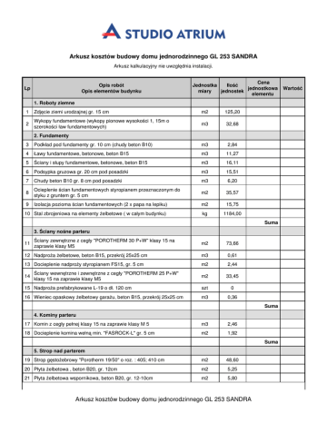 Arkusz kosztów budowy domu jednorodzinnego GL 253 SANDRA Arkusz kalkulacyjny nie uwzględnia instalacji. Opis robót Opis elementów budynku Lp Cena Jednostka Ilość jednostkowa miary jednostek elementu 1. Roboty ziemne 1 Zdjęcie ziemi urodzajnej gr. 15 cm m2 125,20 2 Wykopy fundamentowe (wykopy pionowe wysokości 1, 15m o szerokości ław fundamentowych) m3 32,68 2. Fundamenty 3 Podkład pod fundamenty gr. 10 cm (chudy beton B10) m3 2,84 4 Ławy fundamentowe, betonowe, beton B15 m3 11,27 5 Ściany i słupy fundamentowe, betonowe, beton B15 m3 16,11 6 Podsypka gruzowa gr. 20 cm pod posadzki m3 15,51 7 Chudy beton B10 gr. 8 cm pod posadzki m3 6,20 8 Ocieplenie ścian fundamentowych styropianem przeznaczonym do styku z gruntem gr. 5 cm m2 35,57 9 Izolacja pozioma ścian fundamentowych (2 x papa na lepiku) m2 15,75 10 Stal zbrojeniowa na elementy żelbetowe ( w całym budynku) kg 1184,00 Suma 3. Ściany nośne parteru 11 Ściany zewnętrzne z cegły "POROTHERM 30 P+W" klasy 15 na zaprawie klasy M5 m2 73,66 12 Nadproża żelbetowe, beton B15, przekrój 25x25 cm m3 0,61 13 Docieplenie nadproży styropianem FS15, gr. 5 cm m2 2,44 m2 33,45 15 Nadproża prefabrykowane L-19 o dł. 120 cm szt 0 16 Wieniec opaskowy żelbetowy garażu, beton B15, przekrój 25x25 cm m3 0,36 14 Ściany wewnętrzne i zewnętrzne z cegły "POROTHERM 25 P+W" klasy 15 na zaprawie klasy M5 Suma 4. Kominy parteru 17 Komin z cegły pełnej klasy 15 na zaprawie klasy M 5 m3 2,46 18 Docieplenie komina wełną min. "FASROCK-L" gr. 5 cm m2 1,92 Suma 5. Strop nad parterem 19 Strop gęstożebrowy "Porotherm 19/50" o roz. : 405; 410 cm m2 48,60 20 Płyta żelbetowa , beton B20, gr. 12cm m2 5,25 21 Płyta żelbetowa wspornikowa, beton B20, gr. 12-10cm m2 5,80 Arkusz kosztów budowy domu jednorodzinnego GL 253 SANDRA Wartość 22 Wieńce żelbetowe, beton B20, przekrój 25x27, 30x27 cm m3 2,54 23 Docieplenie wieńców styropianem FS15, gr. 5 cm m2 9,13 24 Belki żelbetowe, beton B20, przekrój 25x23, 25x33 cm m3 0,66 25 Schody płytowe, żelbetowe, beton B20, gr. 12 cm m2 4,25 Suma 6. Ściany nośne poddasza 26 Ściany zewnętrzne z cegły "POROTHERM 30 P+W" klasy 15 na zaprawie klasy M5 m2 28,85 27 Nadproża żelbetowe, beton B15, przekrój 25x25 cm m3 0,36 28 Docieplenie nadproży styropianem FS15, gr. 5 cm m2 1,45 29 Wieńce opaskowe żelbetowe, beton B15, przekrój 25x25 cm m3 1,54 30 Docieplenie wieńców styropianem FS15, gr. 5 cm m2 6,44 31 Słupki kotwiące żelbetowe, beton B15, przekrój 25x25 cm m3 0,14 32 Docieplenie słupków kotwiących styropianem FS15, gr. 5 cm m2 0,56 Suma 7. Kominy poddasza 33 Komin z cegły pełnej klasy 15 na zaprawie klasy M5 m3 2,85 m3 0,50 35 Nakrywy betonowe kominów, beton B15 m3 0,22 36 Docieplenie komina wełną min. "FASROCK-L" gr. 5 cm m2 3,00 34 Komin z cegły klinkierowej klasy 20 na zaprawie klasy M5 ( nad dachem) Suma 8. Więźba 37 Drewno konstrukcyjne więźby klasy C30 m3 8,45 38 Konstrukcja dachu ( w rozwinięciu) m2 176,00 Suma 9. Dach 39 Krycie dachówką m2 176,00 40 Folia wiatroizolacyjna m2 176,00 41 Rynny f 100 mb 28,60 42 Rury spustowe f 70 mb 15,35 43 Rynny f 70 mb 8,20 44 Wyłaz dachowy o wymiarach min. 80 x 80 cm szt 1 45 Okna połaciowe o wymiarach ościeżnicy 78x140 cm szt 2 46 Podbitka drewniana, heblowana gr. 2 cm m2 51,10 Suma 10. Ściany działowe parteru 47 Ściana gr. 12 cm z cegły pełnej klasy 10 na zaprawie klasy M2 m2 35,85 48 Nadproża prefabrykowane L-19 o dł. 120 cm szt 3 Suma 11. Podłoga na parterze Arkusz kosztów budowy domu jednorodzinnego GL 253 SANDRA 49 Izolacja pozioma przeciwwilgociowa (2 x papa na lepiku) m2 78,50 50 Wełna mineralna "STROPROCK" , gr. 10 cm m2 59,00 51 Wylewka betonowa, beton B15, gr. 6, 5 cm, zatarta na gładko m3 3,85 52 Wylewka betonowa, beton B15, gr. 8, 0 cm, zatarta na gładko m3 1,40 Suma 12. Ściany działowe poddasza 53 Ściana gr. 12 cm z cegły dziurawki klasy 5 na zaprawie klasy M2 m2 32,74 54 Nadproża prefabrykowane L-19 o dł. 120 cm szt 3 Suma 13. Podłoga na poddaszu 55 Styropian FS 20 gr. 3 cm m2 54,95 56 Wylewka betonowa, beton B15, gr. 3, 5 cm, zatarta na gładko m3 1,92 Suma 14. Ścianki lukarny 57 Płyta gipsowo-włóknowa FERMACELL na ruszcie stalowym gr. 1, 0 cm 58 Wełan mineralna gr. 12 cm 59 Płyta gipsowo-włóknowa FERMACELL na ruszcie stalowym gr. 2, 0 cm 60 Styropian FS 15 gr. 2 cm m2 10,50 m2 10,50 m2 10,50 m2 10,50 Suma 15. Roboty wykończeniowe Tynki 61 Tynk cementowo-wapienny na ścianach od wewnątrz m2 310,70 62 Tynk cementowo-wapienny na sufitach m2 58,90 m2 135,75 64 Wełna mineralna "ROCKMIN" gr. 12 cm m2 76,80 65 Wełna mineralna "ROCKMIN" gr. 5 cm m2 66,95 66 Płyta gipsowo-włóknowa na ruszcie stalowym gr. 1, 0 cm m2 88,65 67 Styropian FS 15 gr. 2 cm m2 5,60 68 Izolacja pozioma przeciwwilgociowa (2 x papa na lepiku) m2 5,60 69 Styropian FS 30 gr. 3 cm m2 5,60 70 Wylewka betonowa, beton B15, gr. 4 cm, zatarta na gładko m3 0,20 71 Posadzka z płytek gresowych m2 5,60 72 Posadzka z płytek ceramicznych m2 23,05 73 Posadzka z paneli podłogowych m2 90,90 Docieplenie ścian zewnętrznych 63 Ocieplenie ścian zewnętrznych wełną mineralną "FASROCK-L", gr. 10 cm Sufit podwieszany + skosy poddasza Balkon Posadzki Arkusz kosztów budowy domu jednorodzinnego GL 253 SANDRA 74 Trepy dębowe na schodach m2 4,25 75 Balustrada na schodach wysokości 100 cm mb 6,50 76 Balustrada na balkonie wysokości 100 cm mb 6,10 Balustrady Suma 16. Okna i drzwi 77 Okno o wymiarach ościeżnicy 56, 5x53, 5 cm szt 2 78 Okna o wymiarach ościeżnicy 116, 5x143, 5 cm szt 4 79 Okna o wymiarach ościeżnicy 96, 5x113, 5 cm szt 4 80 Drzwi wewnętrzne pokojowe o wymiarach ościeżnicy 88x205 cm szt 3 81 Drzwi wewnętrzne pokojowe o wymiarach ościeżnicy 98x205 cm szt 1 82 Drzwi wewnętrzne łazienkowe o wymiarach ościeżnicy 88x205 cm szt 2 83 Drzwi zewnętrzne o wymiarach ościeżnicy 96, 5x222 cm szt 1 84 Drzwi balkonowe o wymiarach ościeżnicy 196, 5x234 cm szt 1 85 Drzwi balkonowe o wymiarach ościeżnicy