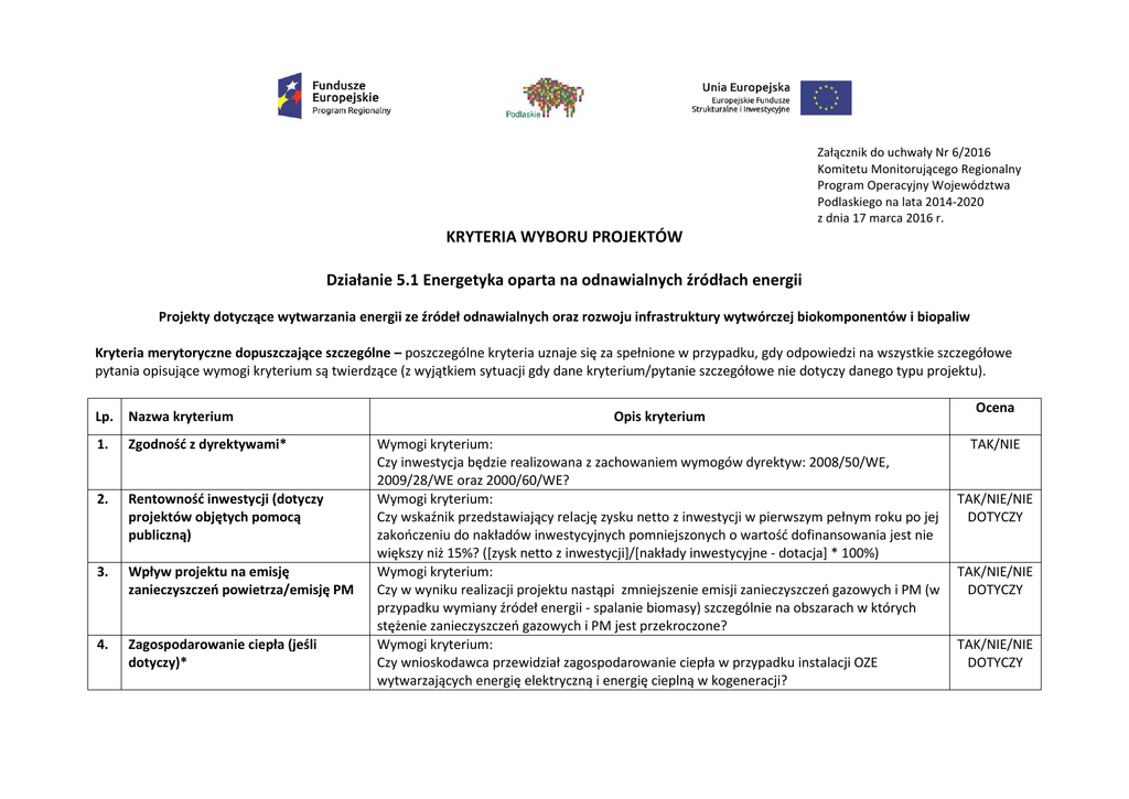 Załącznik do uchwały Nr 6/2016 Komitetu Monitorującego Regionalny Program Operacyjny Województwa Podlaskiego na lata 2014-2020 z dnia 17 marca 2016 r. KRYTERIA WYBORU PROJEKTÓW Działanie 5.1 Energetyka oparta na odnawialnych źródłach energii Projekty dotyczące wytwarzania energii ze źródeł odnawialnych oraz rozwoju infrastruktury wytwórczej biokomponentów i biopaliw Kryteria merytoryczne dopuszczające szczególne – poszczególne kryteria uznaje się za spełnione w przypadku, gdy odpowiedzi na wszystkie szczegółowe pytania opisujące wymogi kryterium są twierdzące (z wyjątkiem sytuacji gdy dane kryterium/pytanie szczegółowe nie dotyczy danego typu projektu). Lp. Nazwa kryterium 1. Zgodność z dyrektywami* 2. Rentowność inwestycji (dotyczy projektów objętych pomocą publiczną) 3. Wpływ projektu na emisję zanieczyszczeń powietrza/emisję PM 4. Zagospodarowanie ciepła (jeśli dotyczy)* Opis kryterium Wymogi kryterium: Czy inwestycja będzie realizowana z zachowaniem wymogów dyrektyw: 2008/50/WE, 2009/28/WE oraz 2000/60/WE? Wymogi kryterium: Czy wskaźnik przedstawiający relację zysku netto z inwestycji w pierwszym pełnym roku po jej zakończeniu do nakładów inwestycyjnych pomniejszonych o wartość dofinansowania jest nie większy niż 15%? ([zysk netto z inwestycji]/[nakłady inwestycyjne - dotacja] * 100%) Wymogi kryterium: Czy w wyniku realizacji projektu nastąpi zmniejszenie emisji zanieczyszczeń gazowych i PM (w przypadku wymiany źródeł energii - spalanie biomasy) szczególnie na obszarach w których stężenie zanieczyszczeń gazowych i PM jest przekroczone? Wymogi kryterium: Czy wnioskodawca przewidział zagospodarowanie ciepła w przypadku instalacji OZE wytwarzających energię elektryczną i energię cieplną w kogeneracji? Ocena TAK/NIE TAK/NIE/NIE DOTYCZY TAK/NIE/NIE DOTYCZY TAK/NIE/NIE DOTYCZY 5. Negatywne efekty ekologiczne* Kryterium nie obejmuje wykorzystania energii na potrzeby procesowe instalacji i przeróbki odpadów powstających w instalacji, np. suszenia osadu pofermentacyjnego. Wymogi kryterium: Czy przewidywana technologia instalacji OZE nie będzie oparta na wykorzystaniu biomasy pozyskiwanej w sposób konkurencyjny wobec produkcji żywności i pasz? (jeśli dotyczy) Czy projekt nie zakłada stosowania wody do rozcieńczania substratów do fermentacji metanowej? (jeśli dotyczy) Czy projekt wsparcia dla biopaliw rolniczych wytwarzanych m.in. z roślin oleistych uprawianych współrzędnie jest realizowany pod warunkiem, że ich produkcja nie będzie prowadziła do konkurencji o rolniczą przestrzeń produkcyjną oraz będzie miała istotny wkład w zmniejszenie emisji gazów cieplarnianych? (jeśli dotyczy) TAK/NIE/NIE DOTYCZY Kryteria merytoryczne szczegółowe (Kryteria różnicujące) – warunkiem weryfikacji zgodności projektu z kryteriami punktowymi jest spełnienie wszystkich kryteriów merytorycznych dopuszczających. Maksymalna Lp. Nazwa kryterium Opis kryterium ilość punktów 1. Efektywność kosztowa urządzeń Ocena kryterium: 15 produkujących energię pochodzącą ze Produkcja energii ze źródeł odnawialnych źródeł odnawialnych i/lub W ramach kryterium ocenie podlega iloraz wartości wnioskowanej dotacji i wielkości mocy infrastruktury wytwórczej (w kW) zainstalowanych urządzeń produkujących energię pochodzącą ze źródeł odnawialnych biokomponentów i biopaliw* (wartość zaokrąglana według reguł matematycznych do pełnych zł). powyżej 17000 zł/kW powyżej 16000 do 17000 zł/kW powyżej 15000 do 16000 zł/kW powyżej 14000 do 15000 zł/kW powyżej 13000 do 14000 zł/kW powyżej 12000 do 13000 zł/kW powyżej 11000 do 12000 zł/kW powyżej 10000 do 11000 zł/kW 0 pkt 1 pkt 2 pkt 3 pkt 4 pkt 5 pkt 6 pkt 7 pkt Produkcja biopaliw i biokomponentów 2 powyżej 9000 do 10000 zł/kW powyżej 8000 do 9000 zł/kW powyżej 7000 do 8000 zł/kW powyżej 6000 do 7000 zł/kW powyżej 5000 do 6000 zł/kW powyżej 4000 do 5000 zł/kW powyżej 3000 do 4000 zł/kW do 3000 zł/kW 8 pkt 9 pkt 10 pkt 11 pkt 12 pkt 13 pkt 14 pkt 15 pkt Punktacja jest uzależniona od złożonych w ramach konkursu projektów. W ramach kryterium ocenie podlega iloraz wartości wnioskowanej dotacji i wielkości produkcji biokomponentów lub biopaliw (w Mg) zainstalowanej infrastruktury wytwórczej biokomponentów lub biopaliw (wartość zaokrąglana według reguł matematycznych do pełnych %). Punktacja jest uzależniona od porównania obliczonego wskaźnika z wartością analogicznego wskaźnika o najniższej wartości spośród wszystkich złożonych w ramach konkursu projektów, które spełniają kryteria dopuszczające. 2. Dodatkowy efekt ekologiczny w projekcie OZE* powyżej 170% najniższej wartości 0 pkt powyżej 130% do 135% najniższej wartości 8 pkt powyżej 165% do 170% najniższej wartości 1 pkt powyżej 130% do 135% najniższej wartości 9 pkt powyżej 160 % do 165% najniższej wartości 2 pkt powyżej 120% do 125% najniższej wartości 10 pkt powyżej 155% do 160% najniższej wartości 3 pkt powyżej 115% do 120% najniższej wartości 11 pkt powyżej 150% do 155% najniższej wartości 4 pkt powyżej 110% do 115% najniższej wartości 12 pkt powyżej 145% do 150% najniższej wartości 5 pkt powyżej 105% do 110% najniższej wartości 13 pkt powyżej 140% do 145% najniższej wartości 6 pkt powyżej 100% do 105% najniższej wartości 14 pkt powyżej 135% do 140% najniższej wartości 7 pkt najniższa wartość relacji wnioskowanej dotacji i 1 Mg biopaliwa/biokomponentu wytwarzanego w ciągu roku 15 pkt Między sobą porównywane są projekty dotyczące tego samego nośnika energii (odrębny ranking dla wytwarzania estrów i osobny dla bioetanolu). Ocena kryterium: W ramach kryterium ocenie podlega dodatkowy efekt ekologiczny w projekcie uzyskany poprzez: zagospodarowanie odpadów przemysłowych, rolniczych - 10 pkt; lokalizację inwestycji na terenach zdegradowanych np. składowiska odpadów 3 15 komunalnych