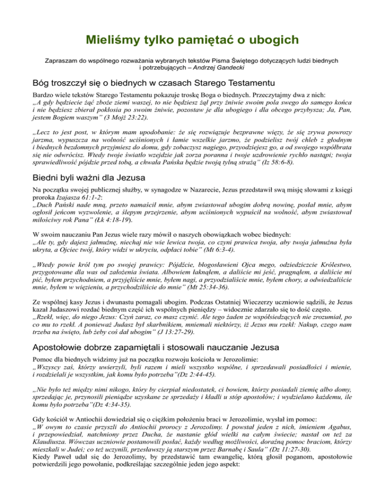 Mieliśmy tylko pamiętać o ubogich Zapraszam do wspólnego rozwaŜania wybranych tekstów Pisma Świętego dotyczących ludzi biednych i potrzebujących – Andrzej Gandecki Bóg troszczył się o biednych w czasach Starego Testamentu Bardzo wiele tekstów Starego Testamentu pokazuje troskę Boga o biednych. Przeczytajmy dwa z nich: „A gdy będziecie Ŝąć zboŜe ziemi waszej, to nie będziesz Ŝął przy Ŝniwie swoim pola swego do samego końca i nie będziesz zbierał pokłosia po swoim Ŝniwie, pozostaw je dla ubogiego i dla obcego przybysza; Ja, Pan, jestem Bogiem waszym” (3 MojŜ 23:22). „Lecz to jest post, w którym mam upodobanie: Ŝe się rozwiązuje bezprawne więzy, Ŝe się zrywa powrozy jarzma, wypuszcza na wolność uciśnionych i łamie wszelkie jarzmo, Ŝe podzielisz twój chleb z głodnym i biednych bezdomnych przyjmiesz do domu, gdy zobaczysz nagiego, przyodziejesz go, a od swojego współbrata się nie odwrócisz. Wtedy twoje światło wzejdzie jak zorza poranna i twoje uzdrowienie rychło nastąpi; twoja sprawiedliwość pójdzie przed tobą, a chwała Pańska będzie twoją tylną straŜą” (Iz 58:6-8). Biedni byli waŜni dla Jezusa Na początku swojej publicznej słuŜby, w synagodze w Nazarecie, Jezus przedstawił swą misję słowami z księgi proroka Izajasza 61:1-2: „Duch Pański nade mną, przeto namaścił mnie, abym zwiastował ubogim dobrą nowinę, posłał mnie, abym ogłosił jeńcom wyzwolenie, a ślepym przejrzenie, abym uciśnionych wypuścił na wolność, abym zwiastował miłościwy rok Pana” (Łk 4:18-19). W swoim nauczaniu Pan Jezus wiele razy mówił o naszych obowiązkach wobec biednych: „Ale ty, gdy dajesz jałmuŜnę, niechaj nie wie lewica twoja, co czyni prawica twoja, aby twoja jałmuŜna była ukryta, a Ojciec twój, który widzi w ukryciu, odpłaci tobie” (Mt 6:3-4). „Wtedy powie król tym po swojej prawicy: Pójdźcie, błogosławieni Ojca mego, odziedziczcie Królestwo, przygotowane dla was od załoŜenia świata. Albowiem łaknąłem, a daliście mi jeść, pragnąłem, a daliście mi pić, byłem przychodniem, a przyjęliście mnie, byłem nagi, a przyodzialiście mnie, byłem chory, a odwiedzaliście mnie, byłem w więzieniu, a przychodziliście do mnie” (Mt 25:34-36). Ze wspólnej kasy Jezus i dwunastu pomagali ubogim. Podczas Ostatniej Wieczerzy uczniowie sądzili, Ŝe Jezus kazał Judaszowi rozdać biednym część ich wspólnych pieniędzy – widocznie zdarzało się to dość często. „Rzekł, więc, do niego Jezus: Czyń zaraz, co masz czynić. Ale tego Ŝaden ze współsiedzących nie zrozumiał, po co mu to rzekł. A poniewaŜ Judasz był skarbnikiem, mniemali niektórzy, iŜ Jezus mu rzekł: Nakup, czego nam trzeba na święto, lub Ŝeby coś dał ubogim” (J 13:27-29). Apostołowie dobrze zapamiętali i stosowali nauczanie Jezusa Pomoc dla biednych widzimy juŜ na początku rozwoju kościoła w Jerozolimie: „Wszyscy zaś, którzy uwierzyli, byli razem i mieli wszystko wspólne, i sprzedawali posiadłości i mienie, i rozdzielali je wszystkim, jak komu było potrzeba”(Dz 2:44-45). „Nie było teŜ między nimi nikogo, który by cierpiał niedostatek, ci bowiem, którzy posiadali ziemię albo domy, sprzedając je, przynosili pieniądze uzyskane ze sprzedaŜy i kładli u stóp apostołów; i wydzielano kaŜdemu, ile komu było potrzeba”(Dz 4:34-35). Gdy kościół w Antiochii dowiedział się o cięŜkim połoŜeniu braci w Jerozolimie, wysłał im pomoc: „W owym to czasie przyszli do Antiochii prorocy z Jerozolimy. I powstał jeden z nich, imieniem Agabus, i przepowiedział, natchniony przez Ducha, Ŝe nastanie głód wielki na całym świecie; nastał on teŜ za Klaudiusza. Wówczas uczniowie postanowili posłać, kaŜdy według moŜliwości, doraźną pomoc braciom, którzy mieszkali w Judei; co teŜ uczynili, przesławszy ją starszym przez Barnabę i Saula” (Dz 11:27-30). Kiedy Paweł udał się do Jerozolimy, by przedstawić tam ewangelię, którą głosił poganom, apostołowie potwierdzili jego powołanie, podkreślając szczególnie jeden jego aspekt: „(...) gdy poznali okazaną mi łaskę, Jakub i Kefas, i Jan, którzy są uwaŜani za filary, podali mnie i Barnabie prawicę na dowód wspólnoty, abyśmy poszli do pogan, a oni do obrzezanych; mieliśmy tylko pamiętać o ubogich, czym się teŜ gorliwie zająłem i co starałem się wykonać” (Gal. 2:9-10). Spośród wielu rzeczy, na które mogli zwrócić uwagę braci, kładąc na nie specjalny akcent, wybrali właśnie pamiętanie o ubogich. PoŜegnalne przemówienie do starszych z Efezu Paweł zakończył słowami: „Sami wiecie, Ŝe te oto ręce słuŜyły zaspokojeniu potrzeb moich i tych, którzy są ze mną. W tym wszystkim pokazałem wam, Ŝe tak pracując, naleŜy wspierać słabych i pamiętać na słowo Pana Jezusa, który sam powiedział: Bardziej błogosławioną rzeczą jest dawać aniŜeli brać” (Dz 20:34-35). Jak moŜemy zastosować te słowa Pisma Świętego w naszym Ŝyciu? RozwaŜmy jeszcze kilka fragmentów Pisma, by znaleźć zastosowanie biblijnego nauczania w tej dziedzinie. Nie musimy czekać na „wewnętrzne natchnienie” ani „cichy głos Boga w sercu”. Bóg powiedział nam głośno i wyraźnie, na stronach Pisma Świętego, czego od nas oczekuje. Pierwszy nasz tekst pochodzi z Listu do Kolosan: „Kto kradnie, niech kraść przestanie, a niech raczej Ŝmudną pracą własnych rąk zdobywa dobra, aby miał z czego udzielać potrzebującemu” (Kol 4:28). Ten werset pokazuje cel naszej pracy (oczywiście, dotyczy on takŜe tych, którzy nie kradli). Dlaczego pracujesz? śeby zaspokoić potrzeby swoje i rodziny? śeby spełnić swoje marzenia? śeby udowodnić, na co cię stać? Według tego fragmentu słowa BoŜego mamy pracować po to, Ŝeby mieć z czego udzielać potrzebującym. Powinniśmy prowadzić skromne Ŝycie, a tym, co zostaje, dzielić się z biednymi. Drugi fragment pochodzi z Li