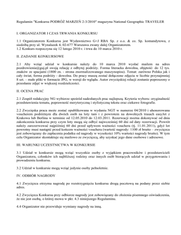 Regulamin "Konkursu PODRÓŻ MARZEŃ 2-3/2010" magazynu National Geographic TRAVELER I. ORGANIZATOR I CZAS TRWANIA KONKURSU 1.1 Organizatorem Konkursu jest Wydawnictwo G+J RBA Sp. z o.o. & co. Sp. komandytowa, z siedzibą przy ul. Wynalazek 4, 02-677 Warszawa zwany dalej Organizatorem. 1.2 Konkurs rozpoczyna się 12 lutego 2010 r. i trwa do 10 marca 2010 r. II. ZADANIE KONKURSOWE 2.1 Aby wziąć udział w konkursie należy do 10 marca 2010 wysłać mailem na adres [email protected] swoją relację z odbytej podróży. Forma literacka dowolna, objętość: do 12 tys. znaków ze spacjami (1800 zn. - strona znormalizowanego maszynopisu). Temat: zarówno Polska jak i cały świat, forma podróży - dowolna. Do pracy muszą zostać dołączone zdjęcia w liczbie przynajmniej 8 szt. – małe pliki w formacie JPG, w wersji do wglądu. Autor zwycięskiej relacji zostanie poproszony o przesłanie zdjęć w większej rozdzielczości. II. OCENA PRAC 2.1 Zespół redakcyjny NG wybierze spośród nadesłanych prac najlepszą. Kryteria wyboru: oryginalność przedstawienia tematu, poprawność merytoryczną i stylistyczną tekstu oraz ciekawe fotografie. 2.2 Zwycięska praca może zostać opublikowana w wydaniu NGT w numerze 04/2010 i uhonorowana voucherem podróżnym dla dwóch osób na loty tam i z powrotem na dowolnych trasach easyJet z Krakowa lub Berlina w terminie od 12.05.2010 do 12.03.2011. Rezerwacji można dokonywać od dnia zakończenia konkursu przy czym loty mogą się odbyć najwcześniej 60 dni od daty rezerwacji. Powrót należy zarezerwować najpóźniej 60 dni przed upływem ważności vouchera (tj. 11.01.2011), gdyż lot powrotny musi nastąpić przed końcem ważności vouchera (wartość nagrody: 1100 zł brutto – zwycięzca jest zobowiązany do zapłacenia podatku od nagrody w wysokości 10% wartości nagrody brutto). W tym celu Organizator skontaktuje się mailowo ze zwycięzcą, aby uzyskać jego dane osobowe i adresowe. III. WARUNKI UCZESTNICTWA W KONKURSIE 3.1 Udział w konkursie mogą wziąć wszystkie osoby z wyjątkiem pracowników i przedstawicieli Organizatora, członków ich najbliższej rodziny oraz innych osób biorących udział w przygotowaniu i prowadzeniu konkursu. 3.2 Udział w konkursie mogą wziąć jedynie osoby pełnoletnie. IV. ODBIÓR NAGRODY 4.1 Zwycięzca otrzyma nagrodę po rozstrzygnięciu konkursu drogą pocztową na podany przez siebie adres. 4.2 Zwycięzca Konkursu przy odbiorze nagrody jest zobowiązany do złożenia pisemnego oświadczenia, że nie jest osobą, o której mowa w pkt. 4.3 niniejszego Regulaminu. 4.4 Organizator nie przewiduje wymiany nagrody na inną. 4.5 Za wygrane nagrody rzeczowe nie przysługuje ekwiwalent pieniężny. V. REKLAMACJE 5.1 Reklamacje związane z Konkursem będą przyjmowane przez NG Traveler wyłącznie w formie pisemnej, na adres NG w terminie 21 dni od daty zakończenia konkursu. 5.2 Wszelkie reklamacje powinny zawierać imię, nazwisko, dokładny adres, datę i, jak również dokładny opis reklamacji. 5.3 Do rozstrzygania reklamacji powołana jest Komisja Reklamacyjna. 5.4 W przypadku przesłania reklamacji złożonej za pośrednictwem poczty, decyduje data doręczenia do Organizatora. 5.5 Złożone przez uczestników reklamacje będą rozpatrywane przez Komisję Reklamacyjną nie później niż w terminie 14 dni od daty otrzymania reklamacji. 5.6 Zainteresowani zostaną powiadomieni o rozpatrzeniu reklamacji listem poleconym najpóźniej w ciągu 7 dni od daty rozpatrzenia reklamacji przez Komisję Reklamacyjną. 5.7 Decyzja Komisji Reklamacyjnej, co do zgłoszonej reklamacji jest ostateczna. VII. POSTANOWIENIA KOŃCOWE 7.1 Regulamin niniejszego Konkursu dostępny jest w siedzibie Organizatora i na stronie Organizatora: www.nationalgeographic.pl. 7.2 Osoby, które nie spełnią któregokolwiek z wymogów określonych w niniejszym Regulaminie lub podadzą nieprawdziwe informacje, zostaną automatycznie zdyskwalifikowane. 7.3 W sprawach nieuregulowanych niniejszym Regulaminem zastosowanie znajdą odpowiednie przepisy Kodeksu Cywilnego, a w szczególności art. 919-921 KC. 7.4 Dane osobowe zwycięzcy konkursu, tj. imię, nazwisko, adres i numer telefonu będą przetwarzane przez Organizatora konkursu wyłącznie na zasadach określonych w regulaminie, w szczególności w celu opublikowania wyników konkursu oraz przekazania laureatowi nagrody konkursowej. Uczestnikowi konkursu przysługuje prawo wglądu do swoich danych oraz ich poprawiania. Podanie danych jest dobrowolne, lecz ich brak uniemożliwia wzięcie udziału w konkursie. Dane osobowe uczestników konkursu będą chronione zgodnie z ustawą o ochronie danych osobowych. Organizator informuje, iż dane osobowe laureata konkursu (tylko imię i nazwisko) zostaną opublikowane w czasopiśmie. Dane osobowe uczestników konkursu mogą być przekazane fundatorowi nagród w celu wykonania przez niego obowiązków wynikających z regulaminu konkursu. 7.5 Przesyłając zgłoszenie na adres podany w pkt. 1.1 Uczestnik potwierdza, że wyraża zgodę na zasady Konkursu zawarte w niniejszym Regulaminie. 7.6 Laureat konkursu wyraża zgodę na NIEODPŁATNE opublikowanie przez organizatora konkursu nadesłanej przez niego pracy oraz zdjęć. Oświadcza jednocześnie, iż posiada zgodę osób, których wizerunki znajdują się na nadesłanych zdjęciach na ich publikację w czasopismach Organizatora konkursu. 7.7 Organizator nie zwraca nadesłanych prac.