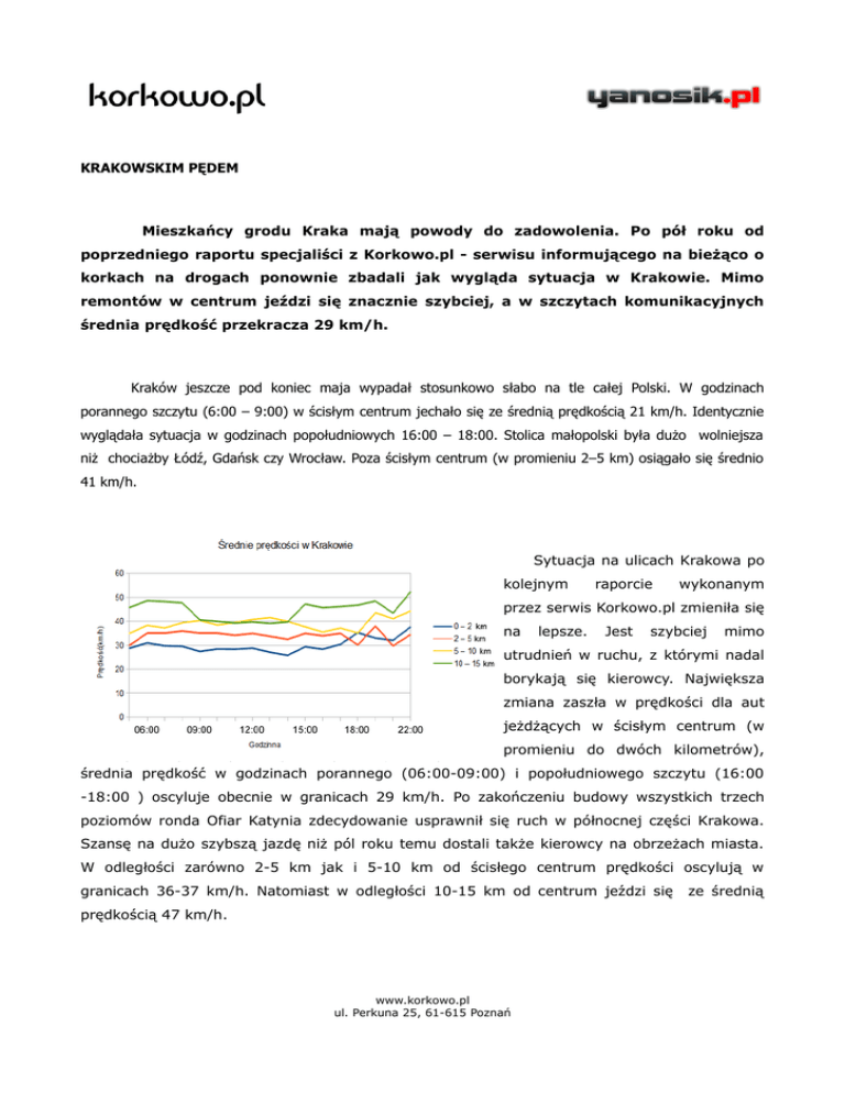 KRAKOWSKIM PĘDEM Mieszkańcy grodu Kraka mają powody do zadowolenia. Po pół roku od poprzedniego raportu specjaliści z Korkowo.pl - serwisu informującego na bieżąco o korkach na drogach ponownie zbadali jak wygląda sytuacja w Krakowie. Mimo remontów w centrum jeździ się znacznie szybciej, a w szczytach komunikacyjnych średnia prędkość przekracza 29 km/h. Kraków jeszcze pod koniec maja wypadał stosunkowo słabo na tle całej Polski. W godzinach porannego szczytu (6:00 – 9:00) w ścisłym centrum jechało się ze średnią prędkością 21 km/h. Identycznie wyglądała sytuacja w godzinach popołudniowych 16:00 – 18:00. Stolica małopolski była dużo wolniejsza niż chociażby Łódź, Gdańsk czy Wrocław. Poza ścisłym centrum (w promieniu 2–5 km) osiągało się średnio 41 km/h. Sytuacja na ulicach Krakowa po kolejnym raporcie wykonanym przez serwis Korkowo.pl zmieniła się na lepsze. Jest szybciej mimo utrudnień w ruchu, z którymi nadal borykają się kierowcy. Największa zmiana zaszła w prędkości dla aut jeżdżących w ścisłym centrum (w promieniu do dwóch kilometrów), średnia prędkość w godzinach porannego (06:00-09:00) i popołudniowego szczytu (16:00 -18:00 ) oscyluje obecnie w granicach 29 km/h. Po zakończeniu budowy wszystkich trzech poziomów ronda Ofiar Katynia zdecydowanie usprawnił się ruch w północnej części Krakowa. Szansę na dużo szybszą jazdę niż pól roku temu dostali także kierowcy na obrzeżach miasta. W odległości zarówno 2-5 km jak i 5-10 km od ścisłego centrum prędkości oscylują w granicach 36-37 km/h. Natomiast w odległości 10-15 km od centrum jeździ się prędkością 47 km/h. www.korkowo.pl ul. Perkuna 25, 61-615 Poznań ze średnią Już wkrótce pełny raport porównujący sytuację na drogach w największych miastach w Polsce. Dane zostały zebrane przez serwis Korkowo.pl, który monitoruje online sytuację na polskich drogach. Analizie poddano dane z urządzeń GPS umieszczonych w tysiącach pojazdów poruszających się po ulicach Krakowa w godzinach od 6:00 do 22:00. W promieniu do 2 kilometrów od ścisłego centrum przeanalizowano prędkości z jakimi poruszają się kierowcy po wszystkich ulicach. W pozostałych odległościach (2-5 km, 5-10 km i 10-15 km) od ścisłego centrum zbadano główne trasy dojazdowe do centrum miasta. Źródło: Korkowo.pl ------------------------------Dystrybucja materiałów: Klaudia Cichocka [email protected] kom./+48/ 519-181-900 www.korkowo.pl ul. Perkuna 25, 61-615 Poznań