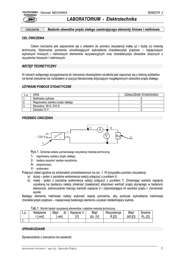 POLITECHNIKA POZNAŃSKA Kierunek MECHANIKA SEMESTR 3 LABORATORIUM - Elektrotechnika ćwiczenie Badanie obwodów prądu stałego zawierającego elementy liniowe i nieliniowe. CEL ĆWICZENIA Celem ćwiczenia jest zapoznanie się z układem do pomiaru rezystancji małej (y) i dużej (x) metodą techniczną. Wykonanie pomiarów umożliwiających wykreślenie charakterystyk prądowo – napięciowych wybranych liniowych i nieliniowych elementów rezystancyjnych oraz charakterystyk obwodów złożonych z rezystorów liniowych i nieliniowych. WSTĘP TEORETYCZNY W ramach wstępnego przygotowania do ćwiczenia obowiązkiem studenta jest zapoznać się z treścią wykładów na temat ćwiczenia lub rozdziałem w pozycji literaturowej dotyczącym rozgałęzionych obwodów prądu stałego. UŻYWANE POMOCE DYDAKTYCZNE L.p. 1. 2. 3. OPIS Multimetry cyfrowe Regulowany zasilacz prądu stałego Rezystory: 39 Ω, 510 Ω Żarówka 12 V OZNACZENIE STANOWISKA 2 2 2 2 PRZEBIEG ĆWICZENIA x + ~ 220 V ~ Y A V - RX 2 1 Rys.1. Schemat układu pomiarowego rezystancji metodą techniczną: 1- regulowany zasilacz prądu stałego, 2- badany rezystor/ zestaw rezystorów, A- amperomierz, V- woltomierz. Połączyć układ zgodnie ze schematem przedstawionym na rys. 1. W przypadku pomiaru rezystancji: a) dużej – jeden z zacisków woltomierza należy połączyć z punktem X; b) małej - jeden z zacisków woltomierza należy połączyć z punktem Y. Zmieniając wartość napięcia uzyskaną na zasilaczu należy zmieniać (zwiększać) stopniowo wartość prądu płynącego w badanym elemencie. Jednocześnie mierząc wartość napięcia U i odpowiadające im wartości prądu I. Zanotować wyniki. Badając elementy nieliniowe należy wykonać więcej pomiarów, aby podczas wykreślania nieliniowej charakterystyki prądowo – napięciowej badanego elementu uzyskać dokładniejszy wykres. Tab.1. Wyniki badań rezystancji elementów i układów metodą techniczną: L.p. Natężenie I [ mA] Błąd ΔI [ mA] Napięcie U [V] Błąd ΔU [V] Rezystancja R [Ω] Błąd ΔR [Ω] Średnia Rśr. [Ω] 1. SPRAWOZDANIE Sprawozdanie z ćwiczenia ma zawierać: opracowanie ćwiczenia – mgr inż. Agnieszka Kupiec, 1 POLITECHNIKA POZNAŃSKA Kierunek MECHANIKA SEMESTR 3 LABORATORIUM - Elektrotechnika 1. Schemat badanego obwodu na zajęciach; 2. Pomiary rezystancji metodą techniczną rezystora 39 Ω, 510 Ω oraz żarówki (przy natężeniu do 0,20 A); 3. Pomiary rezystancji metodą techniczną:  połączenia szeregowe żarówki i rezystora 39 Ω,  połączenia równolegle żarówki i rezystora 39 Ω. 4. Tabele zawierające wyniki pomiarów przeprowadzonych na zajęciach; 5. Dokładność wskazań na poszczególnych zakresach pomiarowych podanych na zajęciach; 6. Poza zajęciami: rachunek błędu ( wzór z wyprowadzeniem z różniczki zupełnej oraz wykonać wszystkie niezbędne podstawienia dla pierwszego wiersza z każdej tabeli pomiarów); 7. Poza zajęciami: na podstawie uzyskanych wyników pomiarów sporządzić charakterystyki prądowo – napięciowej I = f( U) dla: wszystkich badanych układów ( 5 wykresów); 8. Analiza i wnioski. ZAGADNIENIA 1. 2. 3. 4. 5. Prawo Ohma. Łączenie rezystorów. Pomiar rezystancji metodą techniczną. Rezystory liniowe i nieliniowe. Oznaczenia na skalach mierników. LITERATURA 1. Bolkowski S.: Elektrotechnika, WSiP, Warszawa 2005; 2. Kurdziel R.: Podstawy elektrotechniki, WNT, W-wa 1972; 3. Ohydo W.: Elektrotechnika i elektronika dla studentów wydziałów nieelektrycznych, Wydawnictwo Politechniki Poznańskiej 2012. opracowanie ćwiczenia – mgr inż. Agnieszka Kupiec, 2