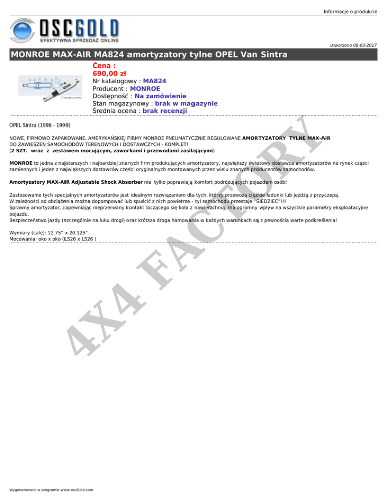 Informacje o produkcie Utworzono 08-03-2017 MONROE MAX-AIR MA824 amortyzatory tylne OPEL Van Sintra Cena : 690,00 zł Nr katalogowy : MA824 Producent : MONROE Dostępność : Na zamówienie Stan magazynowy : brak w magazynie Średnia ocena : brak recenzji OPEL Sintra (1996 - 1999) R Y NOWE, FIRMOWO ZAPAKOWANE, AMERYKAŃSKIEJ FIRMY MONROE PNEUMATYCZNIE REGULOWANE AMORTYZATORY TYLNE MAX-AIR DO ZAWIESZEŃ SAMOCHODÓW TERENOWYCH I DOSTAWCZYCH - KOMPLET! (2 SZT. wraz z zestawem mocującym, zaworkami i przewodami zasilającymi) MONROE to jedna z najstarszych i najbardziej znanych firm produkujących amortyzatory, największy światowy dostawca amortyzatorów na rynek części zamiennych i jeden z największych dostawców części oryginalnych montowanych przez wielu znanych producentów samochodów. TO Amortyzatory MAX-AIR Adjustable Shock Absorber nie tylko poprawiają komfort podróżujących pojazdem osób! C Zastosowanie tych specjalnych amortyzatorów jest idealnym rozwiązaniem dla tych, którzy przewożą ciężkie ładunki lub jeżdżą z przyczepą. W zależności od obciążenia można dopompować lub spuścić z nich powietrze - tył samochodu przestaje “SIEDZIEĆ”!!! Sprawny amortyzator, zapewniając nieprzerwany kontakt toczącego się koła z nawierzchnią, ma ogromny wpływ na wszystkie parametry eksploatacyjne pojazdu. Bezpieczeństwo jazdy (szczególnie na łuku drogi) oraz krótsza droga hamowania w każdych warunkach są z pewnością warte podkreślenia! 4X 4 FA Wymiary (cale): 12.75" x 20.125" Mocowania: oko x oko (LS26 x LS26 ) Wygenerowano w programie www.oscGold.com