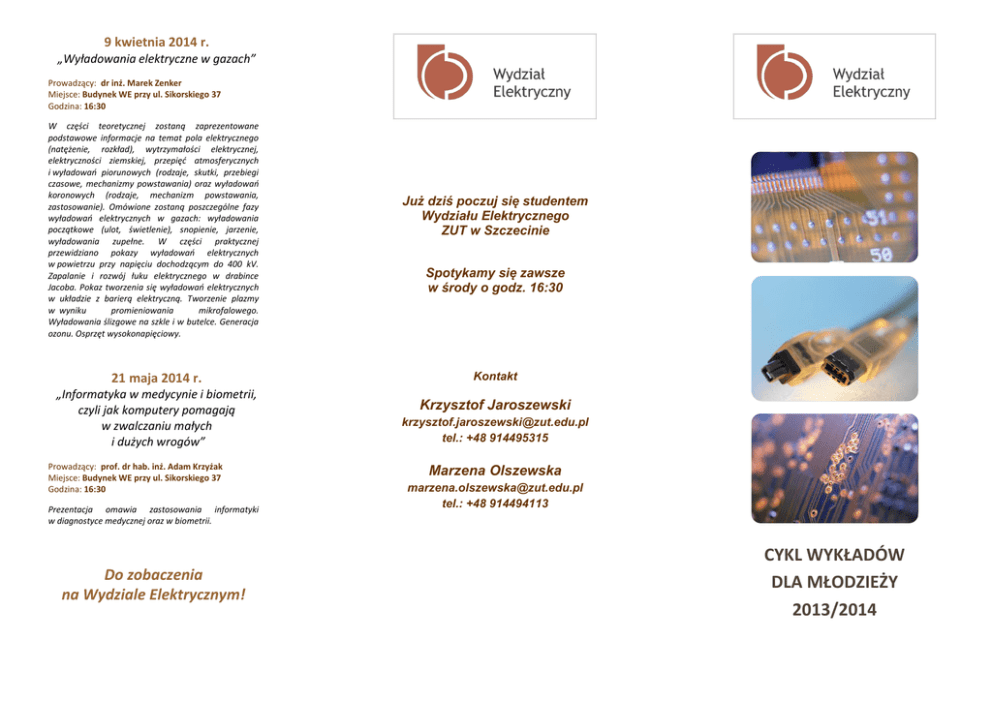 9 kwietnia 2014 r. „Wyładowania elektryczne w gazach” Prowadzący: dr inż. Marek Zenker Miejsce: Budynek WE przy ul. Sikorskiego 37 Godzina: 16:30 W części teoretycznej zostaną zaprezentowane podstawowe informacje na temat pola elektrycznego (natężenie, rozkład), wytrzymałości elektrycznej, elektryczności ziemskiej, przepięć atmosferycznych i wyładowań piorunowych (rodzaje, skutki, przebiegi czasowe, mechanizmy powstawania) oraz wyładowań koronowych (rodzaje, mechanizm powstawania, zastosowanie). Omówione zostaną poszczególne fazy wyładowań elektrycznych w gazach: wyładowania początkowe (ulot, świetlenie), snopienie, jarzenie, wyładowania zupełne. W części praktycznej przewidziano pokazy wyładowań elektrycznych w powietrzu przy napięciu dochodzącym do 400 kV. Zapalanie i rozwój łuku elektrycznego w drabince Jacoba. Pokaz tworzenia się wyładowań elektrycznych w układzie z barierą elektryczną. Tworzenie plazmy w wyniku promieniowania mikrofalowego. Wyładowania ślizgowe na szkle i w butelce. Generacja ozonu. Osprzęt wysokonapięciowy. 21 maja 2014 r. „Informatyka w medycynie i biometrii, czyli jak komputery pomagają w zwalczaniu małych i dużych wrogów” Prowadzący: prof. dr hab. inż. Adam Krzyżak Miejsce: Budynek WE przy ul. Sikorskiego 37 Godzina: 16:30 Prezentacja omawia zastosowania informatyki w diagnostyce medycznej oraz w biometrii. Do zobaczenia na Wydziale Elektrycznym! Już dziś poczuj się studentem Wydziału Elektrycznego ZUT w Szczecinie Spotykamy się zawsze w środy o godz. 16:30 Kontakt Krzysztof Jaroszewski [email protected] tel.: +48 914495315 Marzena Olszewska [email protected] tel.: +48 914494113 CYKL WYKŁADÓW DLA MŁODZIEŻY 2013/2014 15 stycznia 2014 r. 23 października 2013 r. „Czy robot może chodzić jak człowiek? Wstęp do robotyki humanoidalnej.” Prowadzący: mgr inż. Adam Łukomski Miejsce: Budynek WE przy ul. 26-go Kwietnia 10 Godzina: 16:30 HARMONOGRAM WYKŁADÓW Na wykładzie będzie można dowiedzieć się jak zmusić robota by w 10 sekund powtórzył to, czego człowiek uczy się przez pierwsze 10 lat swojego życia. Ponadto przedstawione zostaną podstawowe metody projektowania i sterowania oraz problemy dotyczące robotów kroczących oraz porównane zostaną osiągnięcia z różnych ośrodków badawczych na świecie dotyczące tematyki robotów humanoidalnych. 20 listopada 2013 r. „Co potrafi mikroprocesor?” 25 września 2013 r. „Elektronika w informatyce, informatyka w automatyce i robotyce, robotyka w elektronice, czyli techniczny krąg współzależności” Prowadzący: dr inż. Rafał Osypiuk, dr inż. Krzysztof Jaroszewski Miejsce: Budynek WE przy ul. 26-go Kwietnia 10 Godzina: 16:30 W ramach wykładu, jak i prezentacji w pracowniach i laboratoriach przedstawiona zostanie ścisła współzależność takich dziedzin nauki i techniki jak automatyka, robotyka, informatyka, telekomunikacja, elektronika i elektrotechnika. Pokazane zostaną elementy systemów automatycznych, zrobotyzowanych linii produkcyjnych oraz prace Koła Naukowego SARIS związane z robotyką. Prowadzący: mgr inż. Andrzej Biedka Miejsce: Budynek WE przy ul. 26-go Kwietnia 10 Godzina: 16:30 Podczas wykładu przedstawione zostaną krótki rys historyczny i budowa mikroprocesora, sposób działania mikroprocesora oraz wyjaśnione zostanie, co to jest software i gdzie możemy spotkać mikroprocesor. Ponadto odbędą się pokazy urządzeń wykorzystujących mikroprocesory: projekty studentów, roboty Koła Naukowego SKORP. 11 grudnia 2013 r. „Internet optyczny z dostawą do domu” Prowadzący: dr inż. Mirosław Puc, mgr inż. Andrzej Niesterowicz Miejsce: Budynek WE przy ul. 26-go Kwietnia 10 Godzina: 16:30 Na wykładzie przedstawiona zostanie budowa, zasada działania i cechy charakterystyczne światłowodowej sieci dostępowej typu FTTH doprowadzonej do domu abonenta. Ponadto uczestnicy zaproszeni zostaną do Laboratorium Optycznych Sieci Odniesienia. „Sieciowe multimedialne centrum rozrywki” Prowadzący: dr inż. Piotr Lech Miejsce: Budynek WE przy ul. 26-go Kwietnia 10 Godzina: 16:30 W ramach wykładu omówiona zostanie budowa sieciowego multimedialnego centrum rozrywki na tle rozwiązań komercyjnych i darmowych. Ponadto zaprezentowane zostaną dedykowane i uniwersalne platformy sprzętowe i popularne usługi multimedialne oraz protokoły sieciowe wspierające aplikacje multimedialne. Przedyskutowane zostaną także perspektywy rozwoju sieciowych multimedialnych centrów rozrywki. 12 lutego 2014 r. „Nowoczesne instalacje elektryczne i oświetleniowe” Prowadzący: dr inż. Piotr Cierzniewski Miejsce: Budynek WE przy ul. Sikorskiego 37 Godzina: 16:30 W programie wykładu: omówienie podstawowych parametrów techniki oświetleniowej, źródeł światła i opraw oświetleniowych, systemów oświetlenia dziennego oraz możliwości sterowania systemem oświetleniowym, instalacji elektrycznych sterowanych radiowo oraz sposobów oszczędzania energii elektrycznej w instalacjach elektrycznych, w tym oświetleniowych. 12 marca 2014 r. „Termowizja, czyli jak zobaczyć niewidzialne” Prowadzący: mgr inż. Barbara Szymanik Miejsce: Budynek WE przy ul. Sikorskiego 37 Godzina: 16:30 Na wykładzie wyjaśnione zostanie co to jest promieniowanie podczerwone, jakie są jego naturalne sztuczne źródła oraz jak działają jego detektory. Ponadto przedstawimy w jaki sposób można "zobaczyć" niewidzialne dla oka ludzkiego promieniowanie podczerwone za pomocą kamery termowizyjnej. Zaprezentujemy również jak wykorzystać kamerę termowizyjną do badań nieniszczących materiałów kompozytowych wykorzystywanych w lotnictwie i transporcie morskim.
