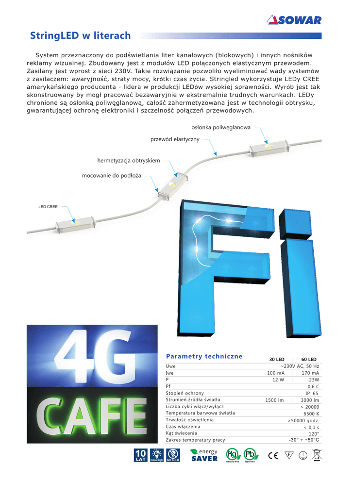 StringLED w literach System przeznaczony do podœwietlania liter kana³owych (blokowych) i innych noœników reklamy wizualnej. Zbudowany jest z modu³ów LED po³¹czonych elastycznym przewodem. Zasilany jest wprost z sieci 230V. Takie rozwi¹zanie pozwoli³o wyeliminowaæ wady systemów z zasilaczem: awaryjnoœæ, straty mocy, krótki czas ¿ycia. Stringled wykorzystuje LEDy CREE amerykañskiego producenta - lidera w produkcji LEDów wysokiej sprawnoœci. Wyrób jest tak skonstruowany by móg³ pracowaæ bezawaryjnie w ekstremalnie trudnych warunkach. LEDy chronione s¹ os³onk¹ poliwêglanow¹, ca³oœæ zahermetyzowana jest w technologii obtrysku, gwarantuj¹cej ochronê elektroniki i szczelnoœæ po³¹czeñ przewodowych. os³onka poliwêglanowa przewód elastyczny hermetyzacja obtryskiem mocowanie do pod³o¿a LED CREE Parametry techniczne Uwe Iwe P Pf Stopieñ ochrony Strumieñ Ÿród³a œwiat³a Liczba cykli w³¹cz/wy³¹cz Temperatura barwowa œwiat³a Trwa³oœæ oœwietlenia Czas w³¹czenia K¹t œwiecenia Zakres temperatury pracy 30 LED 60 LED ~ 230V AC, 50 Hz 100 mA 170 mA 12 W 23W 0,6 C IP 65 1500 lm 3000 lm > 20000 6500 K >50000 godz. < 0,1 s 120° -30° ÷ +50°C INSTALACJA STRINGLED MPA Podœwietlenie reklam Stringled budowane jest z zestawów podstawowych 30 LED lub 60 LED. Ka¿dy zestaw zabezpieczony jest przed szkodliwymi oddzia³ywaniami z sieci elektrycznej modu³em przeciw awaryjnym MPA. Zawiera on elektroniczne uk³ady zabezpieczeñ: przeciwprzepiêcowy, przeciwzwarciowy, stabilizacji pr¹dowej, stabilizacji temperaturowej. MPA zabezpiecza zestaw stringled przed przepiêciami z sieci energetycznej do 4 kV. MONTA¯ Wiemy w jakich trudnych warunkach przychodzi czasem montowaæ podœwietlenie reklamy. Dlatego nasz system zaprojektowaliœmy tak, by monta¿ by³ b³yskawiczny i pewny. Modu³y montuje siê do PCV spienionego zszywkami tapicerskimi. Na innych pod³o¿ach mo¿na kleiæ termoklejem do takich pod³o¿y przeznaczonych. Modu³ MPA zszywka tapicerska INSTALACJA ELEKTRYCZNA Ka¿dy zestaw stringled jest odrêbnym i niezale¿nym uk³adem elektronicznych. Zestawów nie wolno ci¹æ, skracaæ ani ³¹czyæ miêdzy sob¹. W ca³ym zestawie panuje napiêcie niebezpieczne. Wszelkie prace instalacyjne nale¿y wykonywaæ przy od³¹czonym zestawie od sieci elektrycznej. Instalacjê powinna wykonaæ osoba posiadaj¹ca kwalifikacje do budowania instalacji 230V. RÓNOMIERNE OŒWIETLENIE Dla zapewnienia równomiernoœci œwiat³a na oœwietlanej powierzchni konieczne jest spe³nienie warunku: odleg³oœæ StringLEDów od lica litery musi byæ wiêksza ni¿ odleg³oœæ miêdzy modu³ami LED. lico litery T T R<T R PROJEKTOWANIE Rozk³ad punktów LED w literach zapewniaj¹cy równomierne oœwietlenie wymaga du¿ego doœwiadczenia lub specjalistycznego oprogramowania. Oferujemy us³ugê projektowania rozmieszczenia stringled w literach. Nasze projekty gwarantuj¹, ¿e zu¿ycie energii i koszt podœwietlenia bêd¹ minimalne. A + + + + + + + + + + + + + + + produkt polski Producent: Sowar Sp. z o.o., ul. Ziemniaczana 15, 52-127 Wroc³aw, tel. 71 343-65-23, www.sowarled.pl