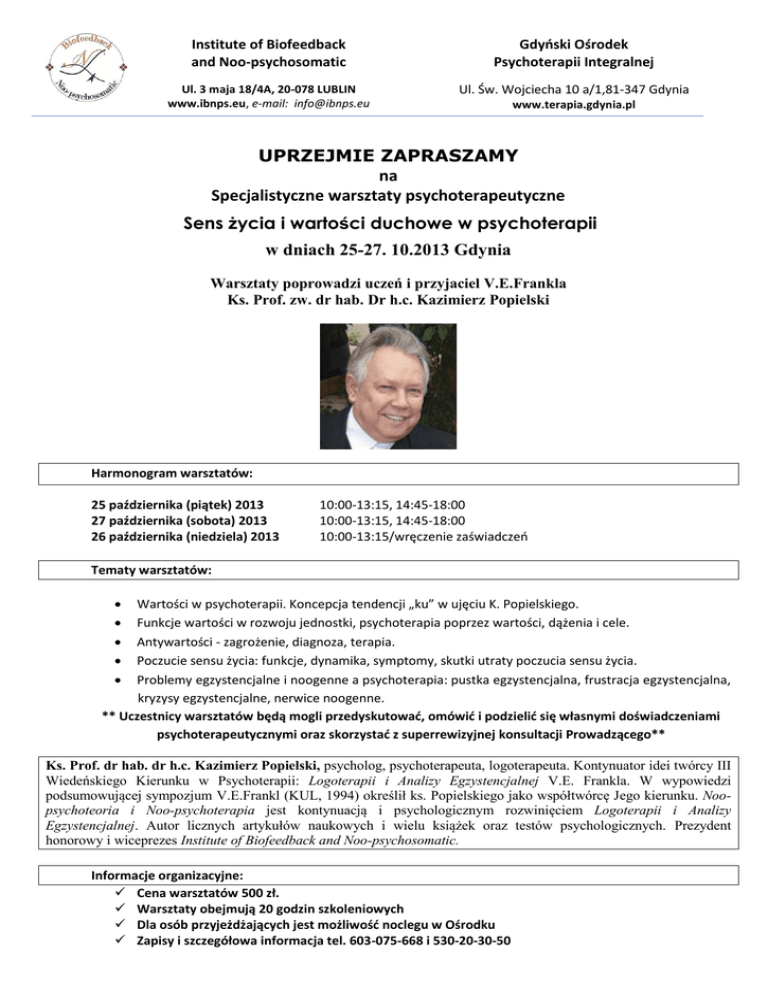 Institute of Biofeedback and Noo-psychosomatic Gdyoski Ośrodek Psychoterapii Integralnej Ul. 3 maja 18/4A, 20-078 LUBLIN www.ibnps.eu, e-mail: [email protected] Ul. Św. Wojciecha 10 a/1,81-347 Gdynia www.terapia.gdynia.pl UPRZEJMIE ZAPRASZAMY na Specjalistyczne warsztaty psychoterapeutyczne Sens życia i wartości duchowe w psychoterapii w dniach 25-27. 10.2013 Gdynia Warsztaty poprowadzi uczeń i przyjaciel V.E.Frankla Ks. Prof. zw. dr hab. Dr h.c. Kazimierz Popielski Harmonogram warsztatów: 25 października (piątek) 2013 27 października (sobota) 2013 26 października (niedziela) 2013 10:00-13:15, 14:45-18:00 10:00-13:15, 14:45-18:00 10:00-13:15/wręczenie zaświadczeo Tematy warsztatów: Wartości w psychoterapii. Koncepcja tendencji „ku” w ujęciu K. Popielskiego. Funkcje wartości w rozwoju jednostki, psychoterapia poprzez wartości, dążenia i cele. Antywartości - zagrożenie, diagnoza, terapia. Poczucie sensu życia: funkcje, dynamika, symptomy, skutki utraty poczucia sensu życia. Problemy egzystencjalne i noogenne a psychoterapia: pustka egzystencjalna, frustracja egzystencjalna, kryzysy egzystencjalne, nerwice noogenne. ** Uczestnicy warsztatów będą mogli przedyskutowad, omówid i podzielid się własnymi doświadczeniami psychoterapeutycznymi oraz skorzystad z superrewizyjnej konsultacji Prowadzącego** Ks. Prof. dr hab. dr h.c. Kazimierz Popielski, psycholog, psychoterapeuta, logoterapeuta. Kontynuator idei twórcy III Wiedeńskiego Kierunku w Psychoterapii: Logoterapii i Analizy Egzystencjalnej V.E. Frankla. W wypowiedzi podsumowującej sympozjum V.E.Frankl (KUL, 1994) określił ks. Popielskiego jako współtwórcę Jego kierunku. Noopsychoteoria i Noo-psychoterapia jest kontynuacją i psychologicznym rozwinięciem Logoterapii i Analizy Egzystencjalnej. Autor licznych artykułów naukowych i wielu książek oraz testów psychologicznych. Prezydent honorowy i wiceprezes Institute of Biofeedback and Noo-psychosomatic. Informacje organizacyjne: Cena warsztatów 500 zł. Warsztaty obejmują 20 godzin szkoleniowych Dla osób przyjeżdżających jest możliwośd noclegu w Ośrodku Zapisy i szczegółowa informacja tel. 603-075-668 i 530-20-30-50