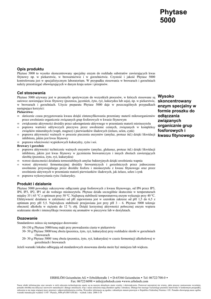 Phytase 5000 Opis produktu Phytase 5000 to wysoko skoncentrowany specjalny enzym do rozkładu substratów zawierających kwas fitynowy np. w piekarstwie, w browarnictwie i w gorzelnictwie. Czystość i jakość Phytase 5000 kontrolowana jest w specjalistycznym laboratorium. W przypadku stosowania w browarach i gorzelniach należy przestrzegać obowiązujących w danym kraju ustaw i przepisów. Cel stosowania Phytase 5000 używany jest w przemyśle spożywczym do wszystkich procesów, w których stosowane są surowce zawierające kwas fitynowy (pszenica, jęczmień, żyto, ryż, kukurydza lub soja), np. w piekarstwie, w browarach i gorzelniach. Użycie preparatu Phytase 5000 daje w poszczególnych przypadkach następujące korzyści: Piekarstwo: • skrócenie czasu przygotowania kwasu dzięki zintensyfikowaniu przemiany materii mikroorganizmów przez uwolnienie organicznie związanych grup fosforowych w kwasie fitynowym • zwiększenie aktywności drożdży przez udostępnienie aktywnego w przemianie materii mioinozytolu • poprawa wartości odżywczych pieczywa przez uwolnienie cennych, związanych w kompleksy związków mineralnych (wapń, magnez) i pierwiastków śladowych (żelazo, selen, cynk) • poprawa aktywności ważnych w procesie pieczenia enzymów (amylaz, proteaz itd.) dzięki likwidacji inhibitora, jakim jest kwas fitynowy • poprawa właściwości wypiekowych kukurydzy, ryżu i soi. Browary i gorzelnie • poprawa aktywności technicznie ważnych enzymów (amylaz, glukanaz, proteaz itd.) dzięki likwidacji inhibitora, jakim jest kwas fitynowy w jęczmieniu browarniczym i innych zbożach zawierających skrobię (pszenica, żyto, ryż, kukurydza) • wzrost skuteczności działania termostabilnych amylaz bakteryjnych dzięki uwolnieniu wapnia • wzrost aktywności fermentacyjnej drożdży browarniczych i gorzelniczych przez jednoczesne uwolnienie przyswajalnego przez drożdże fosforu i mioinozytolu z kwasu fitynowego oraz przez uwolnienie aktywnych w przemianie materii pierwiastków śladowych, jak żelazo, selen i cynk • poprawa wykorzystania ryżu i kukurydzy. Wysoko skoncentrowany enzym specjalny w formie proszku do odłączania związanych organicznie grup fosforowych i kwasu fitynowego Produkt i działanie Phytase 5000 powoduje sukcesywne odłączanie grup fosforowych z kwasu fitynowego, od IP6 przez IP5, IP4, IP3, IP2, IP1 aż do wolnego mioinozytolu. Phytase działa szczególnie skutecznie w temperaturach między 35 i 65 °C z optimum przy 50 ºC. Najlepszą stabilność temperaturową enzym wykazuje przy 40 ºC. Efektywność działania w zależności od pH zapewniona jest w szerokim zakresie od pH 1,5 do 6,5 z optimum przy pH 5,5. Największa stabilność przejawiana jest przy pH 3 – 6. Phytase 5000 toleruje obecność alkoholu w stężeniu do 12 % obj. Dzięki korzystnej aktywności pobocznej enzym wspiera scukrzanie skrobi i intensyfikuje tworzenie się aromatów w pieczywie lub w destylatach. Dozowanie Standardowo zaleca się następujące dozowanie: 50-150 g Phytase 5000/tonę mąki przy prowadzeniu ciasta w piekarstwie 30- 50 g Phytase 5000/tonę zboża (pszenica, żyto, ryż, kukurydza) przy rozkładzie skrobi w gorzelniach i browarach 20- 30 g Phytase 5000/ tonę zboża (pszenica, żyto, ryż, kukurydza) w czasie fermentacji alkoholowej w gorzelniach i browarach Jeżeli warunki lokalne odbiegają od standardowych stosowana dawka może być mniejsza lub większa. ERBSLÖH Geisenheim AG Erbslöhstraße 1 D-65366 Geisenheim Tel: 06722/708-0 Fax: 06722/6098 [email protected] www.erbsloeh.com Nasze ulotki informacyjne oraz zawarte w nich zalecenia technologiczne oparte są na naszym aktualnym stanie wiedzy i doświadczeniu. Ponieważ najczęściej nie wiemy, jakie procesy zastosowano wcześniej, ponadto obróbka ma dotyczyć surowców naturalnych i dlatego zmiennych, więc i nasze zalecenia mają charakter ogólny i doradczy. Dlatego bez naszego wyrażonego pisemnie stanowiska w konkretnym przypadku, zalecenia te nie mają wiążącej mocy prawnej z odpowiedzialnością cywilną. Wszystkie informacje są zgodne z aktualnym stanem prawnym w Republice Federalnej Niemiec i UE. Ponadto obowiązują nasze ogólne warunki transakcyjne wydanie 11/05 - Phytase_5000 pl%5B1%5D.doc – wydruk z dnia 2008-3-18 Phytase 5000 Sposób użycia Piekarstwo: Jeżeli Phytase 5000 dodawany jest w formie suchego proszku do mieszanek piekarskich, to należy go dobrze rozprowadzić w całej objętości. Jeżeli enzym ma być dodawany do ciasta, płynnych słodów i ekstraktów, to należy zmieszać go z małą ilością wody, następnie rozpuścić przez dodanie kolejnej, niewielkiej porcji wody, dodać do produktu i wymieszać. Preparat powinien być równomiernie rozprowadzony w całej objętości surowca. Phytase 5000 działa przy prowadzeniu ciasta w temperaturach 25-35 °C i zależnie od zastosowania (kwas) do 24 godzin. Gorzelnie i browary: Phytase 5000 stosowany jest do rozkładu skrobi we wszystkich procesach, w których upłynnienie lub scukrzanie zachodzi w temperaturze 50-60 °C. Wartość pH zacieru gorzelnianego może leżeć przy tym zarówno w wysokim zakresie aktywności enzymów bakteryjnych około pH 6, jak i w niskim zakresie aktywności enzymów pleśniowych ok. pH 4. W przypadku rozkładu skrobi czas aktywności leży na ogół między 0,5 i 2,0 godziny, natomiast w czasie fermentacji Phytase 5000 aktywna jest przez cały czas trwania procesu – zwykle 72 godziny. Magazynowanie Jeżeli warunki składowania są optymalne (0–10 °C) Phytase 5000 zachowuje aktywność przez 36 miesięcy. Wyższe temperatury składowania skracają trwałość preparatu. Unikać należy temperatur pow. 25 ºC. Napoczęte opakowanie należy szczelnie zamknąć i jak najszybciej zużyć. Właściwości ogólne 100 100 80 80 relative Aktivität [%] relative Aktivität [%] Charakterystyka enzymu: Phytase 5000 jest aktywny w zakresie pH od 1,5 do 6,5, optimum przejawia przy pH od 2