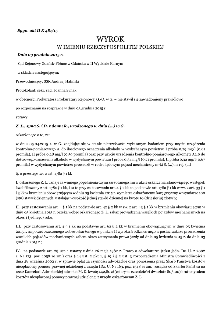 Sygn. akt II K 481/15 WYROK W IMIENIU RZECZYPOSPOLITEJ POLSKIEJ Dnia 03 grudnia 2015 r. Sąd Rejonowy Gdańsk-Północ w Gdańsku w II Wydziale Karnym w składzie następującym: Przewodniczący: SSR Andrzej Haliński Protokolant: sekr. sąd. Joanna Synak w obecności Prokuratora Prokuratury Rejonowej G.-O. w G. – nie stawił się zawiadomiony prawidłowo po rozpoznaniu na rozprawie w dniu 03 grudnia 2015 r. sprawy: Z. L., syna S. i D. z domu R., urodzonego w dniu (...) w G. oskarżonego o to, że: w dniu 05.04.2015 r. w G. znajdując się w stanie nietrzeźwości wykazanym badaniem przy użyciu urządzenia kontrolno-pomiarowego A. do ilościowego oznaczenia alkoholu w wydychanym powietrzu I próba 0,29 mg/l (0,61 promila), II próba 0,28 mg/l (0,59 promila) oraz przy użyciu urządzenia kontrolno-pomiarowego Alkometr A2.0 do ilościowego oznaczenia alkoholu w wydychanym powietrzu I próba 0,34 mg/l (0,71 promila), II próba 0,32 mg/l (0,67 promila) w wydychanym powietrzu prowadził w ruchu lądowym pojazd mechaniczny m-ki S. (...) nr rej. (...) tj. o przestępstwo z art. 178a § 1 kk I. oskarżonego Z. L. uznaje za winnego popełnienia czynu zarzucanego mu w akcie oskarżenia, stanowiącego występek kwalifikowany z art. 178a § 1 kk, i za to przy zastosowaniu art. 4 § 1 kk na podstawie art. 178a § 1 kk w zw. z art. 33 § 1 i 3 kk w brzmieniu obowiązującym w dniu 05 kwietnia 2015 r. wymierza oskarżonemu karę grzywny w wymiarze 100 (stu) stawek dziennych, ustalając wysokość jednej stawki dziennej na kwotę 10 (dziesięciu) złotych; II. przy zastosowaniu art. 4 § 1 kk na podstawie art. 42 § 2 kk w zw. z art. 43 § 1 kk w brzmieniu obowiązującym w dniu 05 kwietnia 2015 r. orzeka wobec oskarżonego Z. L. zakaz prowadzenia wszelkich pojazdów mechanicznych na okres 1 (jednego) roku; III. przy zastosowaniu art. 4 § 1 kk na podstawie art. 63 § 2 kk w brzmieniu obowiązującym w dniu 05 kwietnia 2015 r. na poczet orzeczonego wobec oskarżonego w punkcie II wyroku środka karnego w postaci zakazu prowadzenia wszelkich pojazdów mechanicznych zalicza okres zatrzymania prawa jazdy od dnia 05 kwietnia 2015 r. do dnia 03 grudnia 2015 r.; IV. na podstawie art. 29 ust. 1 ustawy z dnia 26 maja 1982 r. Prawo o adwokaturze (tekst jedn. Dz. U. z 2002 r. Nr 123, poz. 1058 ze zm.) oraz § 14 ust. 2 pkt 1, § 19 i § 2 ust. 3 rozporządzenia Ministra Sprawiedliwości z dnia 28 września 2002 r. w sprawie opłat za czynności adwokackie oraz ponoszenia przez Skarb Państwa kosztów nieopłaconej pomocy prawnej udzielonej z urzędu (Dz. U. Nr 163, poz. 1348 ze zm.) zasądza od Skarbu Państwa na rzecz Kancelarii Adwokackiej adwokat M. D. kwotę 442,80 zł (czterysta czterdzieści dwa złote 80/100) brutto tytułem kosztów nieopłaconej pomocy prawnej udzielonej z urzędu oskarżonemu Z. L.; V. na podstawie art. 626 § 1 kpk, art. 627 kpk i art. 1, art. 3 ust. 1 ustawy z dnia 23 czerwca 1973 r. o opłatach w sprawach karnych (tekst jedn. Dz. U. z 1983 r. Nr 49 poz. 223 ze zm.) zasądza od oskarżonego Z. L. na rzecz Skarbu Państwa opłatę w kwocie 100,00 zł (sto złotych), zaś na podstawie art. 626 § 1 kpk, art. 624 § 1 kpk w pozostałym zakresie zwalnia oskarżonego od zapłaty na rzecz Skarbu Państwa kosztów sądowych.