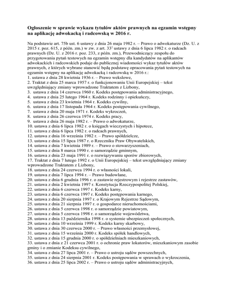 Ogłoszenie w sprawie wykazu tytułów aktów prawnych na egzamin wstępny na aplikację adwokacką i radcowską w 2016 r. Na podstawie art. 75b ust. 6 ustawy z dnia 26 maja 1982 r. – Prawo o adwokaturze (Dz. U. z 2015 r. poz. 615, z późn. zm.) w zw. z art. 332 ustawy z dnia 6 lipca 1982 r. o radcach prawnych (Dz. U. z 2016 r. poz. 233, z późn. zm.), Przewodniczący zespołu do przygotowania pytań testowych na egzamin wstępny dla kandydatów na aplikantów adwokackich i radcowskich podaje do publicznej wiadomości wykaz tytułów aktów prawnych, z których wybrane stanowić będą podstawę opracowania pytań testowych na egzamin wstępny na aplikację adwokacką i radcowską w 2016 r.: 1. ustawa z dnia 28 kwietnia 1936 r. – Prawo wekslowe, 2. Traktat z dnia 25 marca 1957 r. o funkcjonowaniu Unii Europejskiej – tekst uwzględniający zmiany wprowadzone Traktatem z Lizbony, 3. ustawa z dnia 14 czerwca 1960 r. Kodeks postępowania administracyjnego, 4. ustawa z dnia 25 lutego 1964 r. Kodeks rodzinny i opiekuńczy, 5. ustawa z dnia 23 kwietnia 1964 r. Kodeks cywilny, 6. ustawa z dnia 17 listopada 1964 r. Kodeks postępowania cywilnego, 7. ustawa z dnia 20 maja 1971 r. Kodeks wykroczeń, 8. ustawa z dnia 26 czerwca 1974 r. Kodeks pracy, 9. ustawa z dnia 26 maja 1982 r. – Prawo o adwokaturze, 10. ustawa z dnia 6 lipca 1982 r. o księgach wieczystych i hipotece, 11. ustawa z dnia 6 lipca 1982 r. o radcach prawnych, 12. ustawa z dnia 16 września 1982 r. – Prawo spółdzielcze, 13. ustawa z dnia 15 lipca 1987 r. o Rzeczniku Praw Obywatelskich, 14. ustawa z dnia 7 kwietnia 1989 r. – Prawo o stowarzyszeniach, 15. ustawa z dnia 8 marca 1990 r. o samorządzie gminnym, 16. ustawa z dnia 23 maja 1991 r. o rozwiązywaniu sporów zbiorowych, 17. Traktat z dnia 7 lutego 1992 r. o Unii Europejskiej – tekst uwzględniający zmiany wprowadzone Traktatem z Lizbony, 18. ustawa z dnia 24 czerwca 1994 r. o własności lokali, 19. ustawa z dnia 7 lipca 1994 r. – Prawo budowlane, 20. ustawa z dnia 6 grudnia 1996 r. o zastawie rejestrowym i rejestrze zastawów, 21. ustawa z dnia 2 kwietnia 1997 r. Konstytucja Rzeczypospolitej Polskiej, 22. ustawa z dnia 6 czerwca 1997 r. Kodeks karny, 23. ustawa z dnia 6 czerwca 1997 r. Kodeks postępowania karnego, 24. ustawa z dnia 20 sierpnia 1997 r. o Krajowym Rejestrze Sądowym, 25. ustawa z dnia 21 sierpnia 1997 r. o gospodarce nieruchomościami, 26. ustawa z dnia 5 czerwca 1998 r. o samorządzie powiatowym, 27. ustawa z dnia 5 czerwca 1998 r. o samorządzie województwa, 28. ustawa z dnia 13 października 1998 r. o systemie ubezpieczeń społecznych, 29. ustawa z dnia 10 września 1999 r. Kodeks karny skarbowy, 30. ustawa z dnia 30 czerwca 2000 r. – Prawo własności przemysłowej, 31. ustawa z dnia 15 września 2000 r. Kodeks spółek handlowych, 32. ustawa z dnia 15 grudnia 2000 r. o spółdzielniach mieszkaniowych, 33. ustawa z dnia z 21 czerwca 2001 r. o ochronie praw lokatorów, mieszkaniowym zasobie gminy i o zmianie Kodeksu cywilnego, 34. ustawa z dnia 27 lipca 2001 r. – Prawo o ustroju sądów powszechnych, 35. ustawa z dnia 24 sierpnia 2001 r. Kodeks postępowania w sprawach o wykroczenia, 36. ustawa z dnia 25 lipca 2002 r. – Prawo o ustroju sądów administracyjnych, 37. ustawa z dnia 30 sierpnia 2002 r. – Prawo o postępowaniu przed sądami administracyjnymi, 38. ustawa z dnia 23 listopada 2002 r. o Sądzie Najwyższym, 39. ustawa z dnia 28 lutego 2003 r. – Prawo upadłościowe, 40. ustawa z dnia 13 marca 2003 r. o szczególnych zasadach rozwiązywania z pracownikami stosunków pracy z przyczyn niedotyczących pracowników, 41. ustawa z dnia 27 marca 2003 r. o planowaniu i zagospodarowaniu przestrzennym, 42. ustawa z dnia 10 kwietnia 2003 r. o szczególnych zasadach przygotowania i realizacji inwestycji w zakresie dróg publicznych, 43. ustawa z dnia 29 stycznia 2004 r. – Prawo zamówień publicznych, 44. ustawa z dnia 2 lipca 2004 r. o swobodzie działalności gospodarczej, 45. ustawa z dnia 28 lipca 2005 r. o kosztach sądowych w sprawach cywilnych, 46. ustawa z dnia 29 lipca 2005 r. o przeciwdziałaniu narkomanii, 47. ustawa z dnia 22 lipca 2006 r. o spółdzielni europejskiej, 48. ustawa z dnia 16 lutego 2007 r. o ochronie konkurencji i konsumentów, 49. ustawa z dnia 23 sierpnia 2007 r. o przeciwdziałaniu nieuczciwym praktykom rynkowym, 50. ustawa z dnia 6 listopada 2008 r. o prawach pacjenta i Rzeczniku Praw Pacjenta, 51. ustawa z dnia 23 stycznia 2009 r. o wojewodzie i administracji rządowej w województwie, 52. ustawa z dnia 30 maja 2014 r. o prawach konsumenta, 53. ustawa z dnia 23 października 2014 r. o odwróconym kredycie hipotecznym, 54. ustawa z dnia 9 października 2015 r. o związkach metropolitalnych, 55. ustawa z dnia 28 stycznia 2016 r. – Prawo o prokuraturze. Żródło: https://ms.gov.pl/pl/ogloszenia/news,8070,ogloszenie-w-sprawie-wykazu-tytulowaktow.html