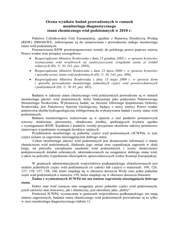 Ocena wyników badań prowadzonych w ramach monitoringu diagnostycznego stanu chemicznego wód podziemnych w 2010 r. Państwa Członkowskie Unii Europejskiej, zgodnie z Ramową Dyrektywą Wodną (RDW) 2000/60/WE, zobowiązane są do ustanowienia i prowadzenia stałego monitoringu stanu wód podziemnych. Postanowienia RDW przetransponowane zostały do polskiego prawa poprzez ustawę Prawo wodne oraz przepisy szczegółowe: Rozporządzenie Ministra Środowiska z dnia 23 grudnia 2002 r. w sprawie kryteriów wyznaczania wód wrażliwych na zanieczyszczenie związkami azotu ze źródeł rolniczych (Dz. U. Nr 241, poz. 2093), Rozporządzenie Ministra Środowiska z dnia 23 lipca 2008 r. w sprawie kryteriów i sposobu oceny stanu wód podziemnych (Dz. U. Nr 143, poz. 896), Rozporządzenie Ministra Środowiska z dnia 13 maja 2009 r. w sprawie form i sposobu prowadzenia monitoringu jednolitych części wód powierzchniowych i podziemnych (Dz. U. Nr 81, poz. 685). Badania w zakresie stanu chemicznego wód podziemnych prowadzone są w ramach monitoringu jakości wód podziemnych, który funkcjonuje jako podsystem Państwowego Monitoringu Środowiska. Wykonawcą badań, na zlecenie Głównego Inspektoratu Ochrony Środowiska, jest Państwowy Instytut Geologiczny, będący z mocy ustawy Prawo wodne państwową służbą hydrogeologiczną zobligowaną do wykonywania badań i oceny stanu wód podziemnych. Badania monitoringowe realizowane są w oparciu o sieć punktów pomiarowych (otwory studzienne, piezometry, obudowane źródła), spełniających kryteria zgodne z wymaganiami RDW. Każdemu z punktów zostały przypisane określone zakresy pomiarowe stanowiące wypełnianie wymagań dyrektyw unijnych. Przedmiotem monitoringu są jednolite części wód podziemnych (JCWPd), w tym części uznane za zagrożone nieosiągnięciem dobrego stanu. Celem monitoringu jakości wód podziemnych jest dostarczenie informacji o stanie chemicznym wód podziemnych, śledzenie jego zmian oraz sygnalizacja zagrożeń w skali kraju, na potrzeby zarządzania zasobami wód podziemnych i oceny skuteczności podejmowanych działań ochronnych, ukierunkowanych na osiągnięcie dobrego stanu wód, a także na potrzeby wypełnienia obowiązków sprawozdawczych wobec Komisji Europejskiej. W granicach administracyjnych województwa podkarpackiego zlokalizowanych jest siedem jednolitych części wód podziemnych (w całości lub części) o numerach: 109, 126, 127, 139, 157, 158, 160, które znajdują się w obszarze dorzecza Wisły oraz jedna jednolita część wód podziemnych o numerze 159, która znajduje się w obszarze dorzecza Dniestru. Żadna z wymienionych JCWPd nie ma statusu zagrożenia nieosiągnięcia dobrego stanu. Dobry stan wód oznacza stan osiągnięty przez jednolite części wód podziemnych, jeżeli zarówno stan ilościowy, jak i chemiczny, jest określony jako „dobry”. Ponieważ JCWPd, wyznaczone w granicach województwa podkarpackiego, nie mają statusu zagrożonych, badania stanu chemicznego wód podziemnych prowadzone są tu tylko w sieci monitoringu diagnostycznego (tabela 1). Tabela 1 Zestawienie punktów pomiarowych sieci monitoringu diagnostycznego wód podziemnych na terenie województwa podkarpackiego Numer jednolitej części wód podziemnych Dorzecze Lokalizacja punktów monitoringowych (numer otworu) 109 Wisły 126 Wisły 127 Wisły 139 Wisły Werchrata (1880) Mielec (84), Nowa Dęba (115), Kolbuszowa (139), Cmolas (1059) Leżajsk (85), Łysaków (88), Łysaków (89), Łysaków (1514), Pysznica (1877) Żyraków (1203), Kawęczyn Sędziszowski (1874) 157 Wisły 158 Wisły 160 Wisły 159 Dniestru Krosno (406), Kąty (2012), Brzostek (2302) Makłuczka (147), Bystre (151), Sanok (393), Radoszyce (396), Bezmiechowa Górna (1028), Trepcza (1193), Rabe (1878) Wetlina (398), Dwerniczek (399) Ustrzyki Dolne (1195) Badania laboratoryjne próbek wody, pobranych w 2010 r., w punktach pomiarowych monitoringu jakości wód podziemnych, wykonało Centralne Laboratorium Chemiczne Państwowego Instytutu Geologicznego w Warszawie. Ocena jakości wód podziemnych, dokonana w oparciu o uzyskane wyniki badań, przedstawia nieco odmienny obraz w stosunku do wyników wcześniejszych ocen z uwagi na fakt, że krajowa sieć pomiarowa monitoringu jakości wód podziemnych uległa modyfikacji pod kątem dostosowania do wymagań RDW oraz z uwagi na zmianę sposobu klasyfikacji jakości wód podziemnych. Podstawą oceny stanu chemicznego wód jest Rozporządzenie Ministra Środowiska z dnia 23 lipca 2008 r. w sprawie kryteriów i sposobu oceny stanu wód podziemnych. Z badań jakości wód podziemnych wykonanych w 2010 r. wynika, że w 64% badanych punktów stwierdzono dobry stan chemiczny wód podziemnych (klasa I, II, III), natomiast 36% punktów charakteryzowało się słabym stanem chemicznym (klasa IV, V). W związku z wdrożeniem nowego systemu monitoringu i klasyfikacji wód, niemożliwe jest dokonanie porównań z wynikami ocen jakości z lat wcześniejszych. W zmodyfikowanej krajowej sieci pomiarowej monitoringu wód podziemnych, w 2010 r. na terenie województwa podkarpackiego kontrolą objęte zostały nowe punkty pomiarowe: Cmolas (1059), Trepcza (1193), Ustrzyki Dolne (1195), Żyraków (1203), Brzostek (2302) oraz zawieszone zostały badania w następujących punktach: Ropczyce (86), Łańcut (90), Stalowa Wola (94), Brzeżanka (145), Bircza (148), Przemyśl (757), Rzeszów (758), Lesko (1875), Potok (1876), Strzyżów (1879). Większość punktów pomiarowych sieci monitoringowej województwa podkarpackiego znajduje się w obszarze jednolitych części wód podziemnych, zlokalizowanych na terenie administrowanym przez RZGW Kraków, tylko jeden punkt (Werchrata) znajduje się na terenie RZGW Warszawa. Równolegle do klasyfikacji jakości wód podziemnych, przeprowadzanej na podstawie rozporządzenia MŚ w sprawie kryteriów i sposobu oceny stanu wód podziemnych, wykonywano również ocenę jakości wód po