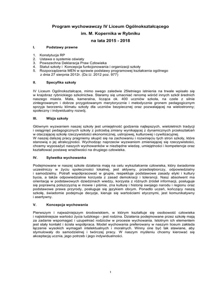 Program wychowawczy IV Liceum Ogólnokształcącego im. M. Kopernika w Rybniku na lata 2015 - 2018 I. 1. 2. 3. 4. 5. II. Podstawy prawne Konstytucja RP Ustawa o systemie oświaty Powszechna Deklaracja Praw Człowieka Statut szkoły i Koncepcja funkcjonowania i organizacji szkoły Rozporządzenia MEN w sprawie podstawy programowej kształcenia ogólnego z dnia 27 sierpnia 2012r. (Dz.U. 2012 poz. 977) Specyfika szkoły IV Liceum Ogólnokształcące, mimo swego zaledwie 25letniego istnienia na trwale wpisało się w krajobraz rybnickiego szkolnictwa. Staramy się umacniać renomę wśród innych szkół średnich naszego miasta. Mała, kameralna, licząca ok. 400 uczniów szkoła, na czele z silnie zintegrowanym i dobrze przygotowanym merytorycznie i metodycznie gronem pedagogicznym sprzyja tworzeniu klimatu szkoły dla uczniów bezpiecznej oraz pozwalającej na wielostronny; społeczny i indywidualny rozwój. III. Wizja szkoły Głównym wyzwaniem naszej szkoły jest umiejętność godzenia najlepszych, wieloletnich tradycji i osiągnięć pedagogicznych szkoły z potrzebą zmiany wynikającej z dynamicznych przekształceń w otaczającej szkołę rzeczywistości ekonomicznej, ustrojowej, kulturowej i cywilizacyjnej. W naszej dalszej pracy pragniemy skupić się na zachowaniu i rozwinięciu tych stron szkoły, które stanowią o jej atrakcyjności. Wychodząc naprzeciw wyzwaniom zmieniającej się rzeczywistości, chcemy wyposażyć naszych wychowanków w niezbędne wiedzę, umiejętności i kompetencje oraz kształtować postawę wrażliwości na drugiego człowieka. IV. Sylwetka wychowanka Podejmowane w naszej szkole działania mają na celu wykształcenie człowieka, który świadomie uczestniczy w życiu społeczności lokalnej, jest aktywny, przedsiębiorczy, odpowiedzialny i samodzielny. Potrafi współpracować w grupie, respektuje podstawowe zasady etyki i kultury bycia, a także odpowiedzialnie korzysta z zasad demokracji i tolerancji. Nasz absolwent ma orientację w podstawowych dziedzinach wiedzy, korzysta z różnych źródeł informacji, posługuje się poprawną polszczyzną w mowie i piśmie, zna kulturę i historię swojego narodu i regionu oraz podstawowe prawa przyrody, posługuje się językiem obcym. Ponadto uczeń, kończący naszą szkołę, świadomie podejmuje decyzje, kieruje się wartościami etycznymi, jest komunikatywny i asertywny. V. Koncepcja wychowania Pierwszym i najważniejszym środowiskiem, w którym kształtuje się osobowość człowieka i najistotniejsze wartości życia ludzkiego - jest rodzina. Działania podejmowane przez szkołę mają za zadanie wspomagać i uzupełniać rodziców w procesie wychowania. Istotnym ich elementem jest stały kontakt i ścisła współpraca. Model wychowania preferowany w naszym liceum zakłada łączenie wysokich wymagań intelektualnych i moralnych. Winny one być tak stawiane, aby stymulowały do samodzielnej i twórczej pracy. W naszym myśleniu chcemy kierować się akceptacją ucznia, jego potrzeb i jego indywidualności. 1 VI. Cele i zadania wychowawcze II. Współpraca szkoły z rodzicami I. Integracja środowiska szkolnego Cele główne Cele szczegółowe Zadania do realizacji Zespół klasowy jest zintegrowaną społecznością • • Zajęcia integracyjne w klasach pierwszych Wycieczki integracyjne, akcje organizowane przez klasę (wigilia, wspólne wyjścia na imprezy kulturalne, happeningi związane z promocja zdrowia) Uczniowie szkoły tworzą zintegrowaną grupę • Nieformalne przyjęcie uczniów klas pierwszych do grona licealistów podczas tzw. „Otrzęsin” Tworzenie tradycji szkolnej poprzez cykliczność imprez i uroczystości zgodnie z kalendarzem Włączenie w działania promocyjne szkoły (udział w Targach Edukacyjnych, Dzień Otwarty, wyjścia do gimnazjów) • • Rodzice mają wpływ na proces wychowawczy szkoły • • • • • • • III. Kształtowanie wszechstronnie rozwiniętego wrażliwego młodego człowieka • Uczniowie dbają o kulturę osobistą w swoim zachowaniu i sposobie bycia • • • • Środowisko rodzinne ucznia jest zdiagnozowane • • Uczniowie są wrażliwi na trudności i niepowodzenia innych • • Współtworzenie z rodzicami programu wychowawczego oraz programu profilaktyki szkoły Zapoznanie rodziców ze Statutem Szkoły, Wewnątrzszkolnym Ocenianiem oraz innymi dokumentami, Pedagogizacja rodziców Umożliwienie rodzicom wglądu w dokumentację szkoły oraz śledzenie postępów dziecka w nauce (wgląd w prace pisemne), Ustalenie sposobu indywidualnych kontaktów rodziców z nauczycielami Włączanie rodziców w życie szkoły – uroczystości szkolne, wycieczki, itp. Udzielanie pomocy rodzicom w zakresie poradnictwa wychowawczego, Ścisła współpraca z rodzicami uczniów objętych SPE Wprowadzenie i upowszechnianie szkolnego „savoirvivre” czyli nawyków człowieka z klasą Częste podejmowanie tej problematyki na lekcjach wychowawczych Wzajemne uczenie się dobrego smaku i stylu, wyrabianie wrażliwości estetycznej Dbanie o kulturę języka i wypowiedzi Diagnoza sytuacji opiekuńczo-wychowawczej i rodzinnej ucznia (propagowanie akcji „Wyprawka szkolna” i „Stypendium Szkolne” Pomoc w sytuacjach kryzysowych, pomoc w kierowaniu do odpowiednich placówek i instytucji Wyrabianie umiejętności współpracy w zespole – pomoc koleżeńska Wspieranie uczniów niepełnosprawnych w szkole, angażowanie ich w życie klasy i szkoły, organizowanie pomocy koleżeńskiej 2 • • • Uczeń potrafi dokonywać wyborów i podejmować decyzje • • • Propagowanie idei wolontariatu wśród uczniów – stała współpraca z MOSiR-em w Rybniku Udział i organizacja imprez charytatywnych przez szkolne koło PCK oraz samorząd uczniowski Współpraca z przedstawicielami środowiska lokalnego, Kościoła oraz instytucjami o charakterze opiekuńczo-wychowawczym; Problematyka lekcji wychowawczych oparta na założeniach programu profilaktyki Podej