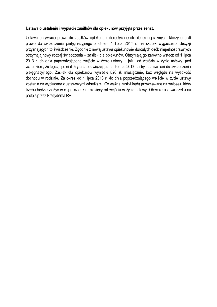 Ustawa o ustaleniu i wypłacie zasiłków dla opiekunów przyjęta przez senat. Ustawa przywraca prawo do zasiłków opiekunom dorosłych osób niepełnosprawnych, którzy utracili prawo do świadczenia pielęgnacyjnego z dniem 1 lipca 2014 r. na skutek wygaszenia decyzji przyznających to świadczenie. Zgodnie z nową ustawą opiekunowie dorosłych osób niepełnosprawnych otrzymają nowy rodzaj świadczenia – zasiłek dla opiekunów. Otrzymają go zarówno wstecz od 1 lipca 2013 r. do dnia poprzedzającego wejście w życie ustawy – jak i od wejścia w życie ustawy, pod warunkiem, że będą spełniali kryteria obowiązujące na koniec 2012 r. i byli uprawnieni do świadczenia pielęgnacyjnego. Zasiłek dla opiekunów wyniesie 520 zł. miesięcznie, bez względu na wysokość dochodu w rodzinie. Za okres od 1 lipca 2013 r. do dnia poprzedzającego wejście w życie ustawy zostanie on wypłacony z ustawowymi odsetkami. Co ważne zasiłki będą przyznawane na wniosek, który trzeba będzie złożyć w ciągu czterech miesięcy od wejścia w życie ustawy. Obecnie ustawa czeka na podpis przez Prezydenta RP.